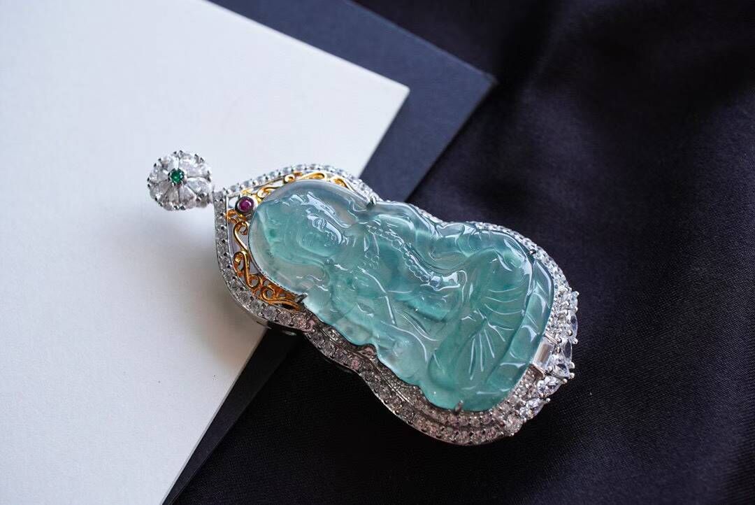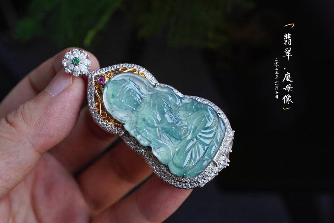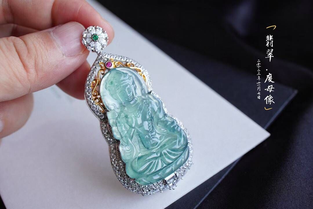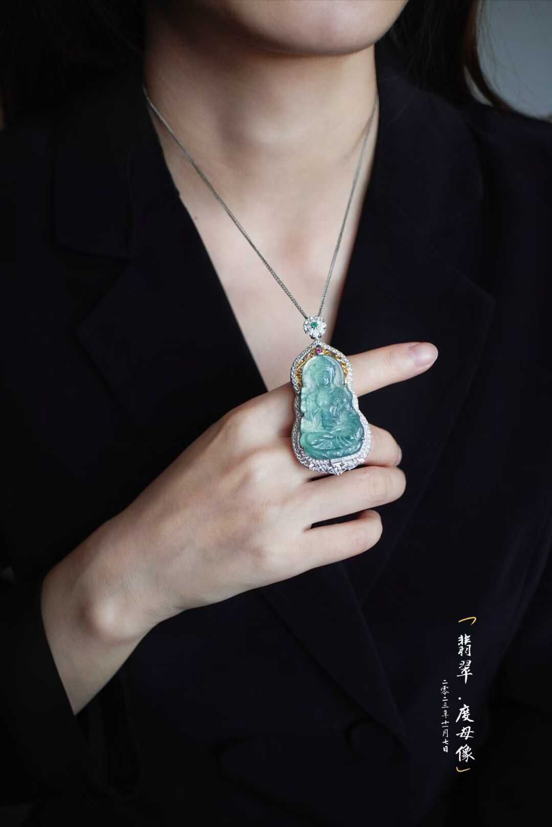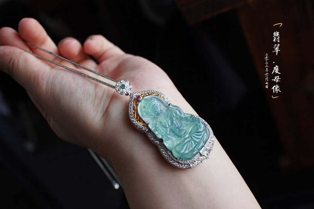 一滴觀音淚,化身綠度母。相傳綠度母是大唐文成公主的化身是所有女性的保護神,庇佑女性聰穎、美麗、幸福。老闆娘也在戴的一件,冰藍水,精工雕琢,開臉柔美端莊,擁有讓人心安的力量。