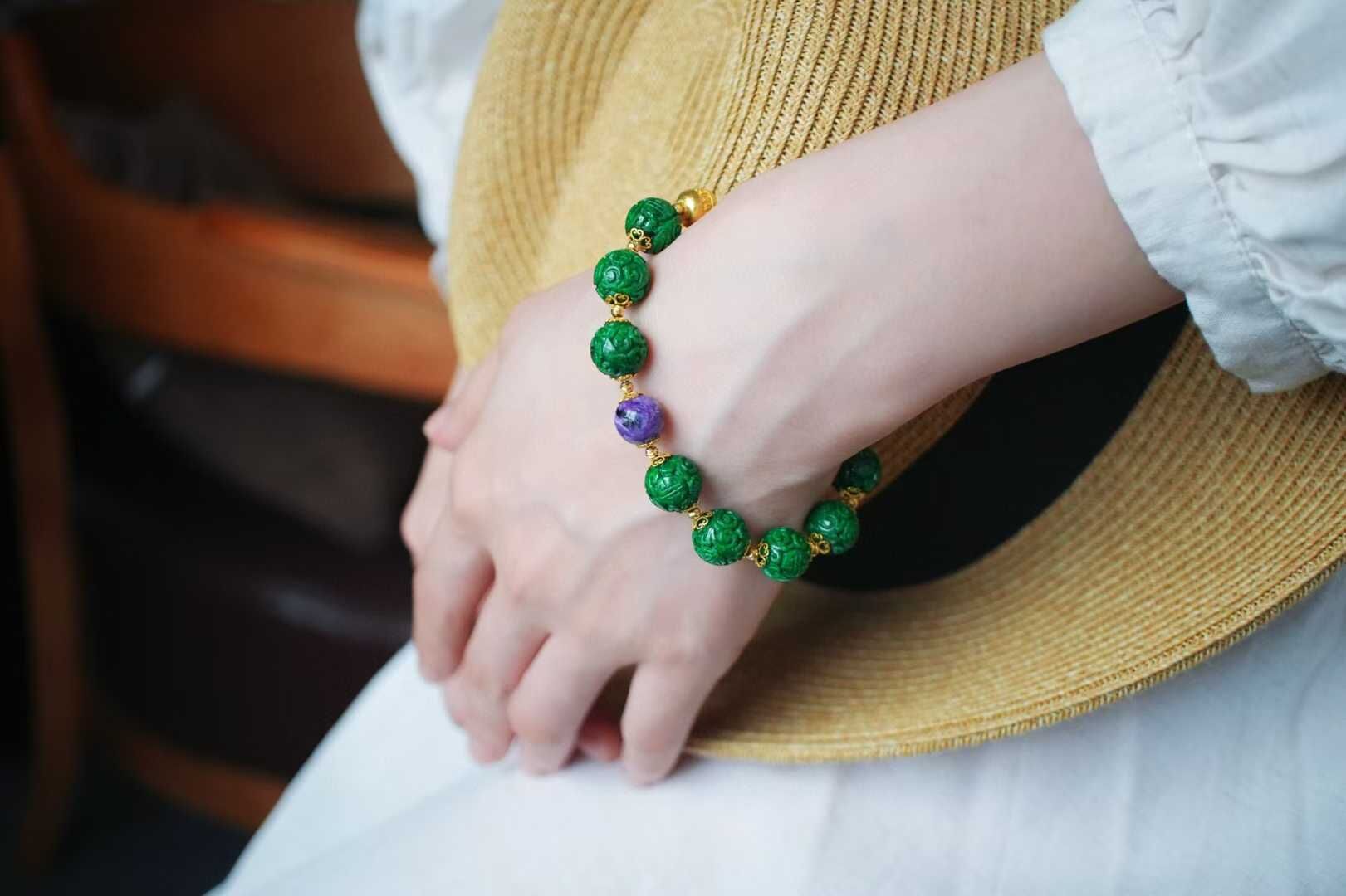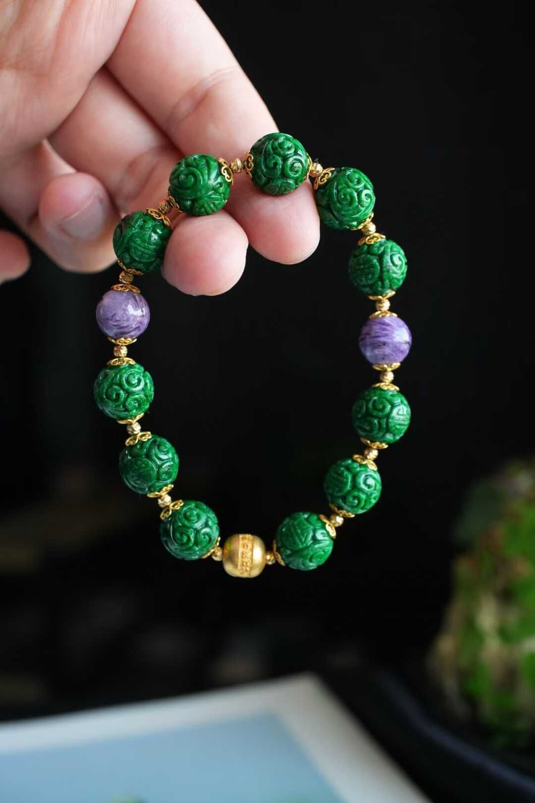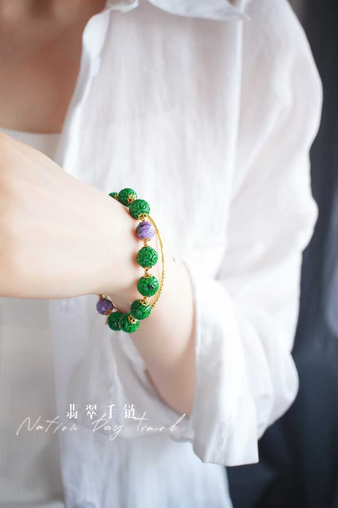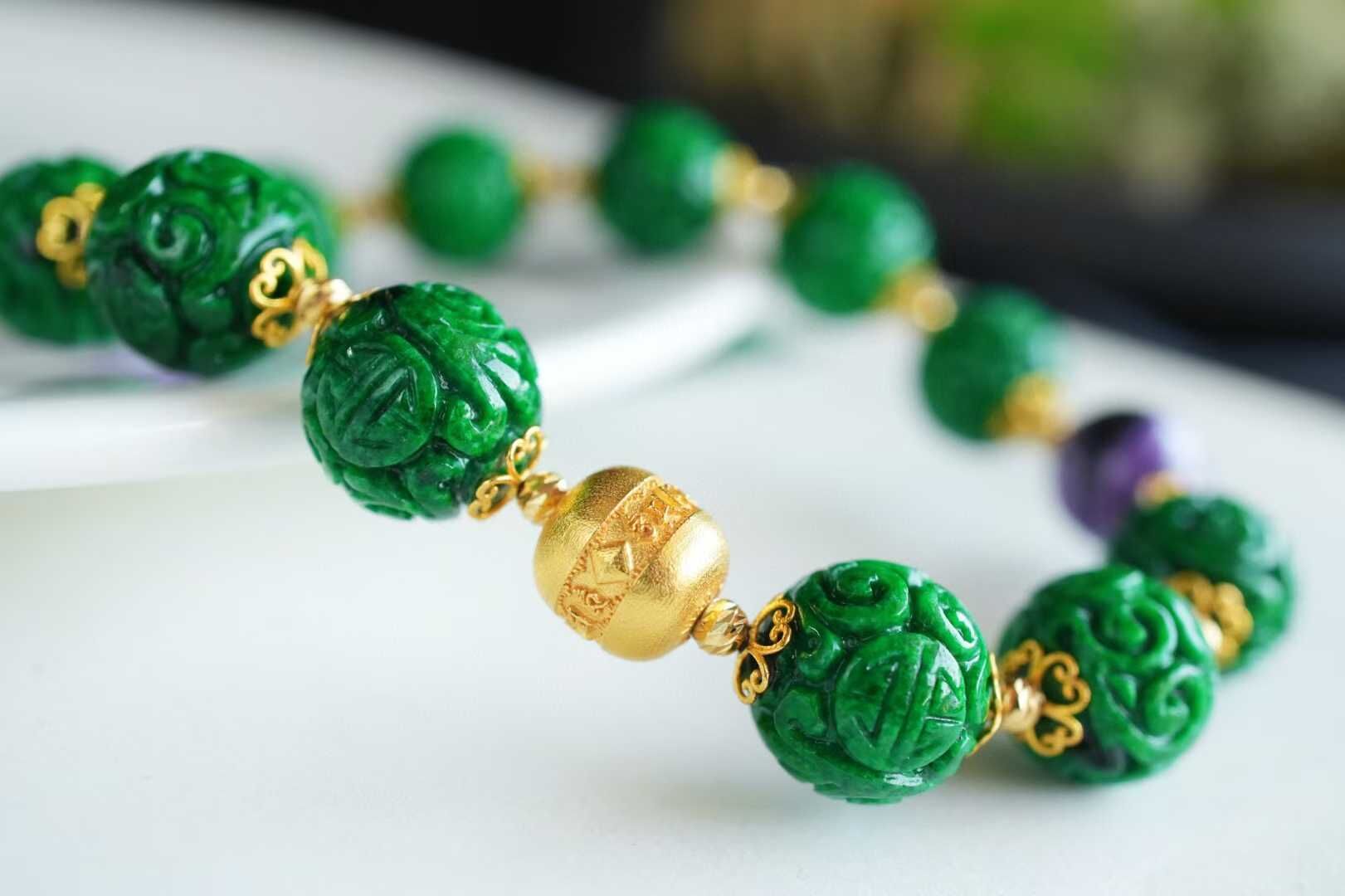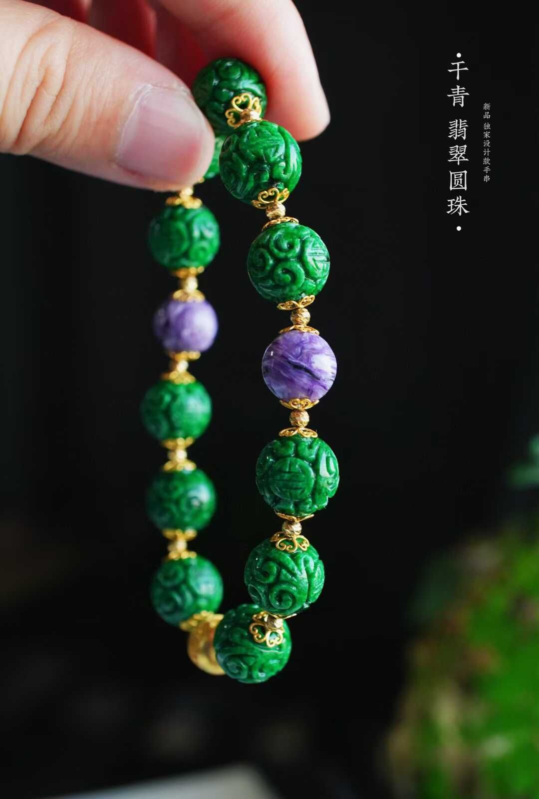 人間富貴花,極致的中式美學!天然翡翠A玉,乾青翡翠精雕桶珠,色澤鮮艷青翠,濃郁的綠太有韻味,幾乎無露白,幾乎無黑雜,品相極佳!乾青呈現了翡翠最本真的模樣,將明艷和醇厚完美融合,它獨有的天然紋理,猶如把山川湖海的故事戴在身上。