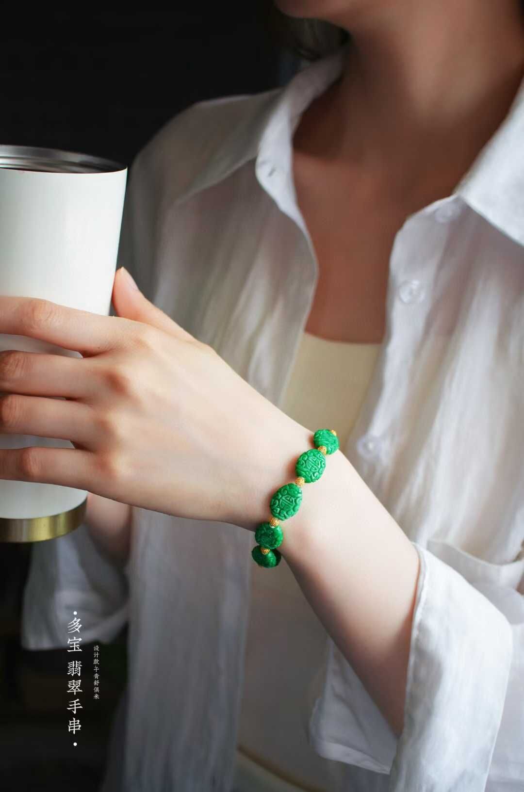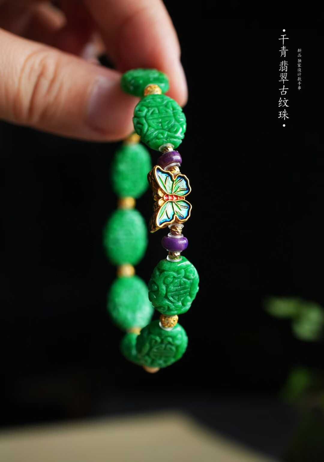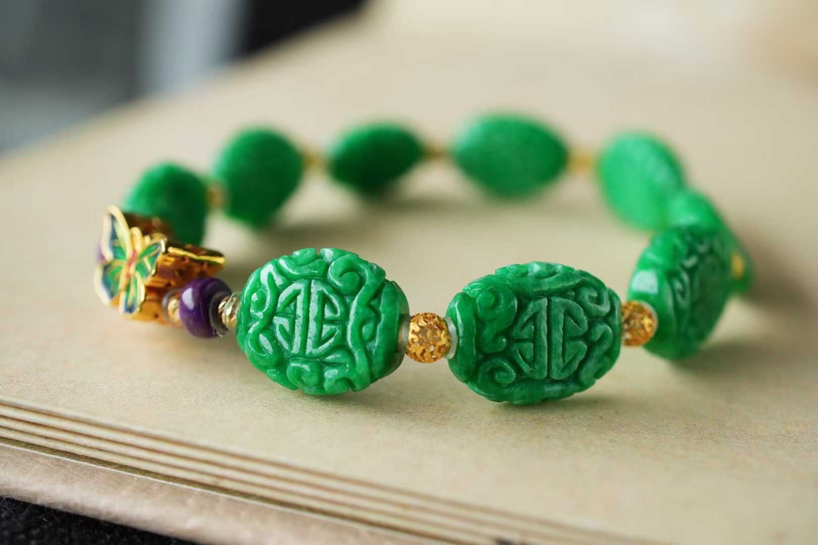 以現在金價飆升狀態來看,這條下次再發就要調價了,整條重金的!成本高了很多了第一次遇到這麼鮮陽、這麼水潤的翡翠乾青料精工雕刻,古典纏枝團壽紋,寓意健康長壽和幸福。
