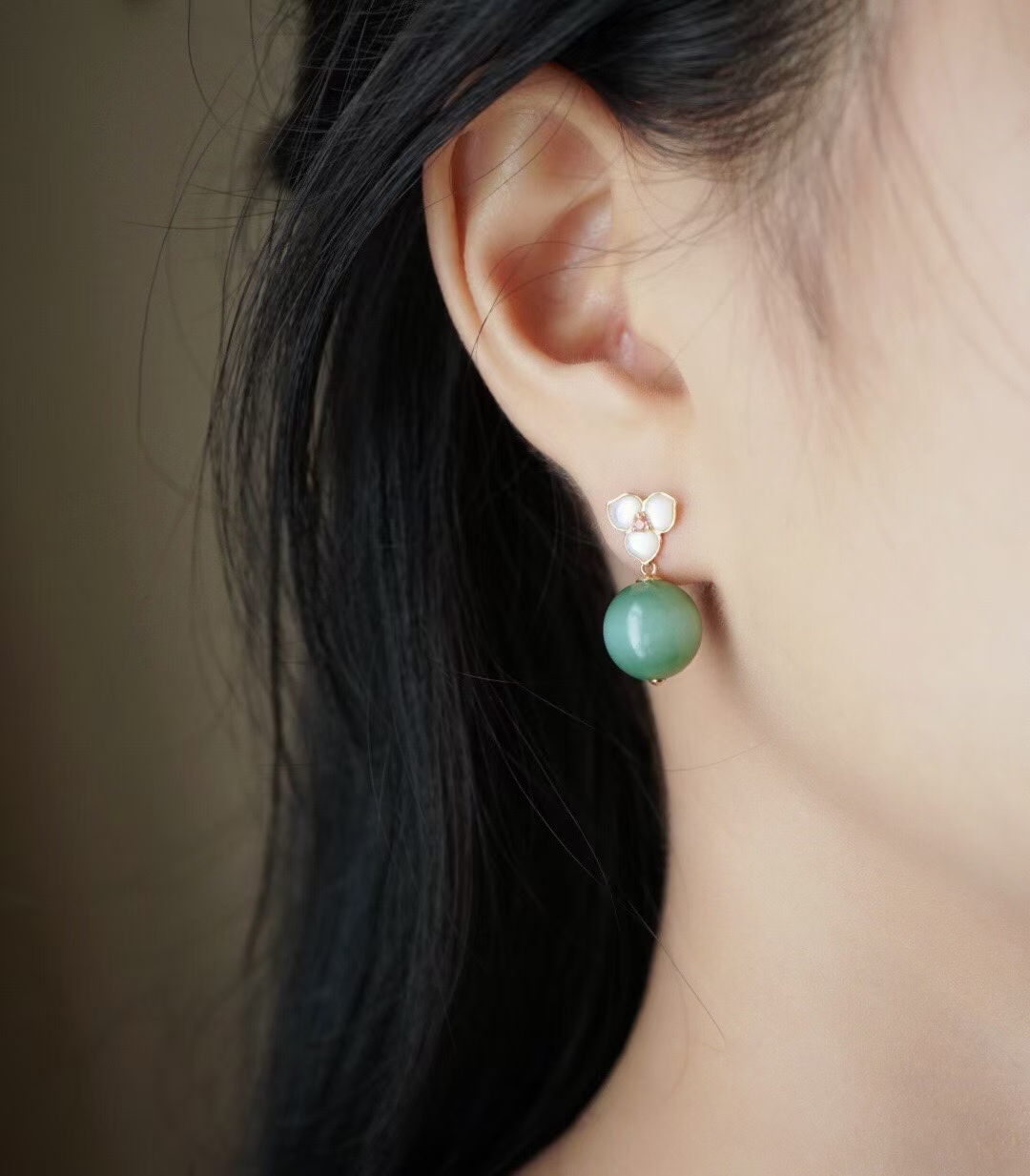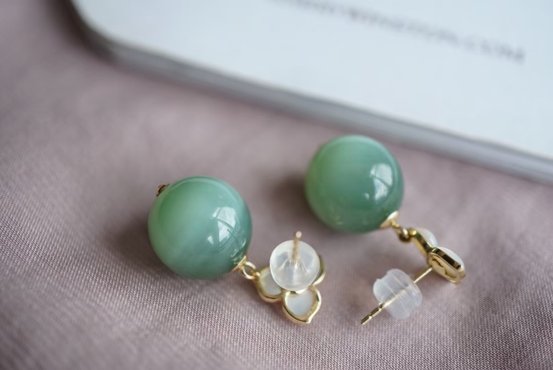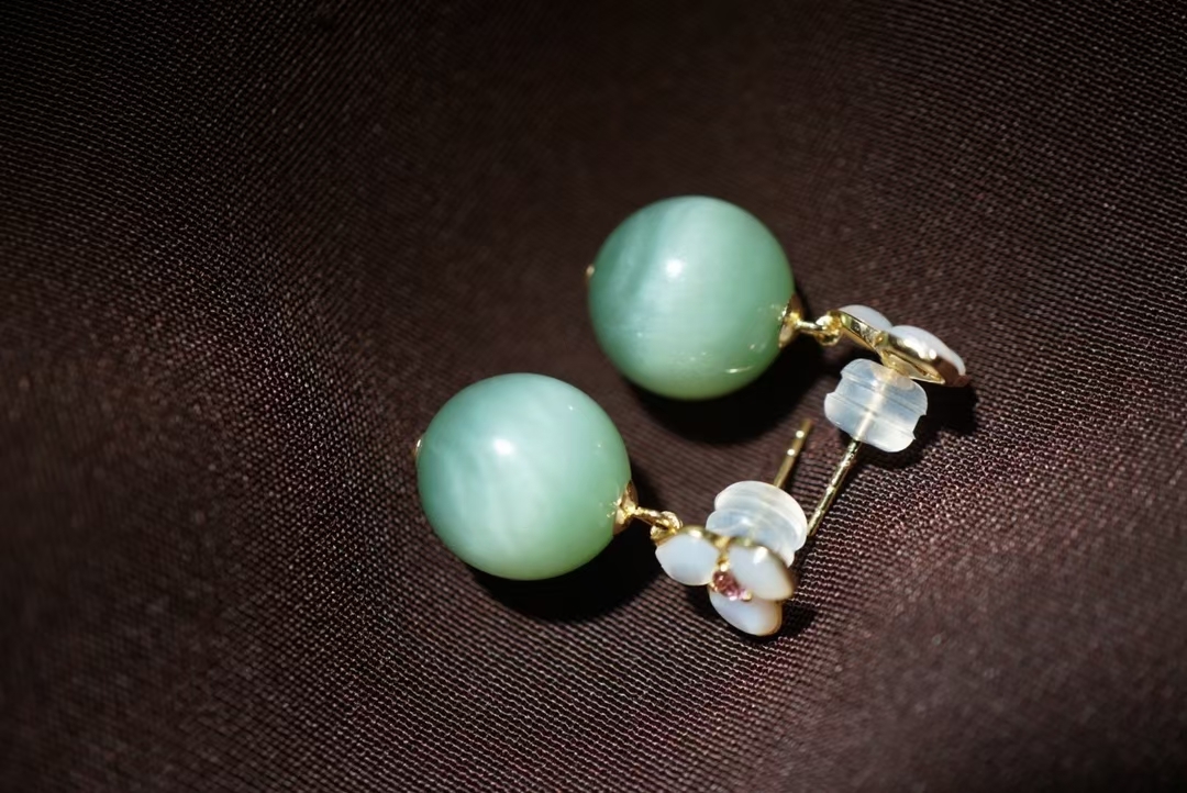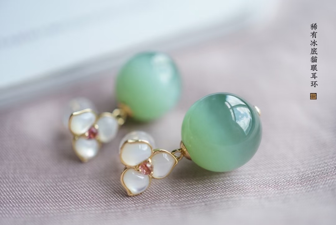 9441 和田玉碧玉粉青貓眼“瑤臺月露”耳環和吊墜