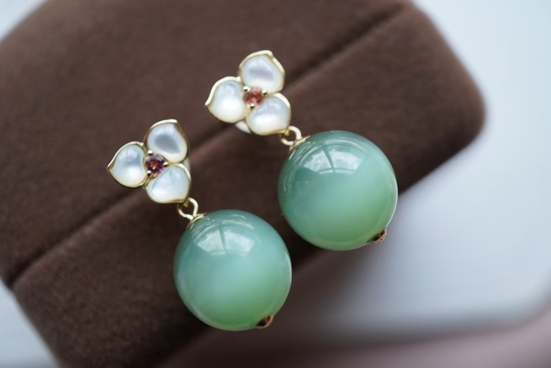 • 和田玉-碧玉粉青貓眼“瑤臺月露”耳環和吊墜, 天然和田玉軟玉