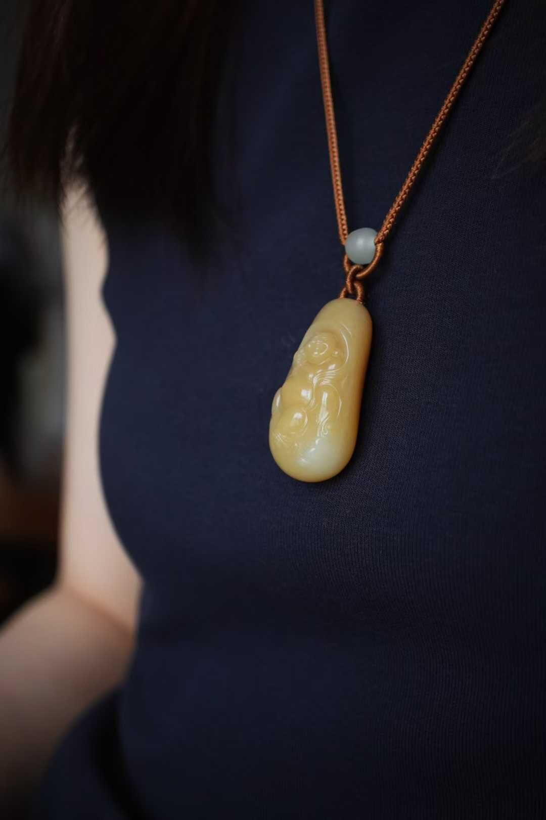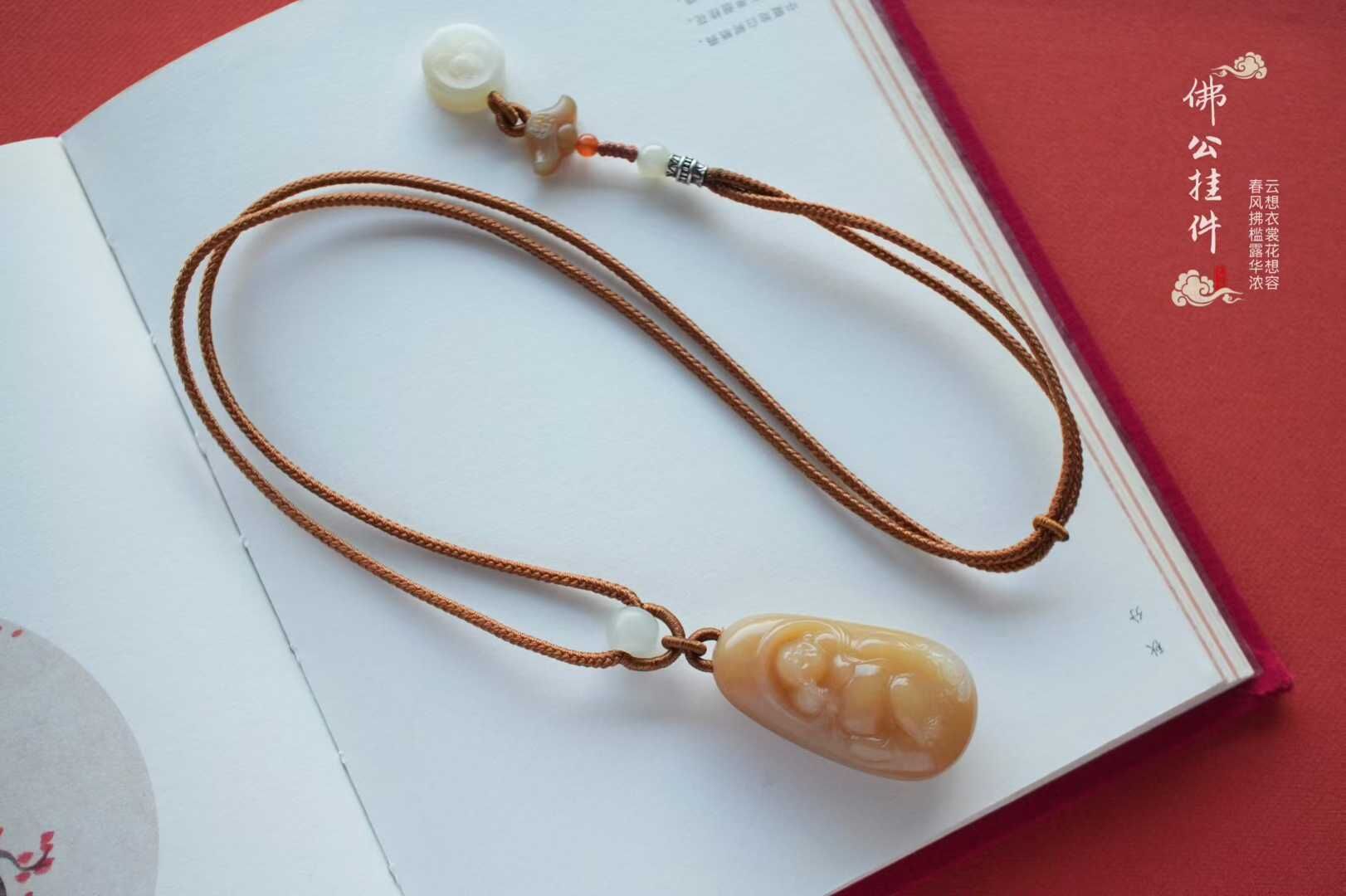 純手工編織進口繩,糖白雙面花牌作純糖元寶福牌作背雲,和田玉路路通、純銀小配點綴,簡約大氣。