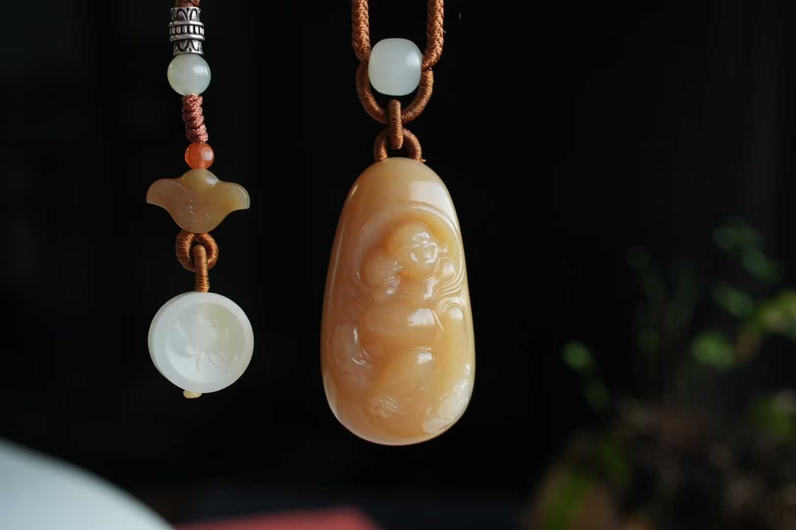 • 和田玉且末糖白料“花開見佛”彌勒佛掛件,天然和田玉軟玉