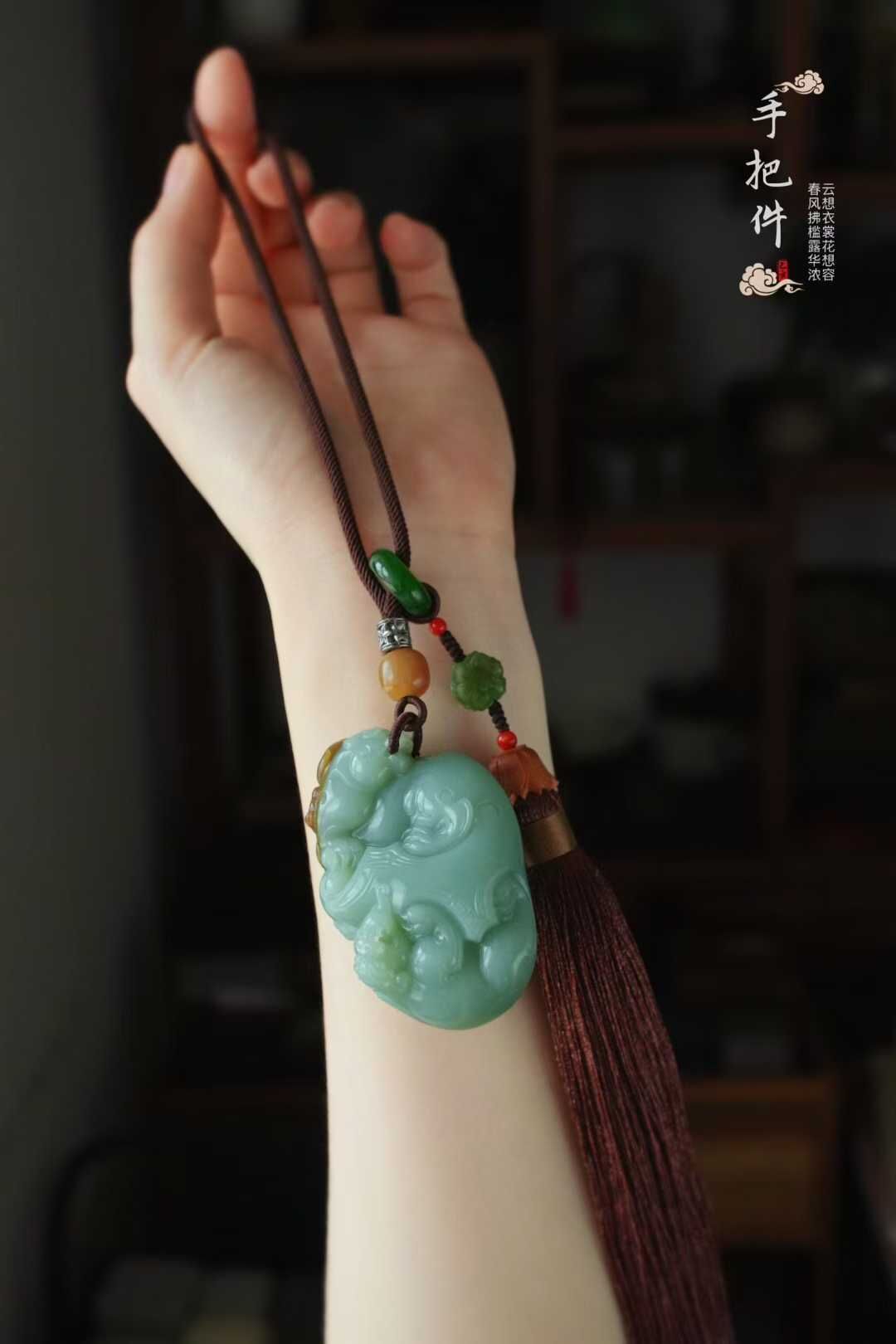 搭配純手工製作繩、純手工編織流蘇,點綴和田玉雙面蓮花牌、碧玉平安環、糖料老型珠、珊瑚圓珠,上手大氣儒雅。