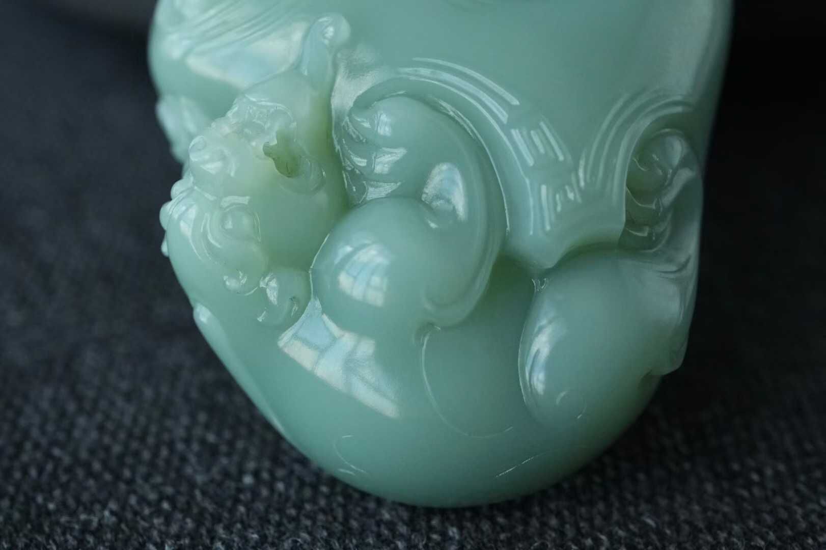 高密度細料,高級宋氏雅韻色調,不灰不暗,帶俏色巧雕,料子凝實渾厚,玉質細膩油性十足,壓手感沉甸甸的像握著塊凝脂,自然光下泛著幽幽藍光,盤玩時彷佛脂膏般的油潤從肌理滲出,堪稱粉青中的羊脂玉!