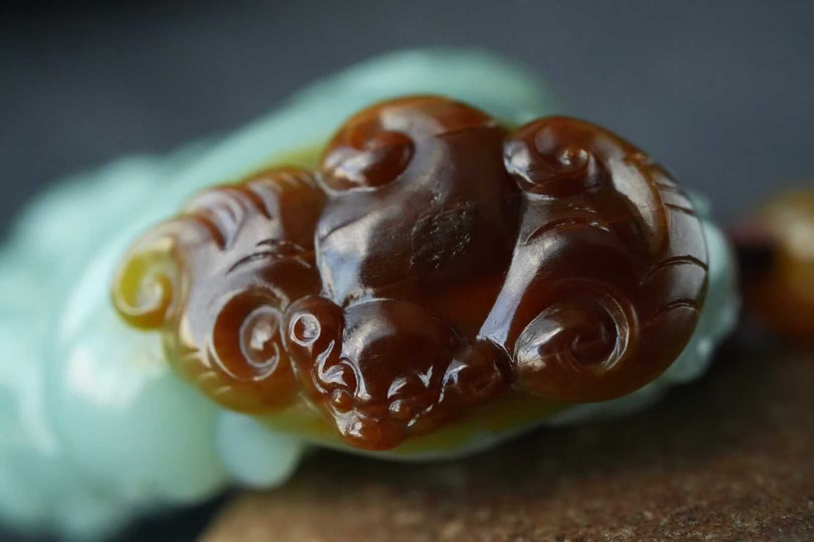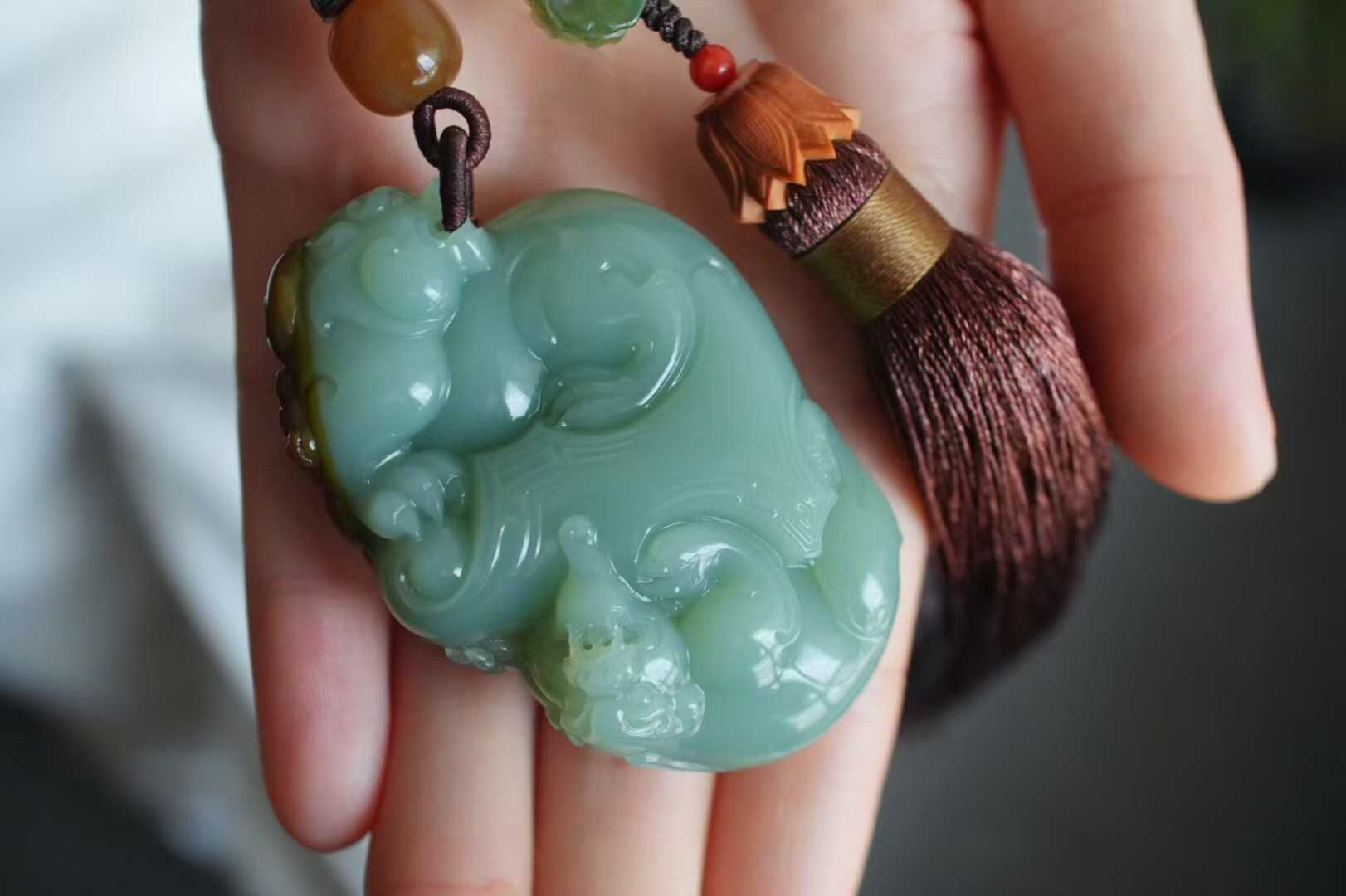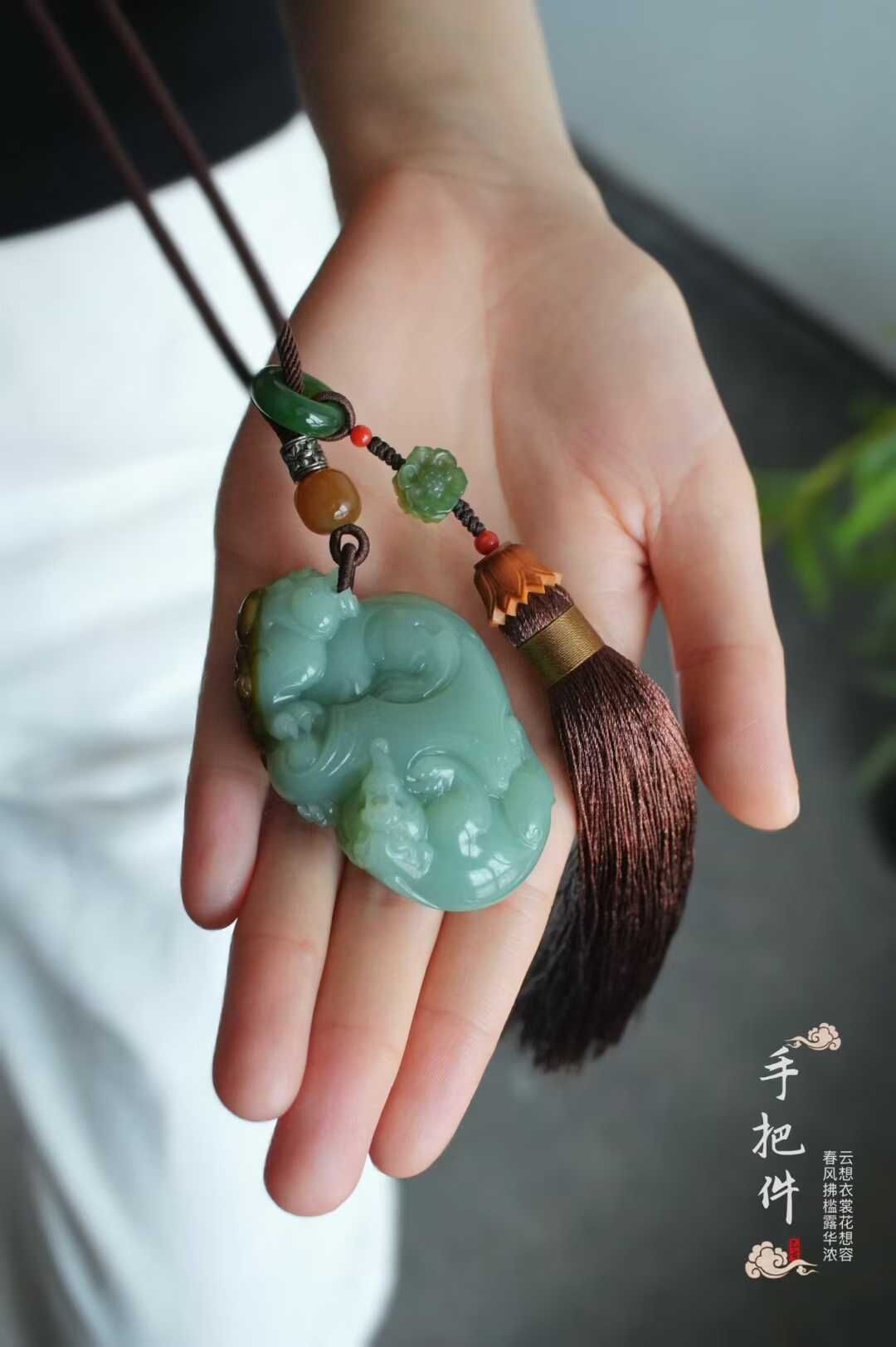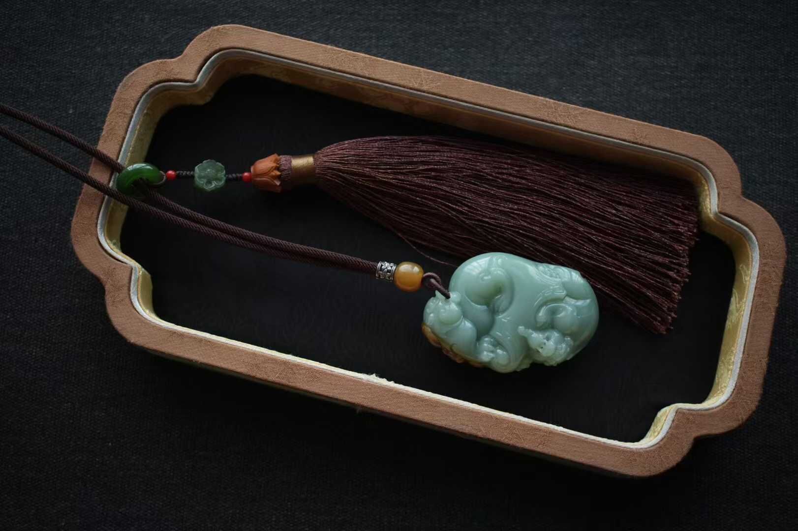 貔貅常見而雙子貔貅少有,粉青帶原皮掛件更是難得,厚裝的原料立體飽滿握手裡有質感,寓意上方招財下方守。