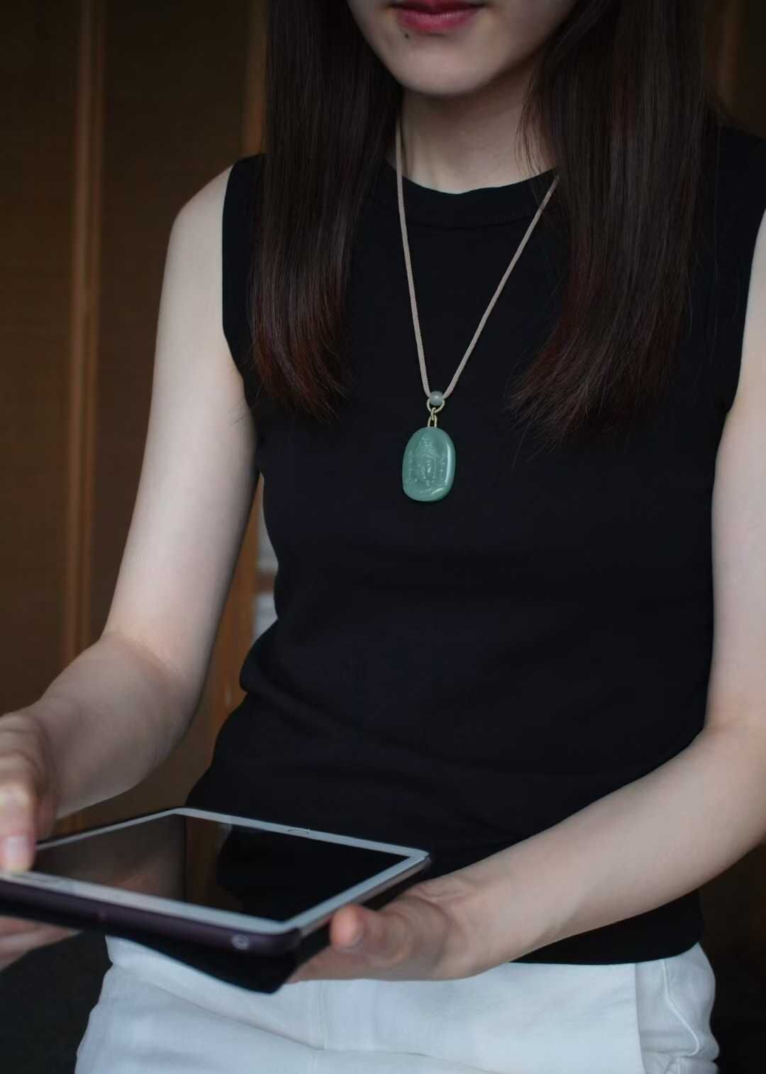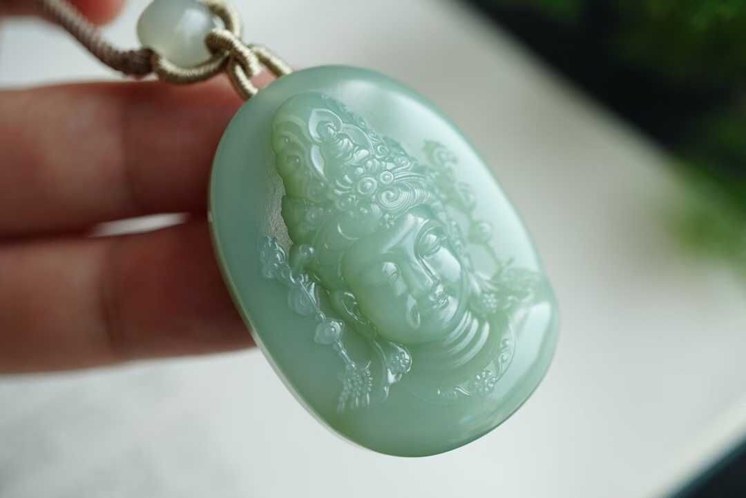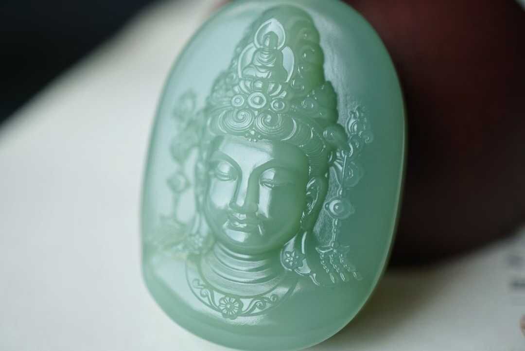 • 和田玉稀有瓷藍底粉青“度母觀音”掛件,天然和田玉軟玉