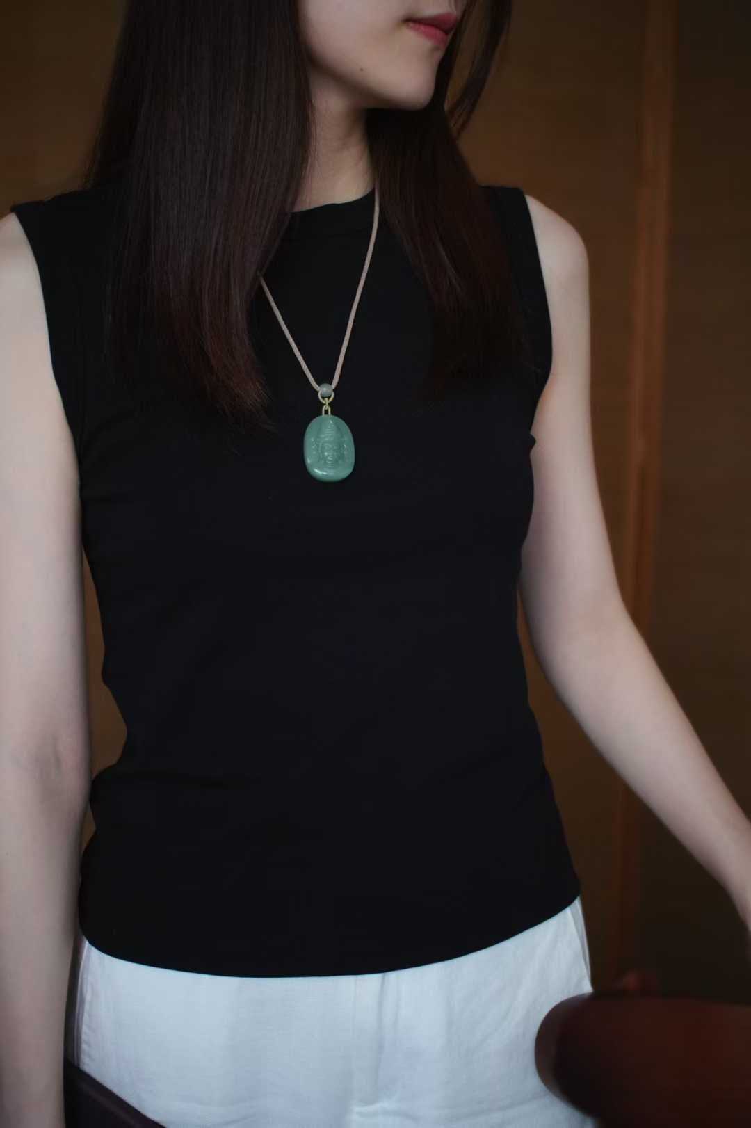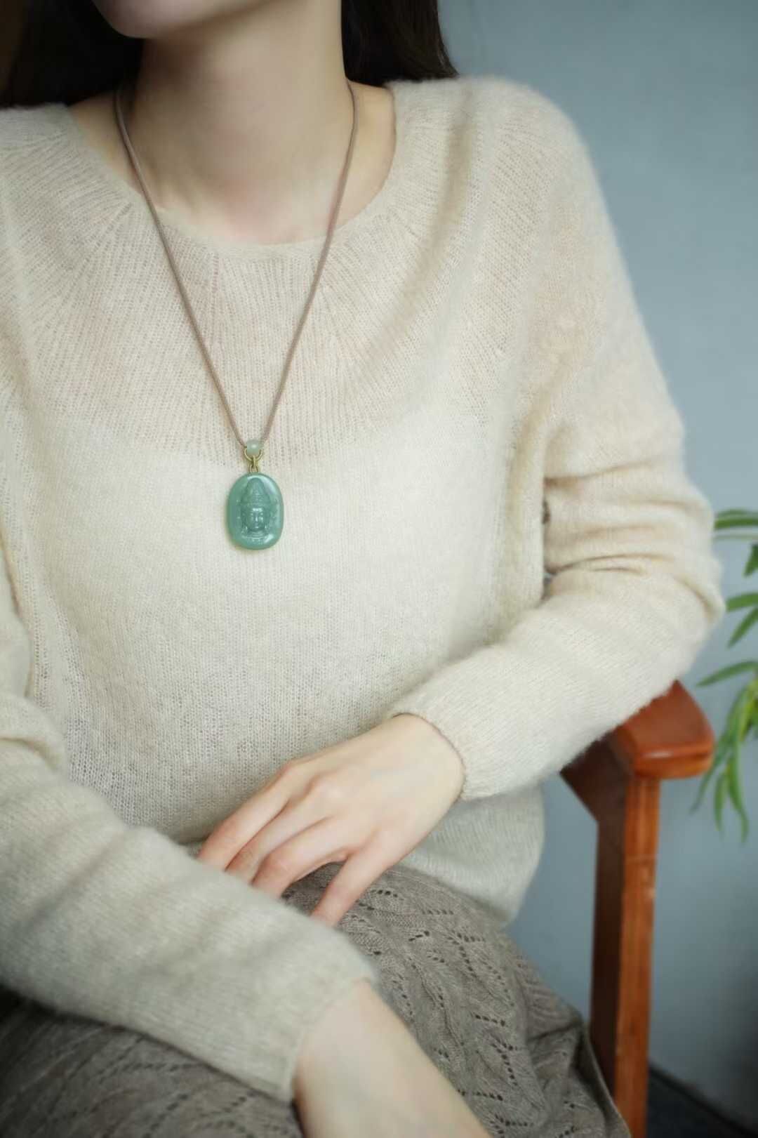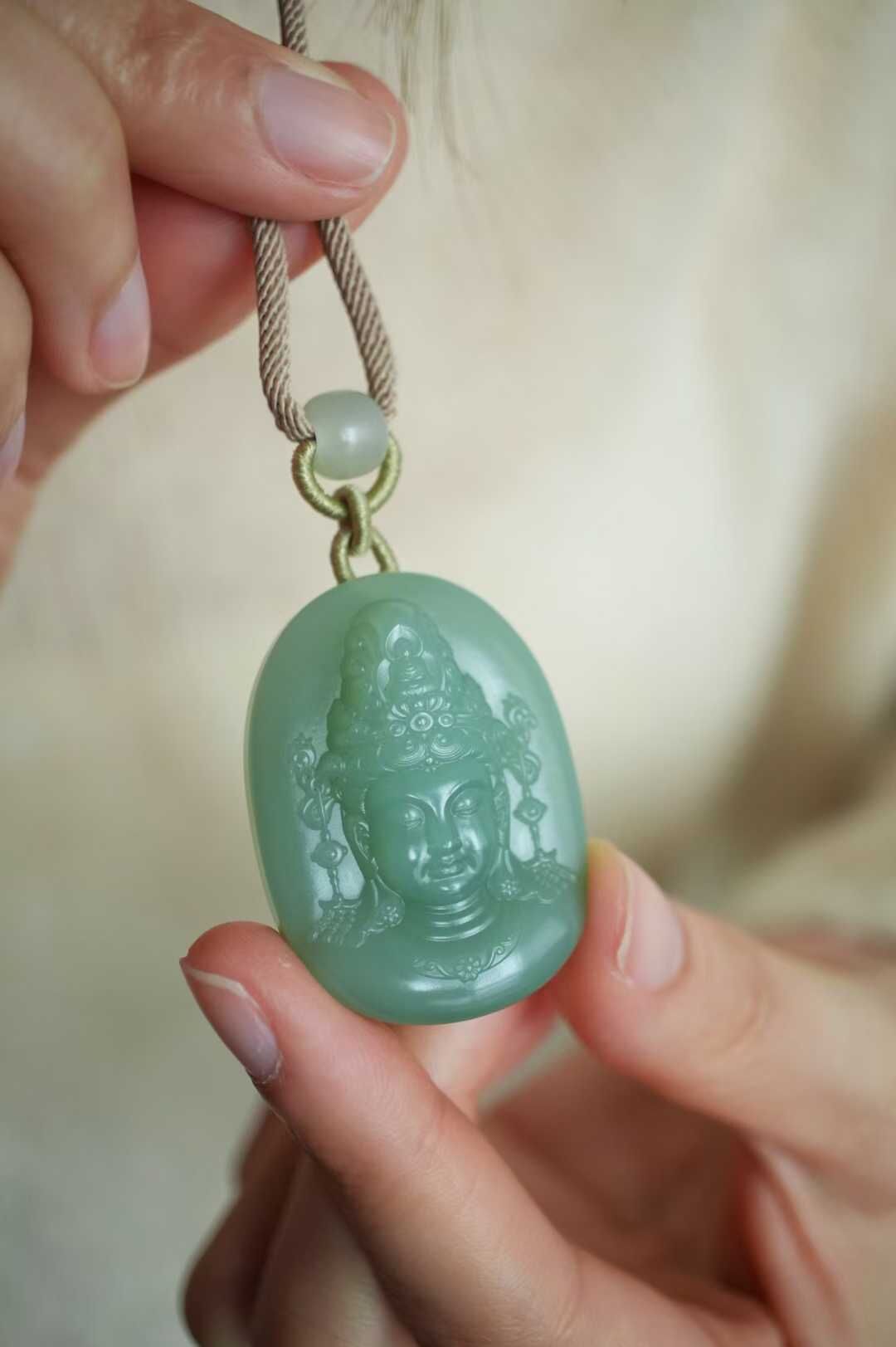 牌型厚實飽滿,正面蘇工純手工立體精雕度母一尊,現慈悲相,頭戴花蔓寶冠,烏發挽髻,雙耳墜著大環,穿麗質天衣,雕刻立體生動線條流暢,五官細節纖微畢現,背面雕刻六字箴言,白度母,也叫“妙音天女”,代表能去除災難,免除一切魔障病苦,凡有所求無不如願。