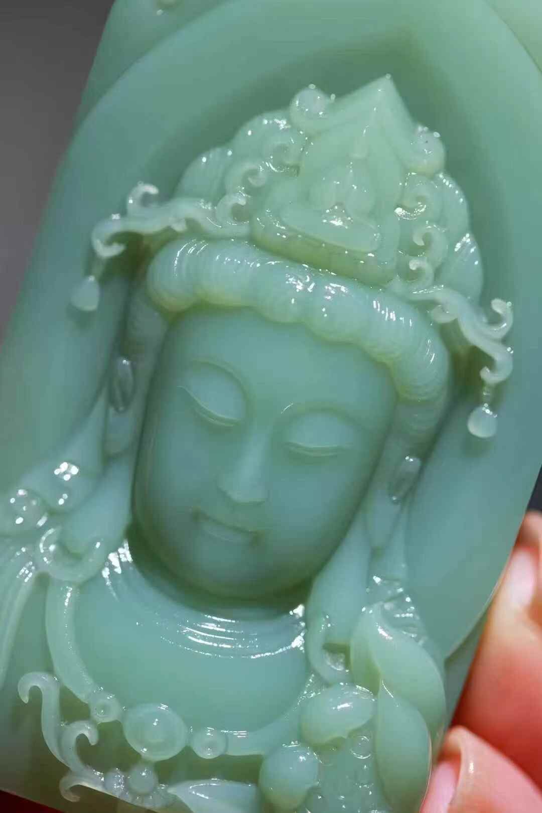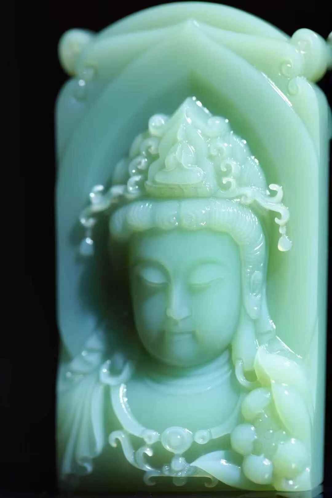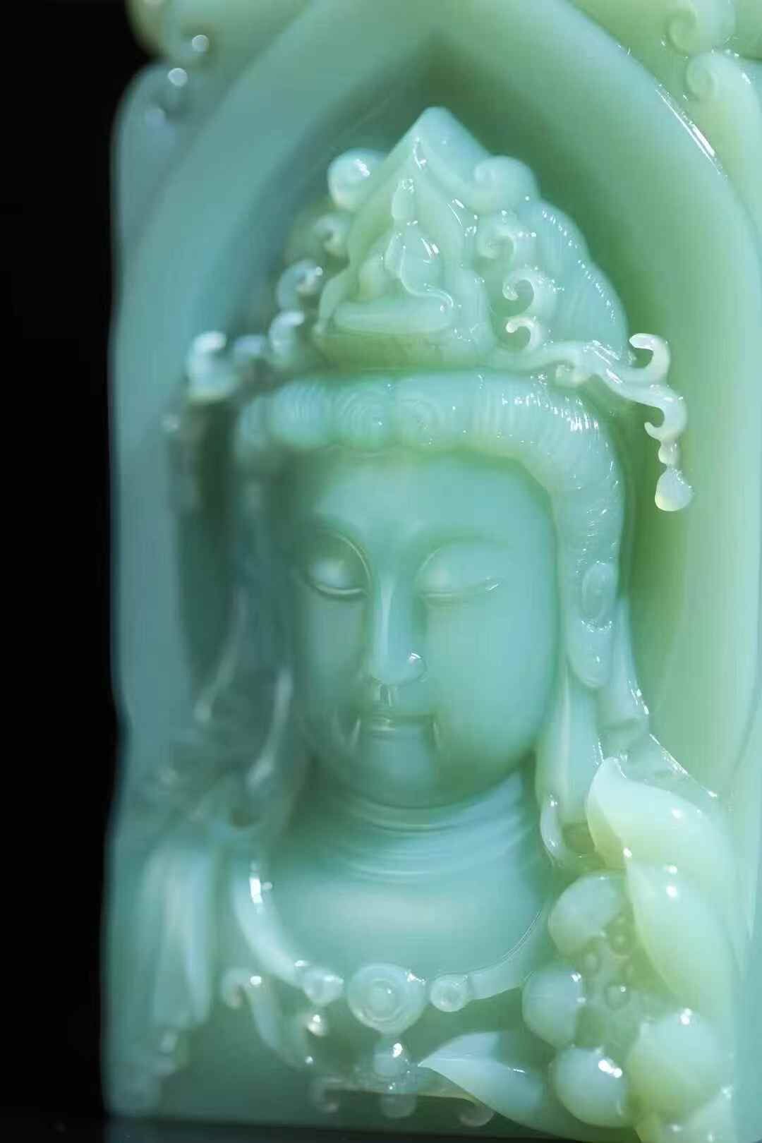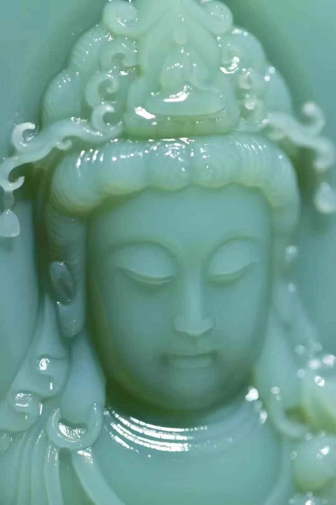 精雕觀音慈目含笑,恬靜淡然,神意自若,畫面簡潔素雅,作品氣韻傳神。使人望之心安,戴之心定。
