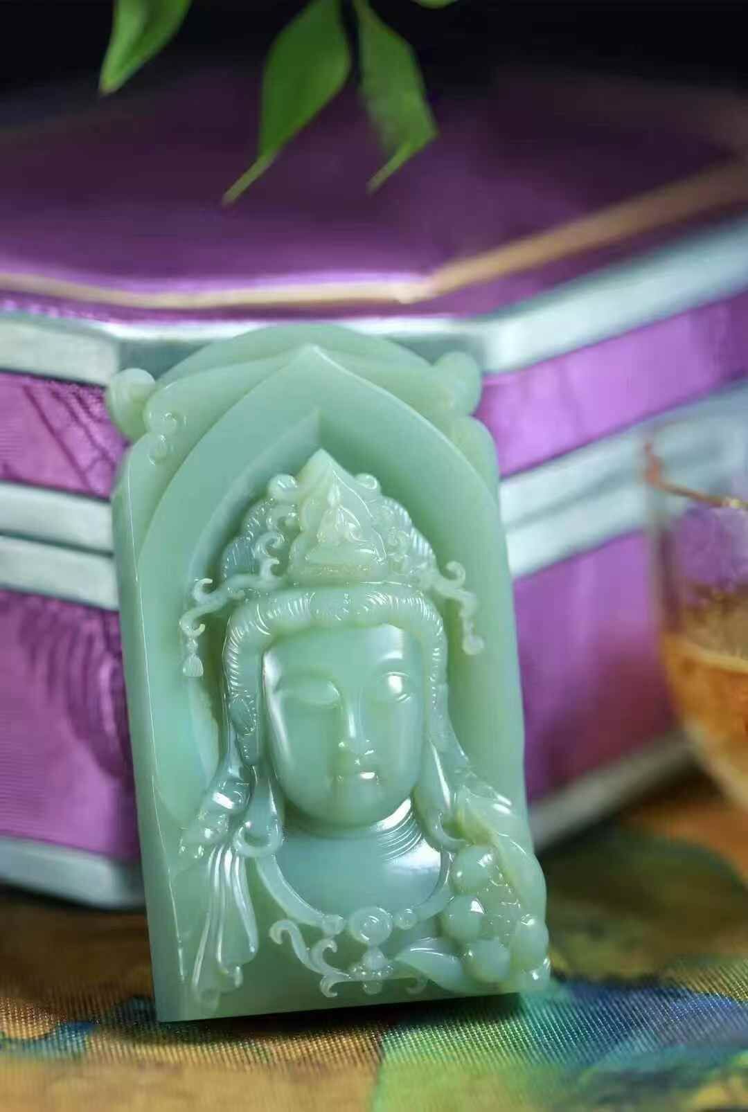 • 和田玉粉青觀音牌,天然和田玉軟玉