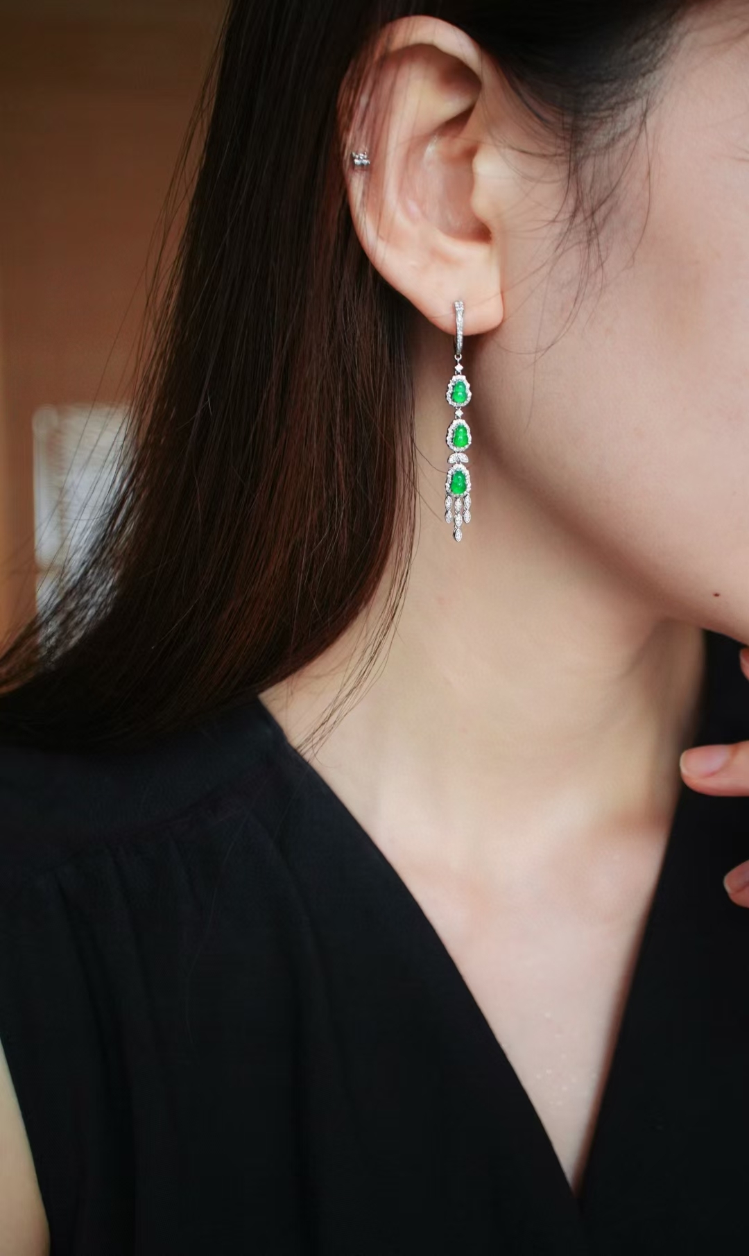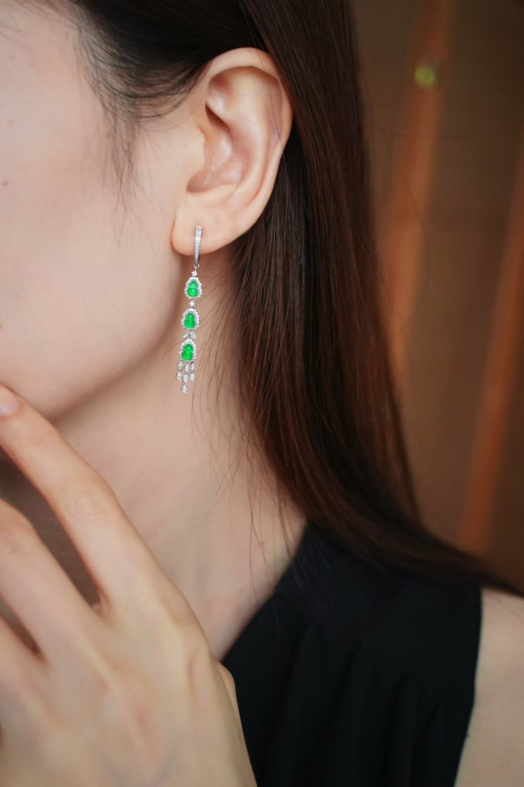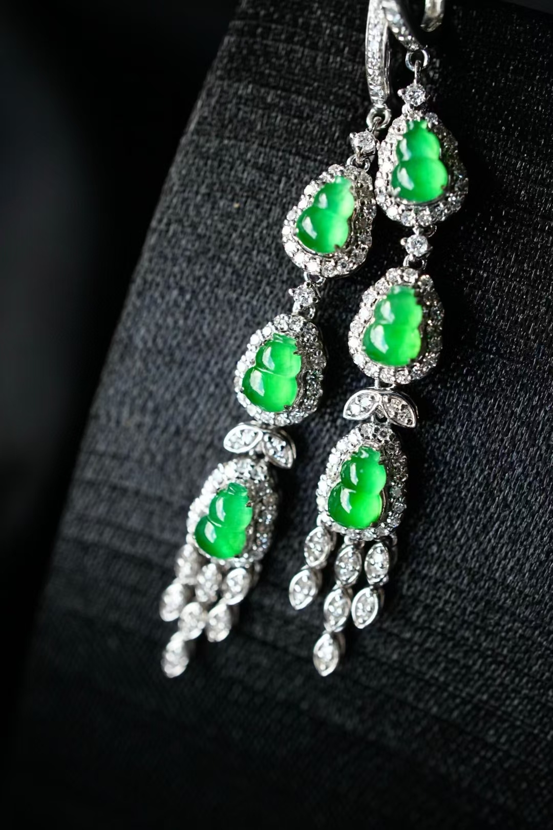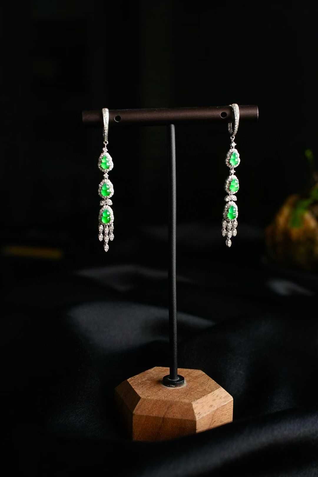 一舉一動間,不經意的優雅與靈動。天然翡翠A玉,難得匹配的六顆冰陽綠葫蘆,緬甸老坑種,種色兼備色濃,品相極好。18K金滿鑽鑲嵌,氣質滿滿,長耳墜的優雅,更有韻味。