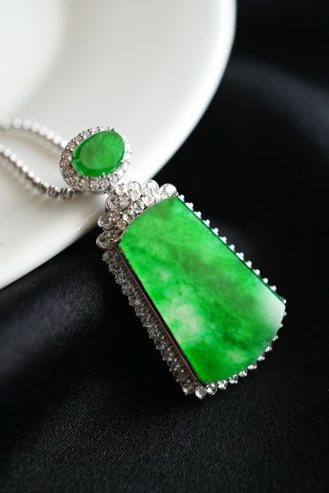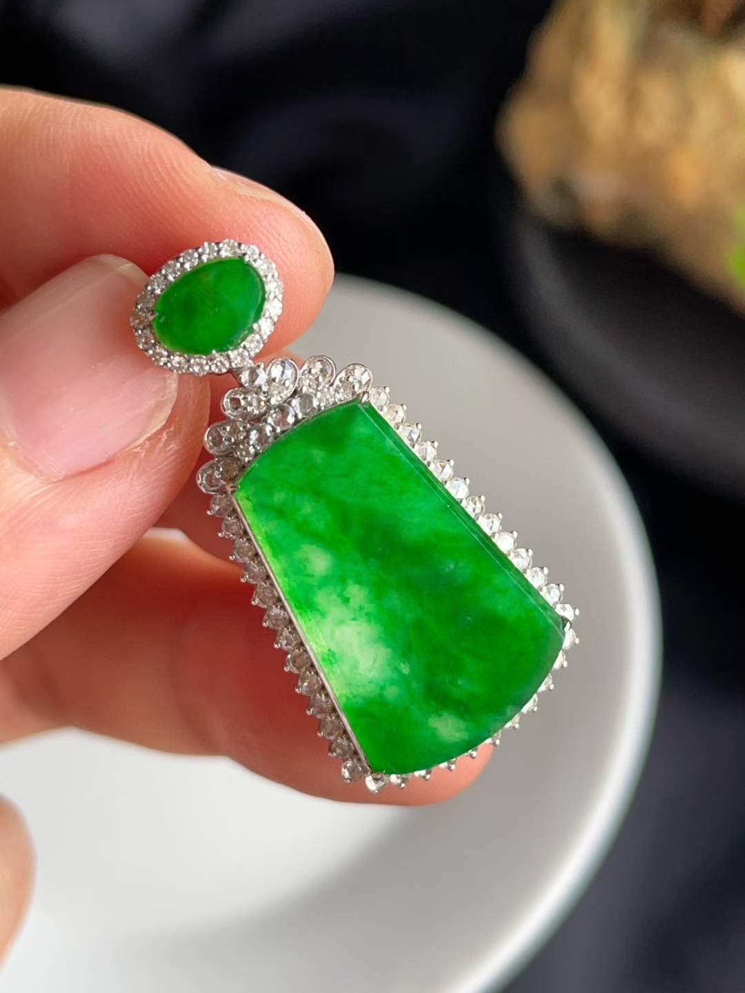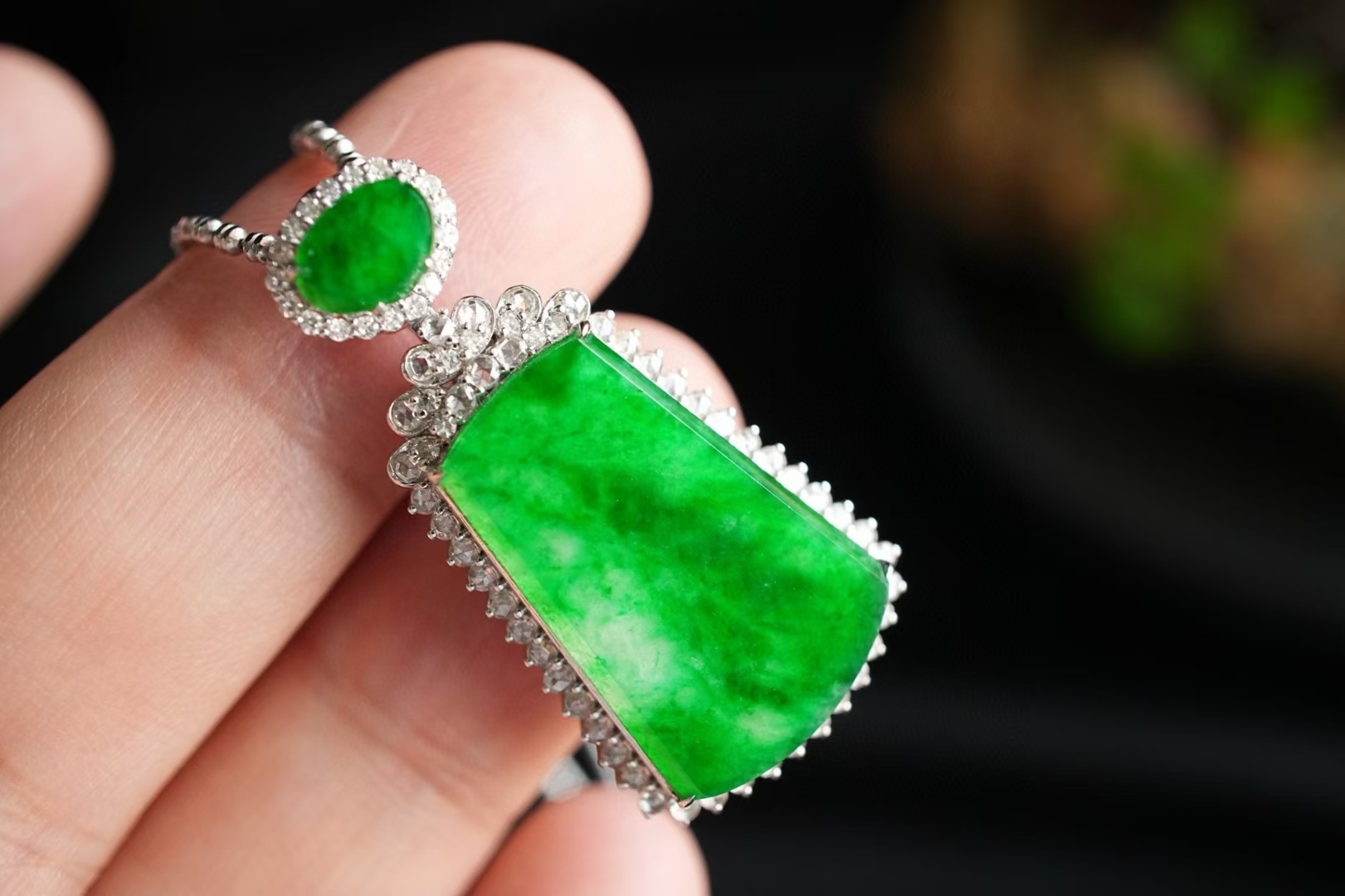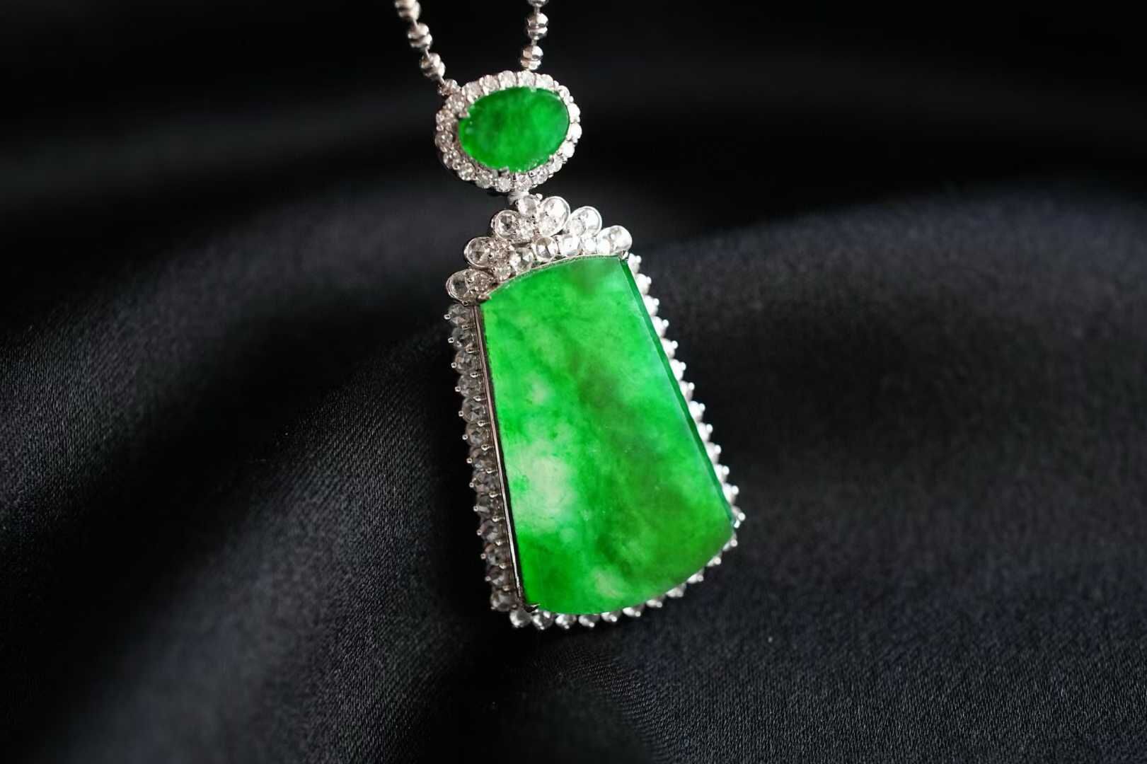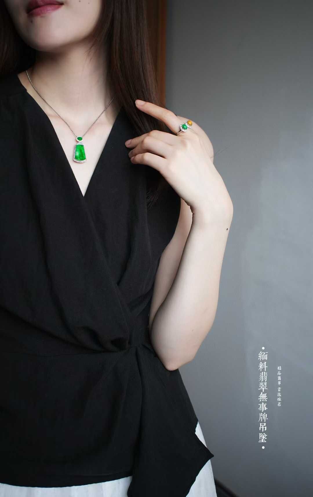 天然翡翠A玉,緬料,實物就有這麼辣色,鬱郁蔥蔥,艷麗動人,水頭很足,一點都不發乾,種色俱佳!無事牌需要毫無雕刻,無任何修飾,對材料的品質要求最嚴苛!這塊種色這麼好,錯過了真的不會再有了。18K金大顆粒鑽石鑲嵌,奢華貴氣!