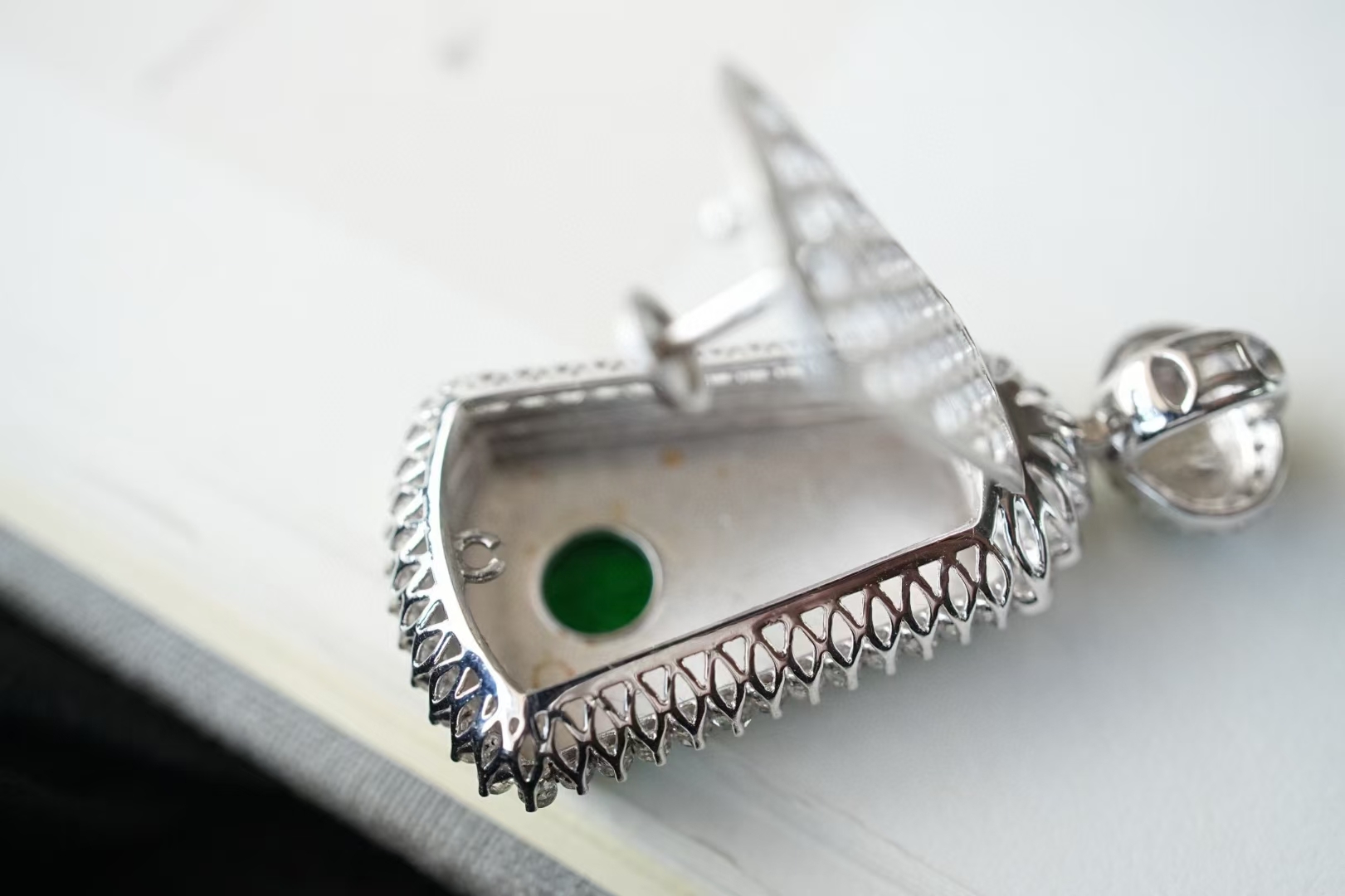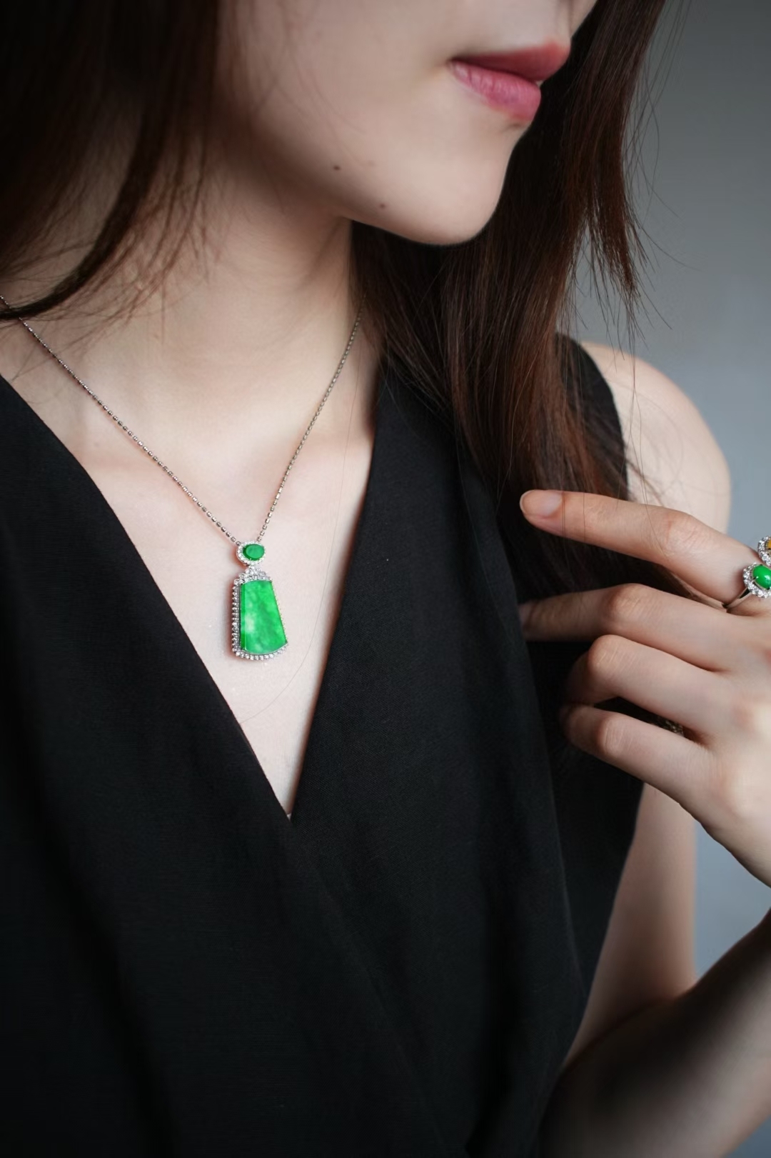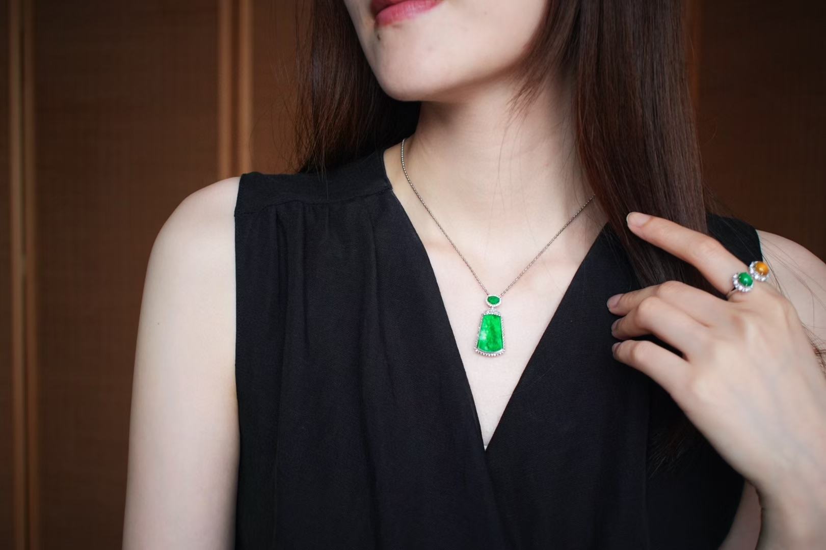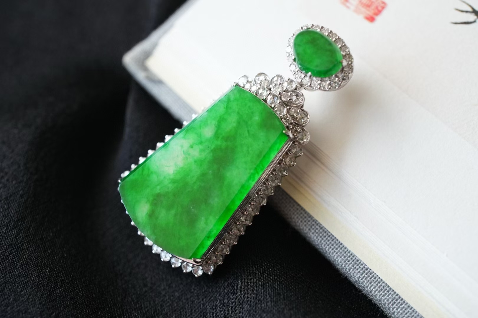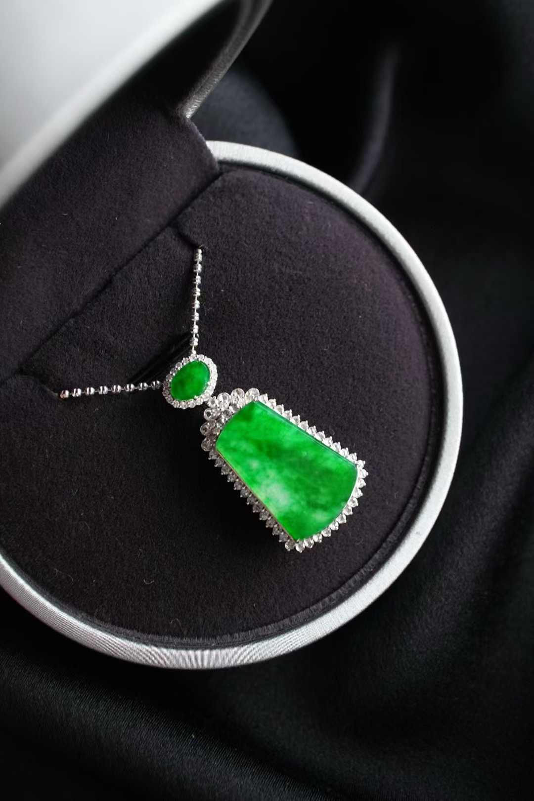 天然翡翠A玉,緬料,實物就有這麼辣色,鬱郁蔥蔥,艷麗動人,水頭很足,一點都不發乾,種色俱佳!無事牌需要毫無雕刻,無任何修飾,對材料的品質要求最嚴苛!這塊種色這麼好,錯過了真的不會再有了。18K金大顆粒鑽石鑲嵌,奢華貴氣!