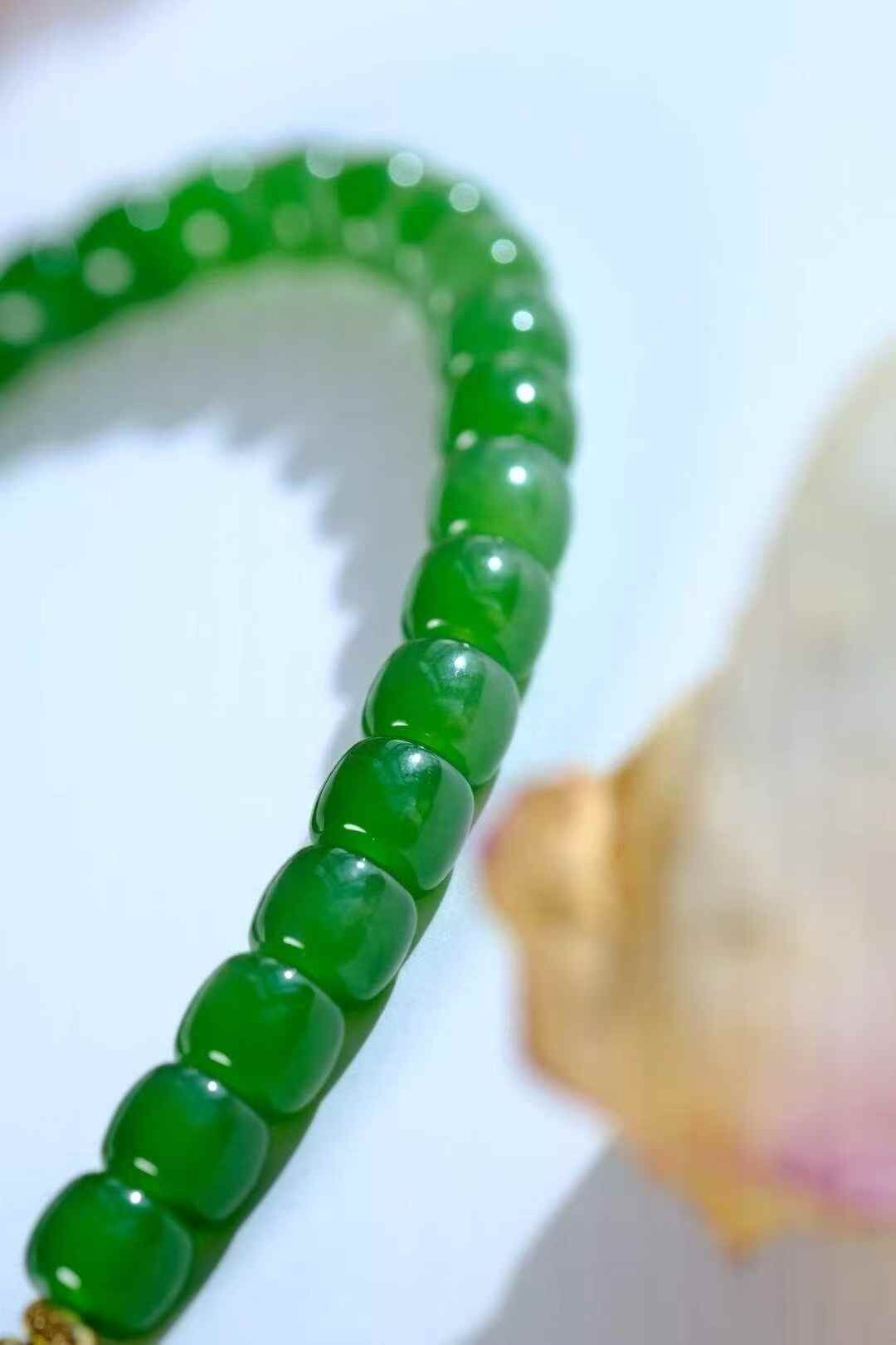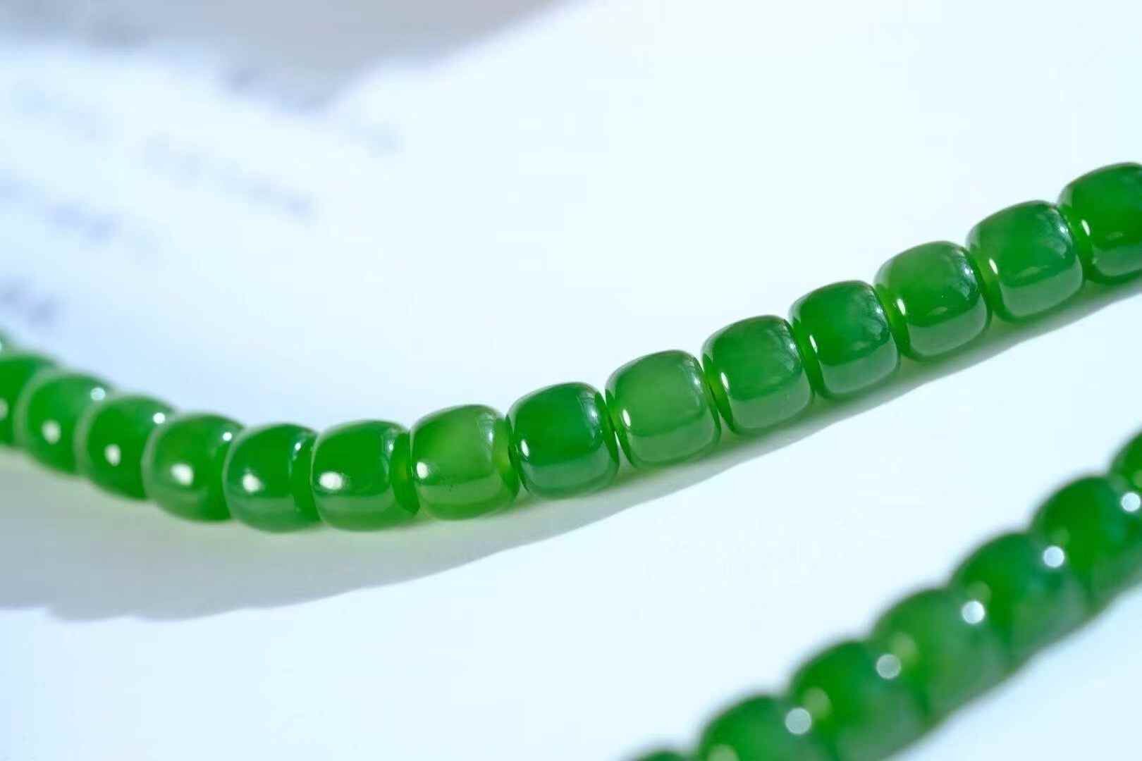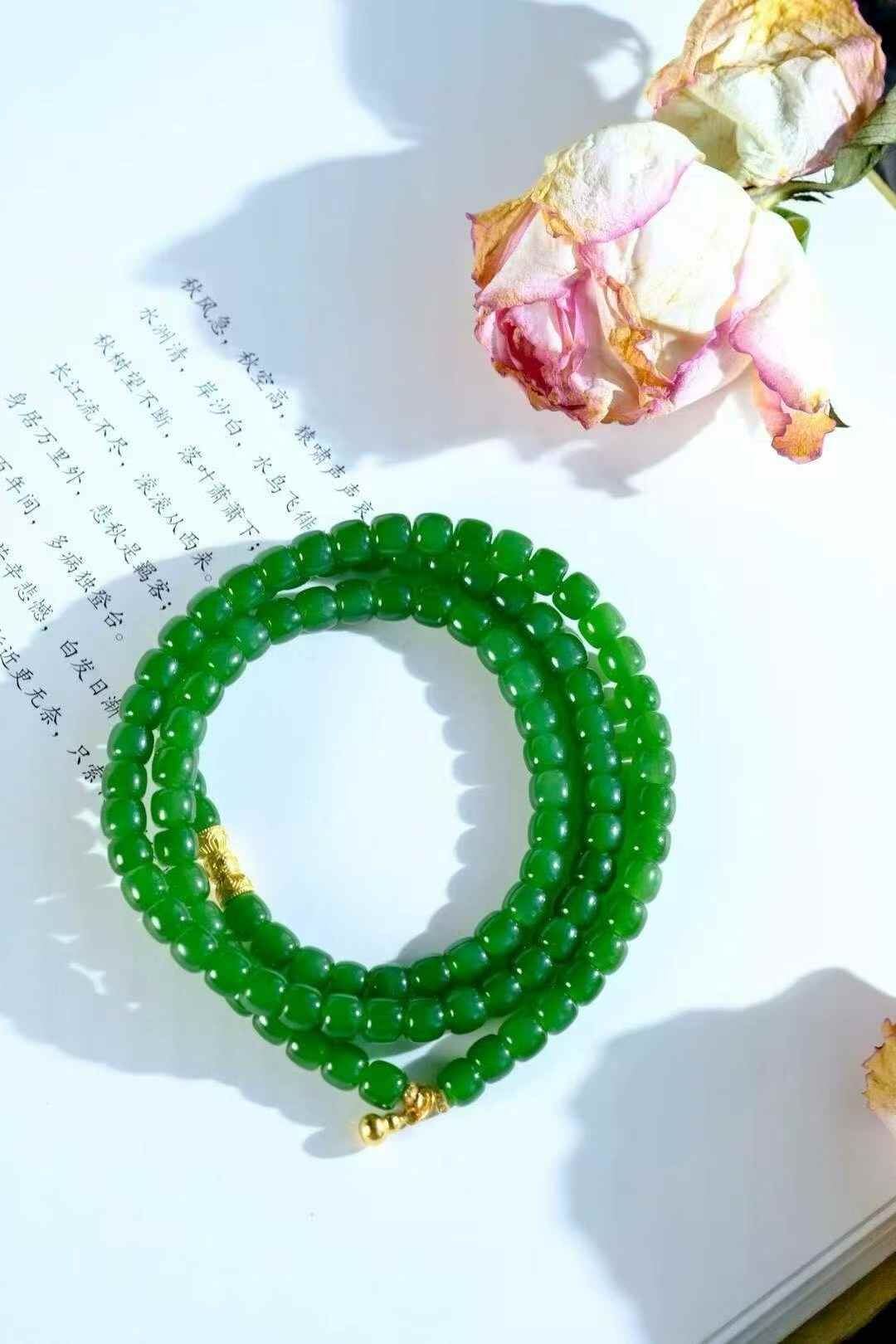 陽綠和田玉碧玉,純手工老型珠,綠色代表財富,滿眼的生機和活力,油糯糯的珠子,顆顆細潤,質感讓人愛不釋手。