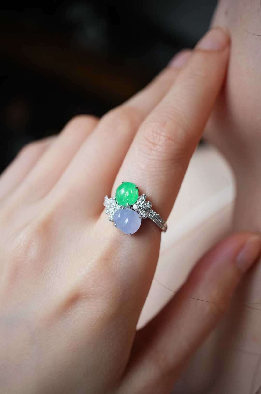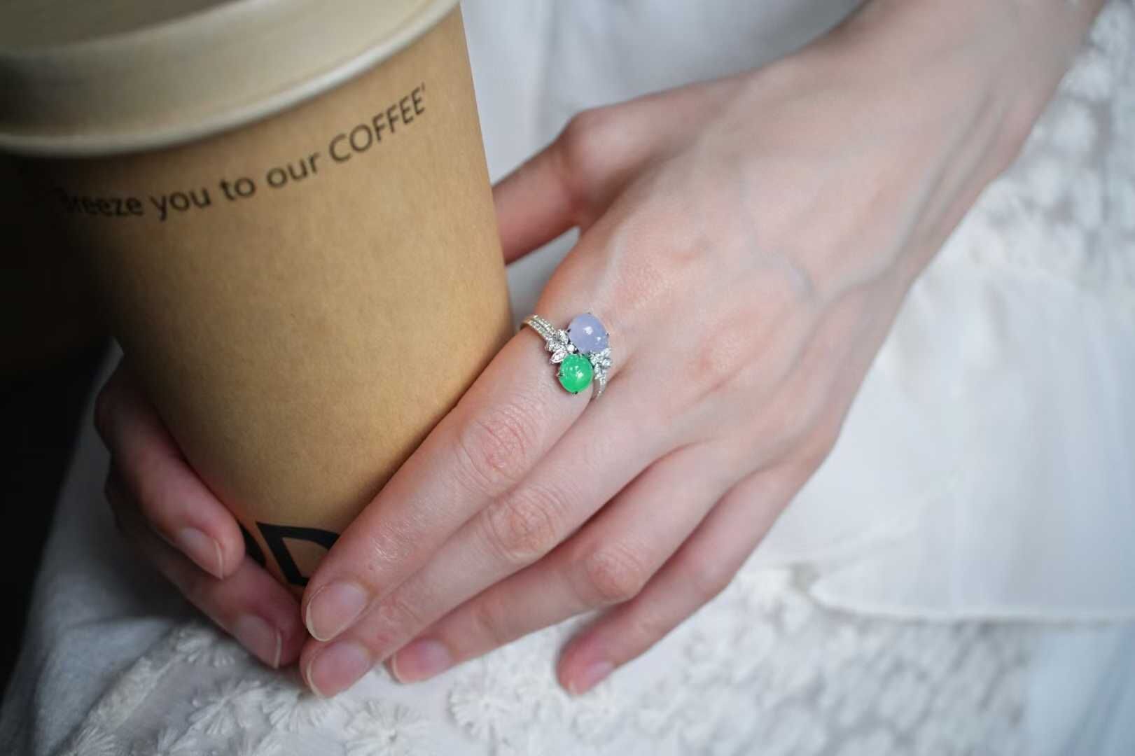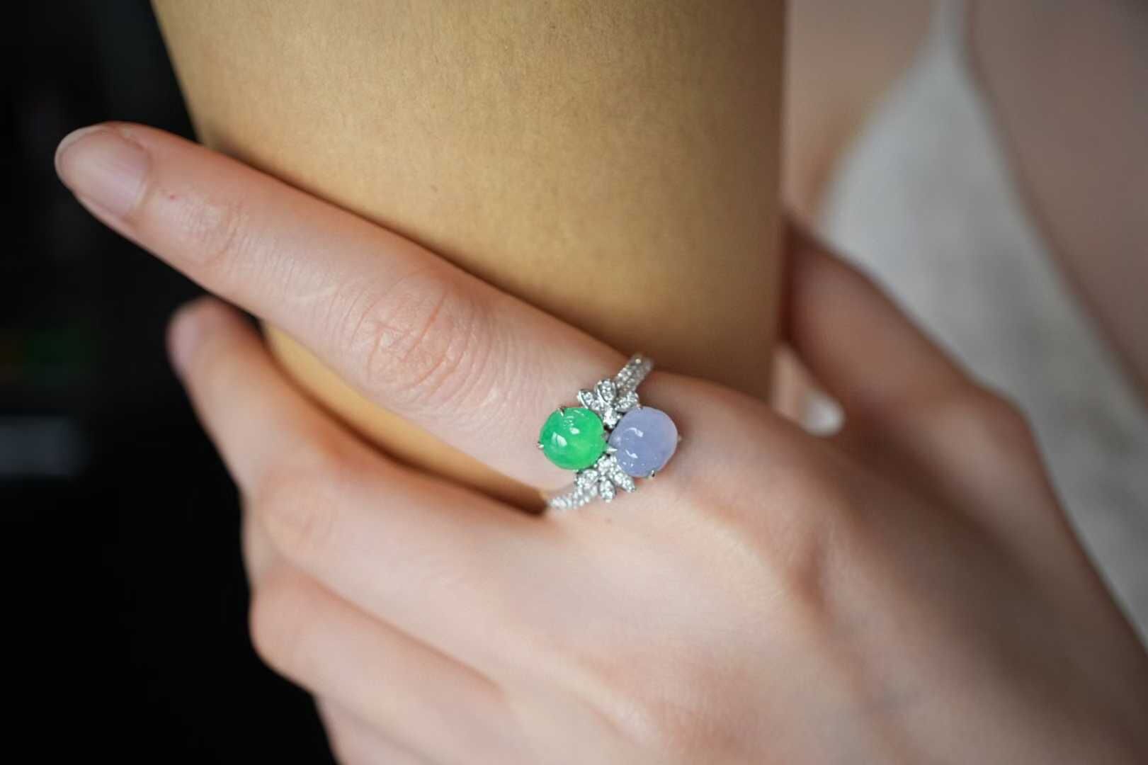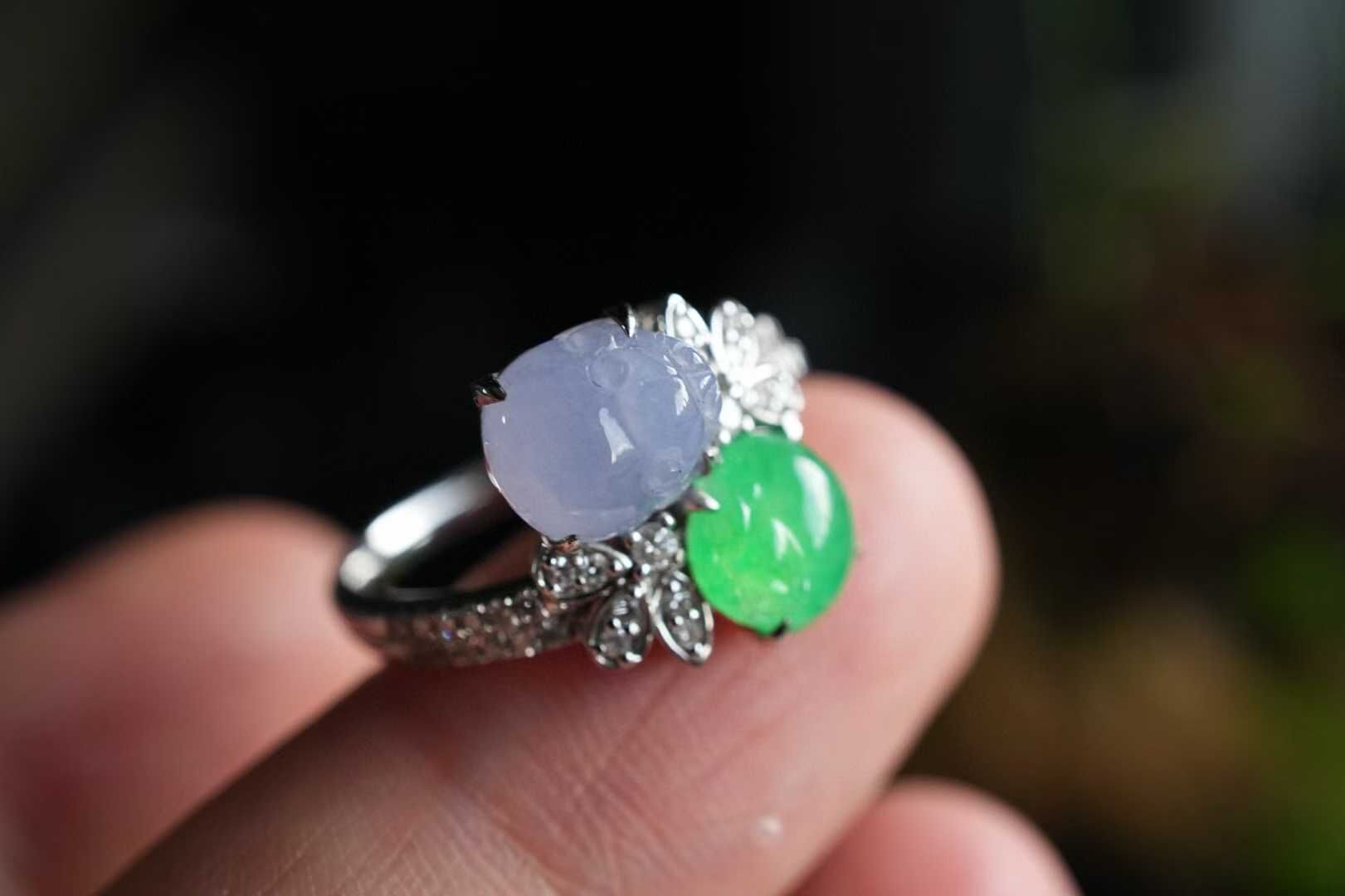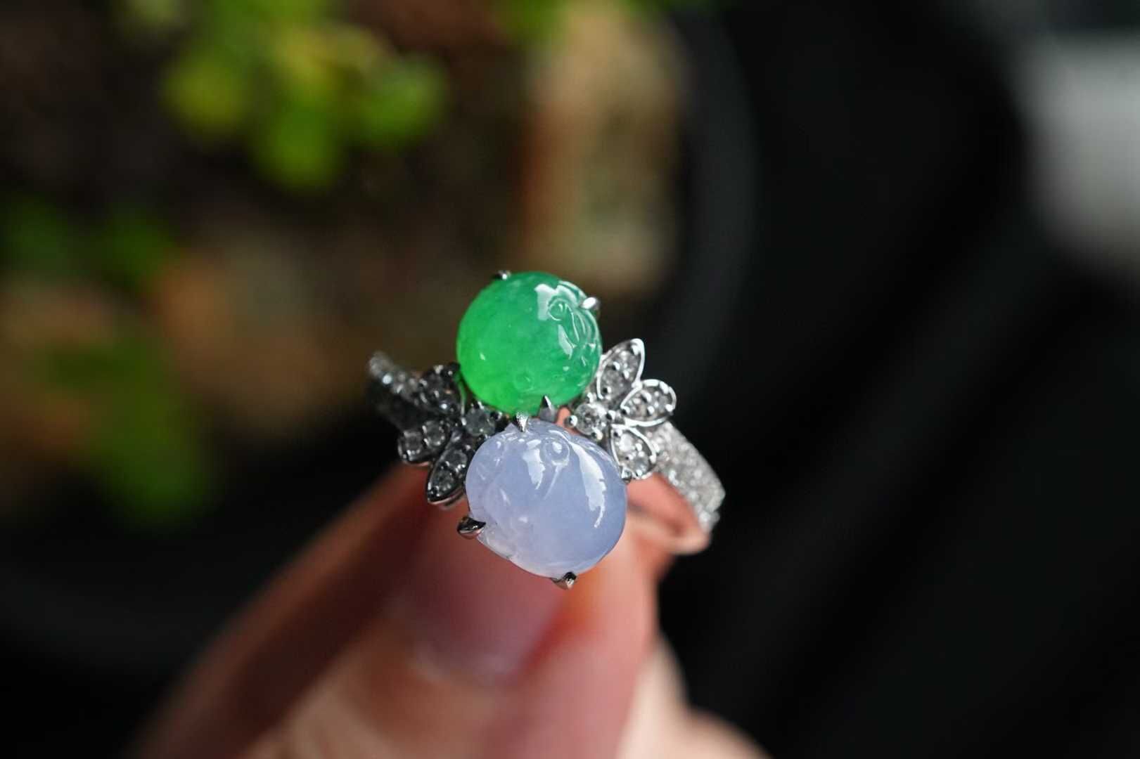 輕奢系列·雙色翡翠貔貅戒指,雙倍醒目,雙倍招財,天然翡翠A玉,冰種正陽小貔貅,搭配冰紫羅蘭貔貅,都是高種色精品,18K金鑽石豪鑲,設計,高級質感滿滿。