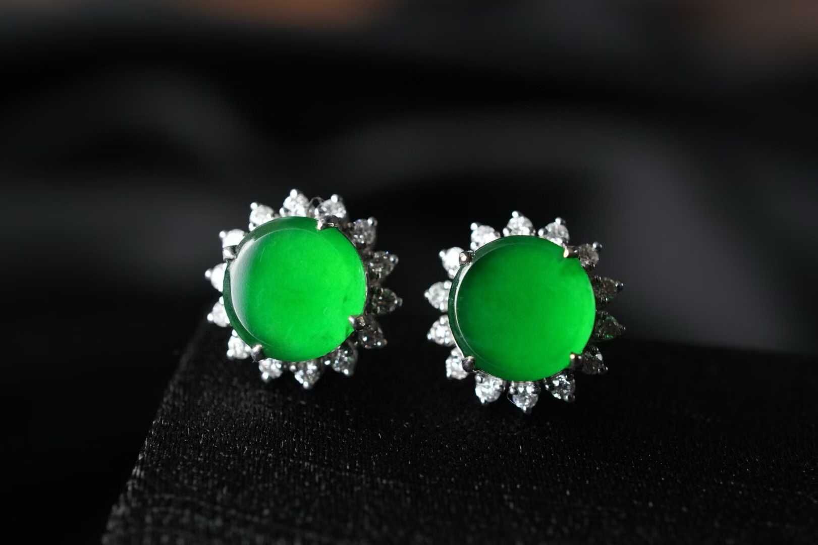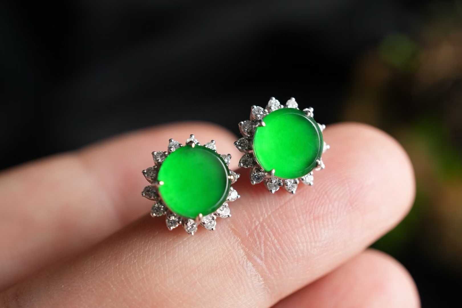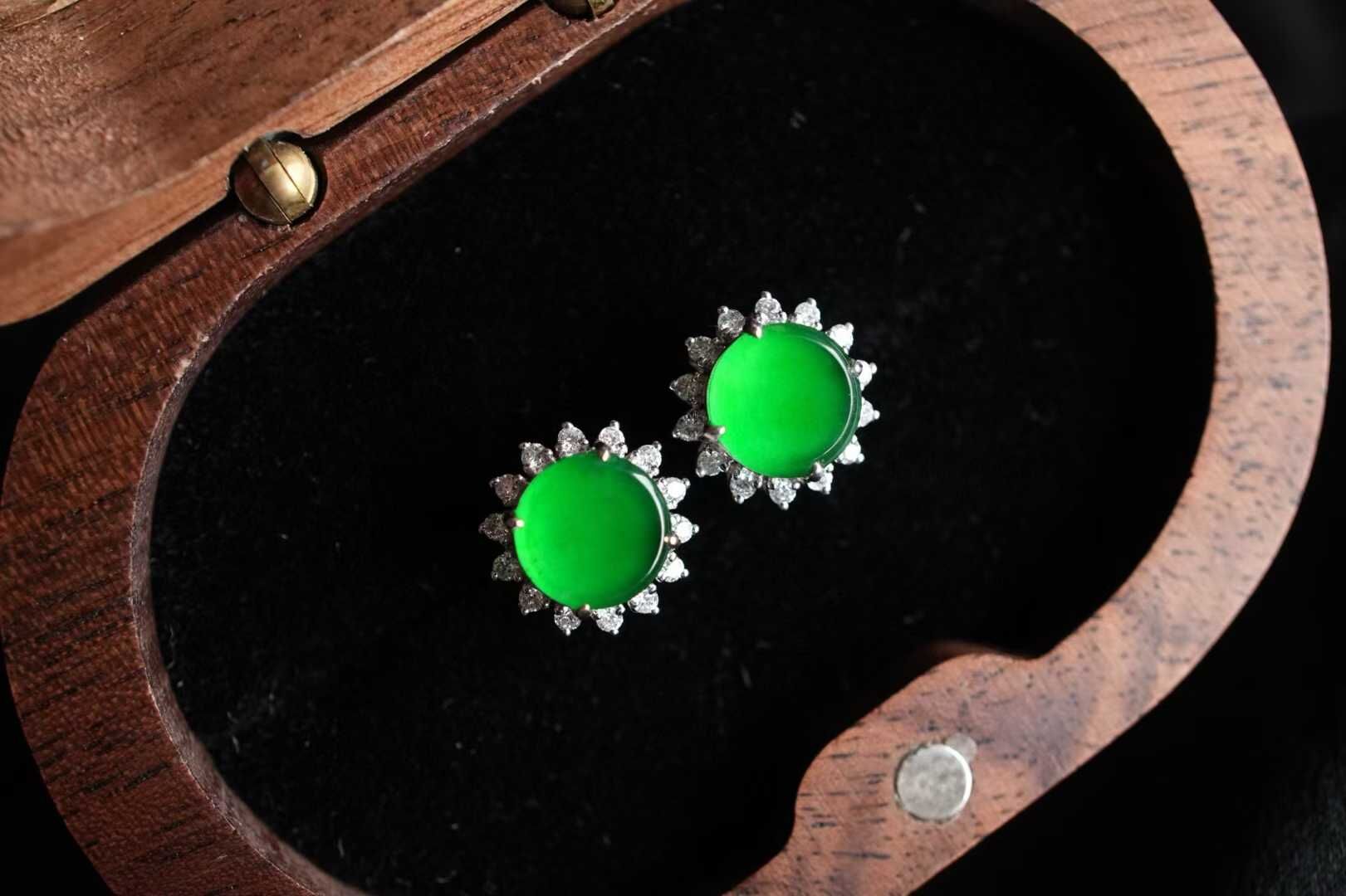 天然翡翠A玉,這對品質絕好!青翠欲滴,太美了。每個角度都有光感,種色太漂亮了,18K金滿鑽鑲嵌,上耳時尚貴氣,質感高級,有這一對就夠了!正式場合都可以佩戴。