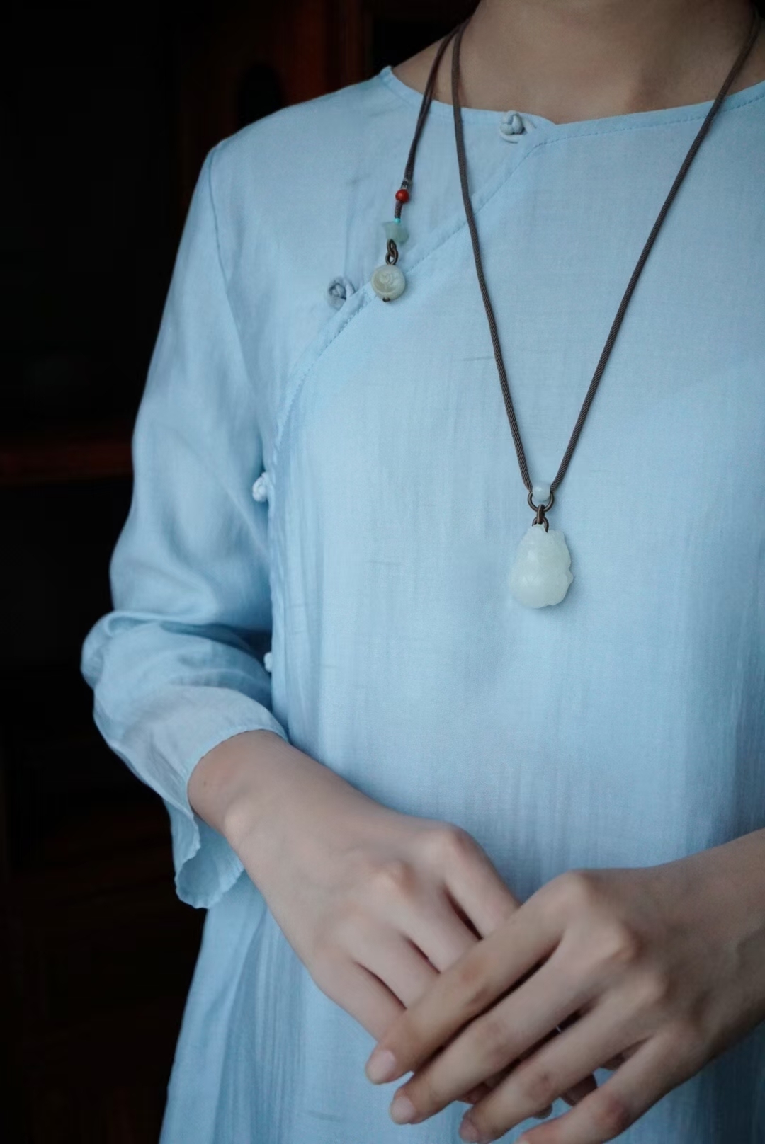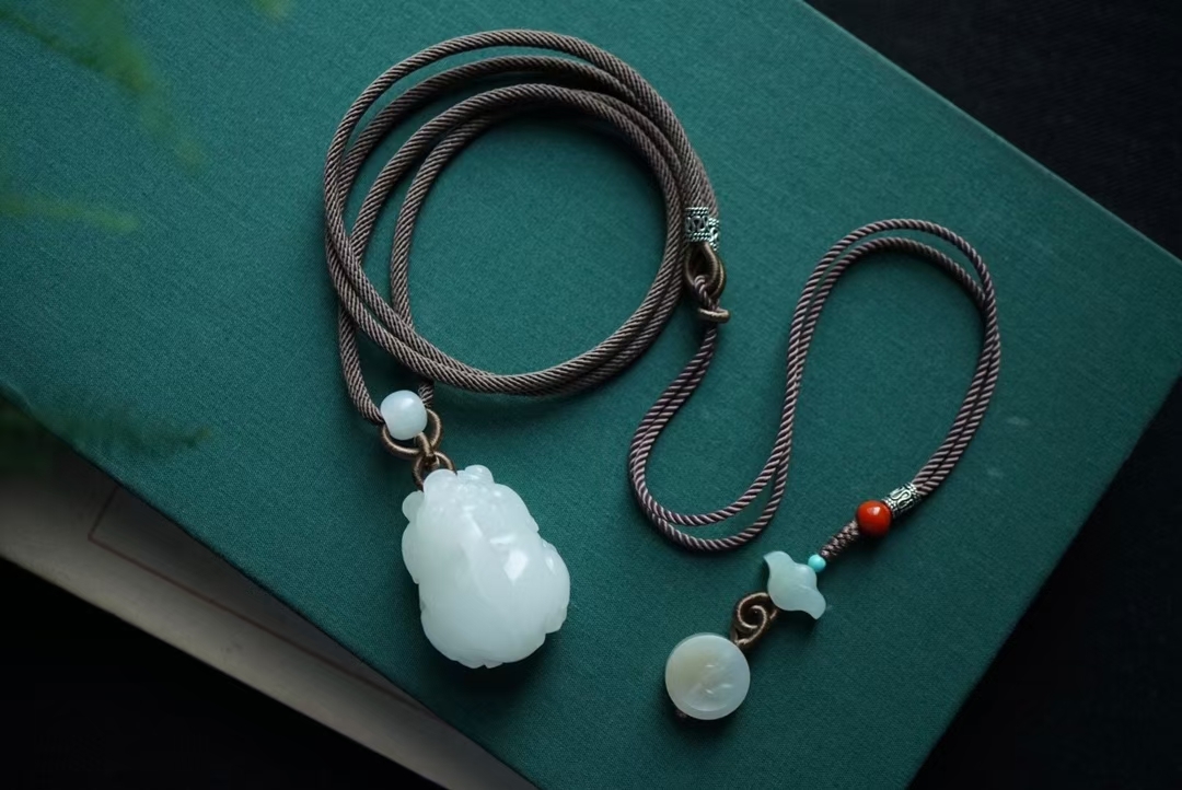 搭配純手工製作進口繩,繞線精緻牢固,白玉路路通點綴 ,純銀小配件、和田玉福字元寶、南紅圓珠連接糖白雕刻圓花牌作墜,精緻大方。