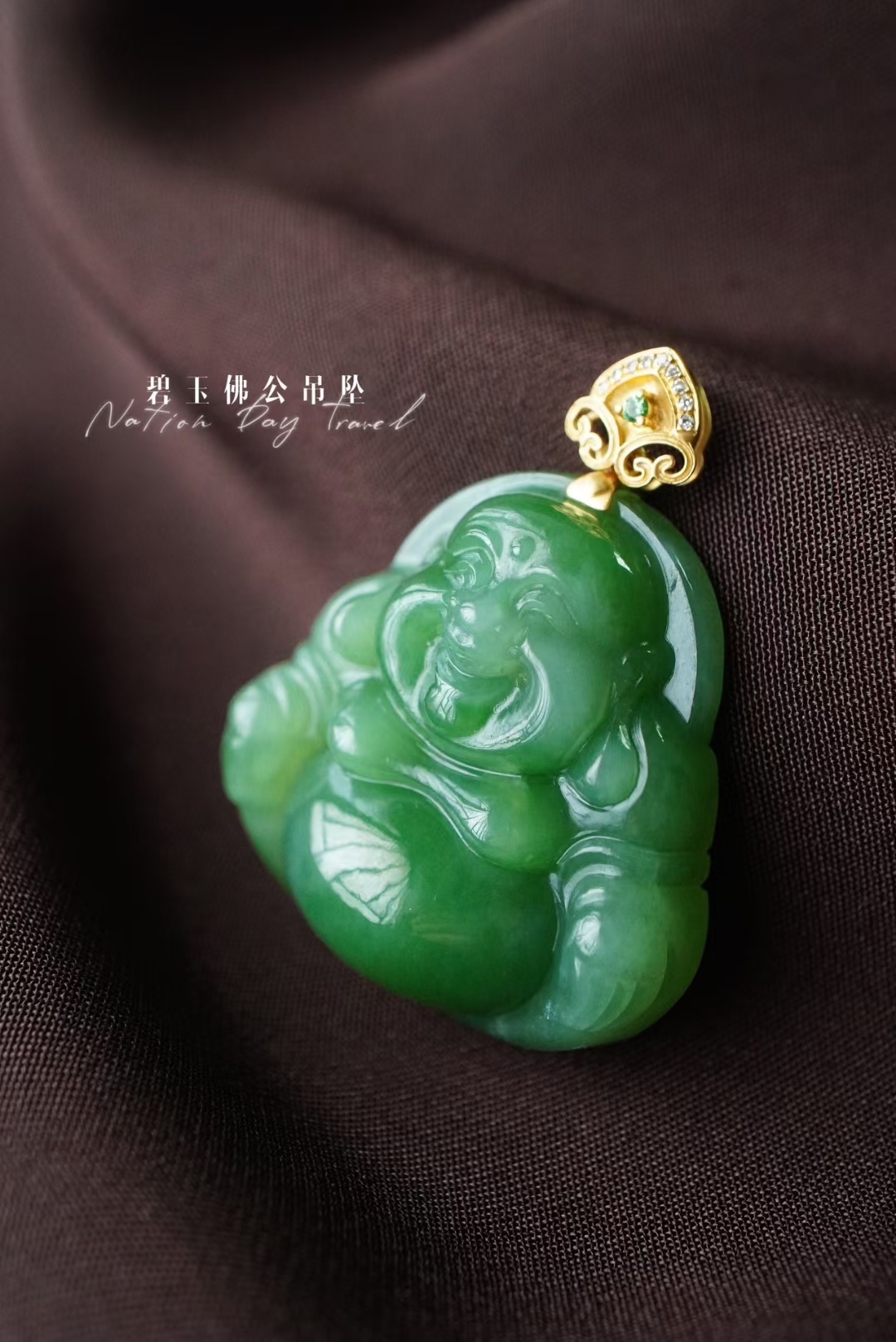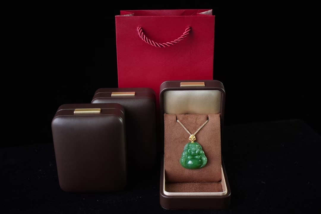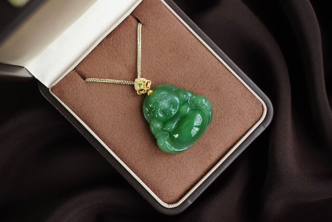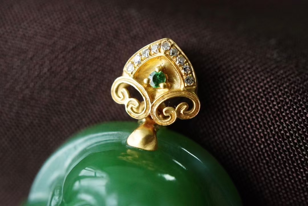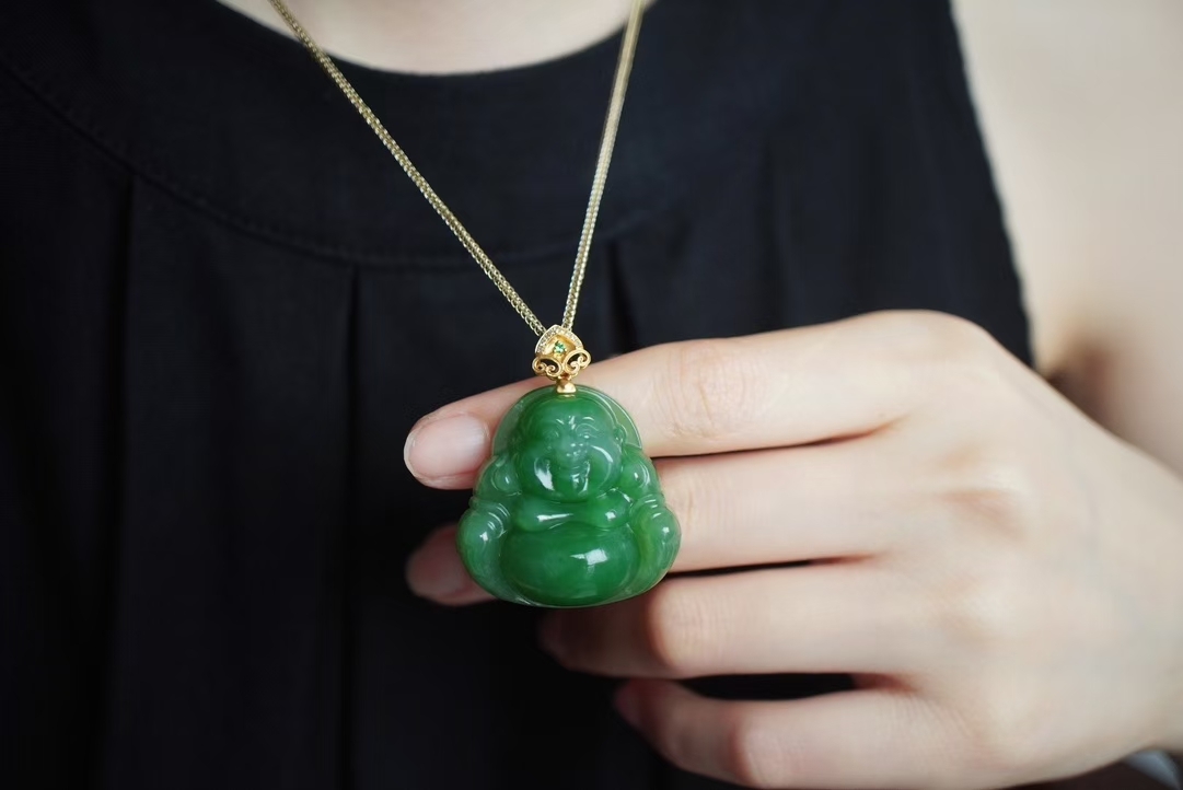 精雕彌勒佛一尊,整體厚實飽滿,雕刻立體細節精緻,憨態可掬,五官纖微畢現,佛公一團和氣笑口常開,寓意吉祥如意。18K厚金如意扣頭,鑽石/沙弗來寶石點綴,佩戴典雅大方。