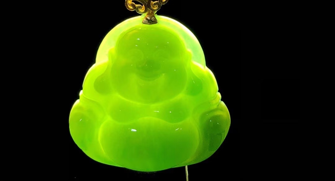 • 和田玉碧玉果綠“笑口常開”彌勒佛吊墜,天然和田玉軟玉