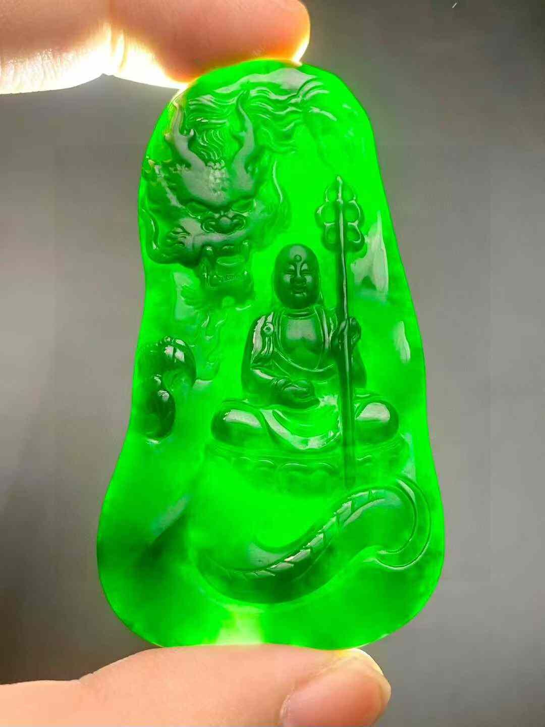 天然翡翠A玉,燈照透綠,雕工精美,完美無紋裂。