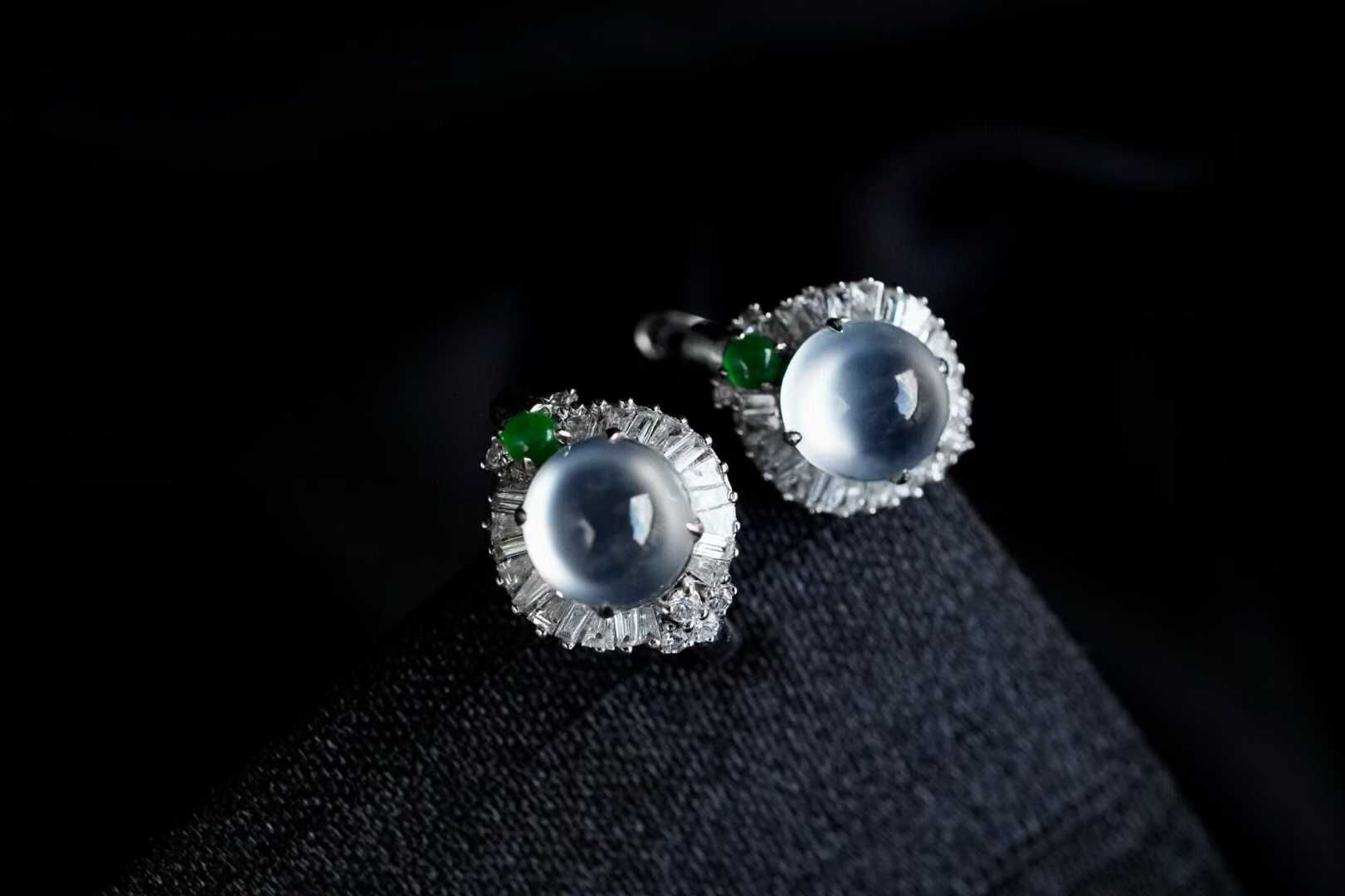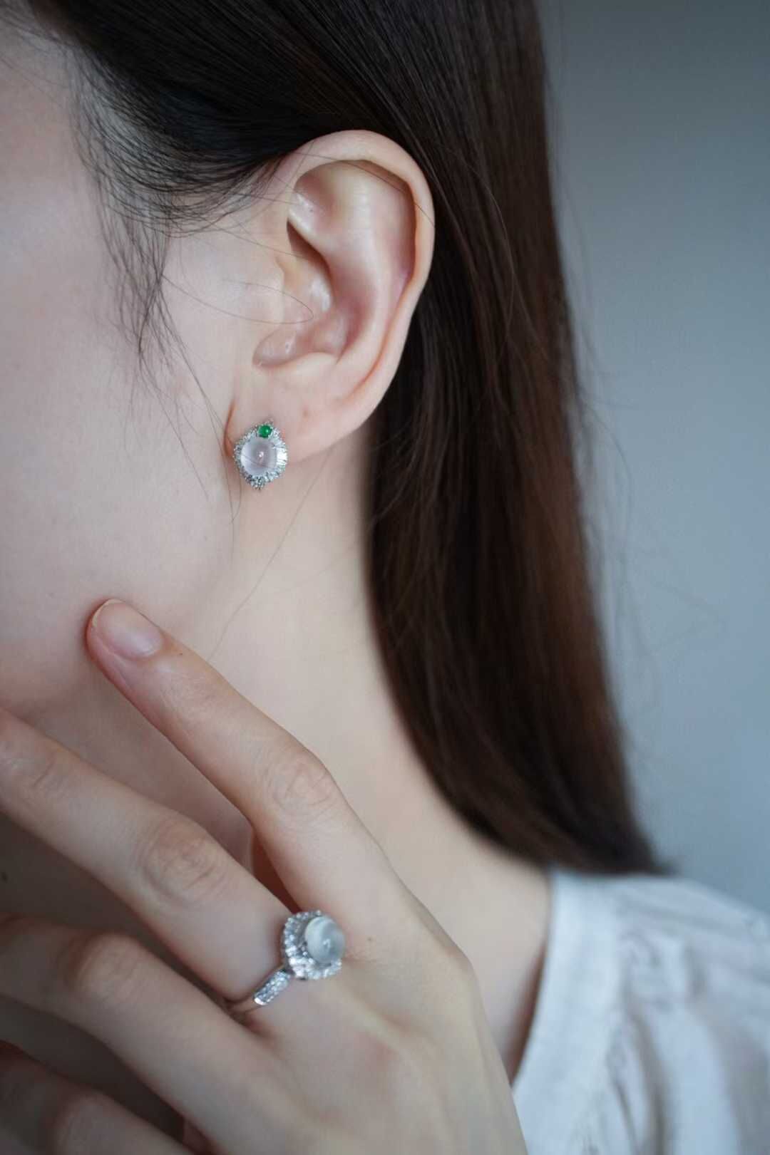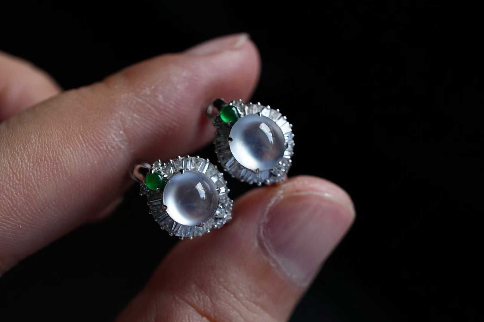 天然翡翠A玉,緬料,高冰茅臺白,蛋面圓潤飽滿,冰冰透透,上身恬靜優雅。耳扣的乾練時尚感也更強!18K金鑽石精工打造,重金豪鑲,點綴陽綠蛋面。