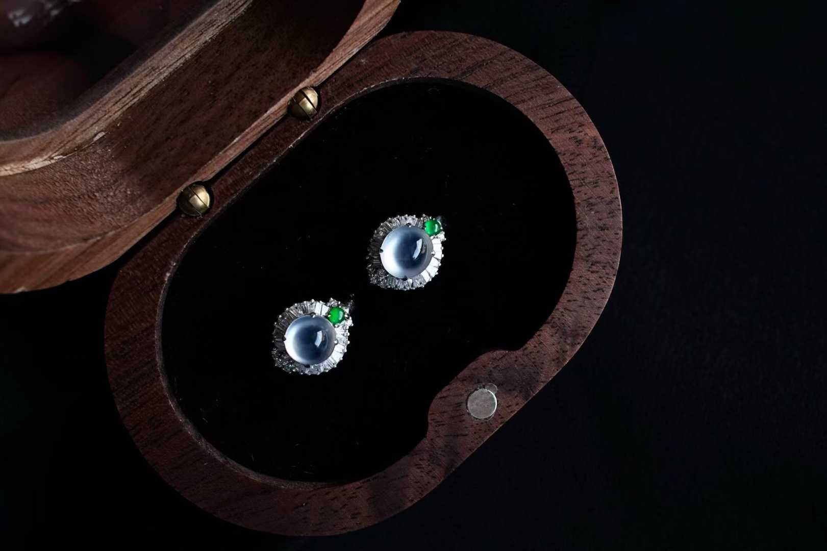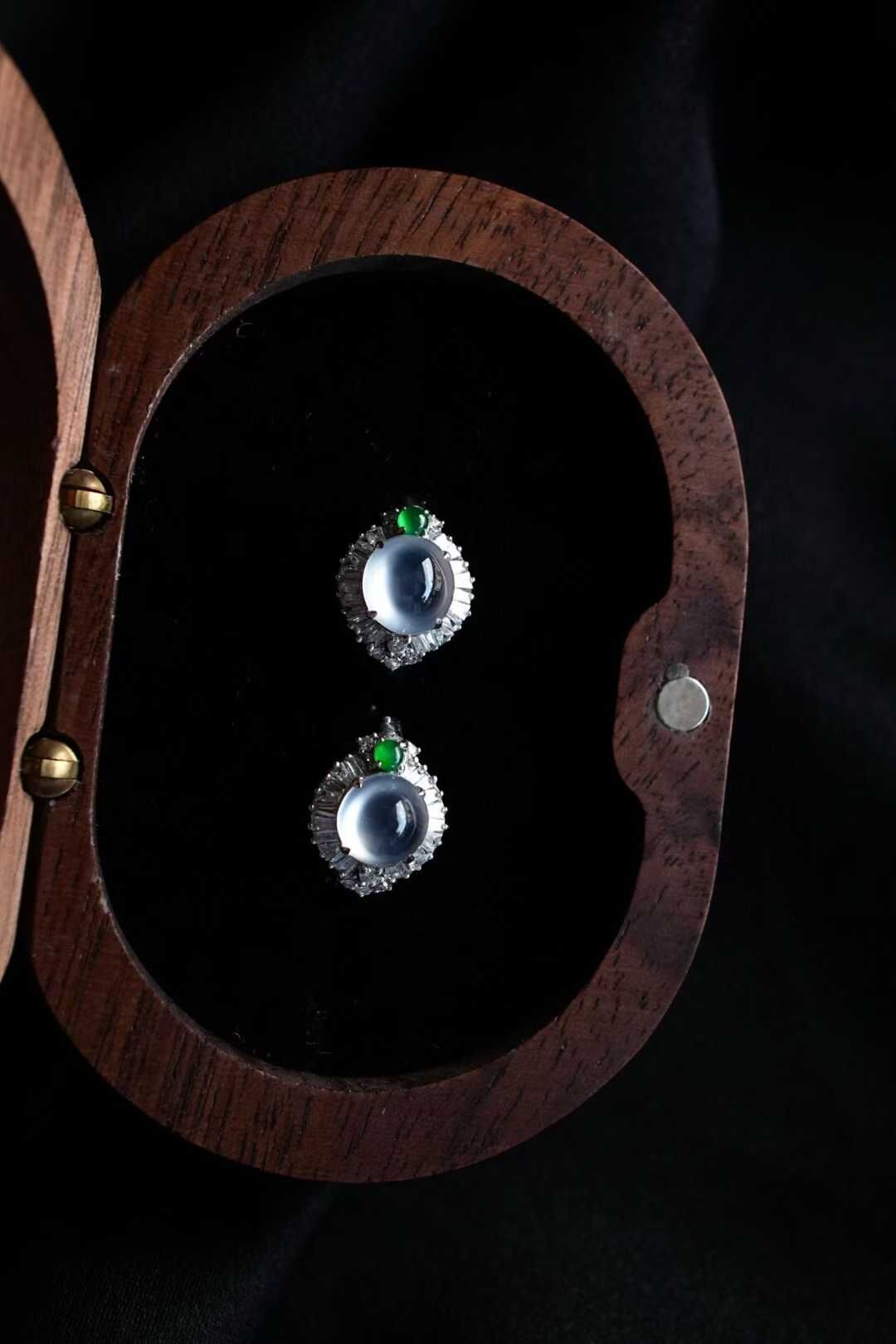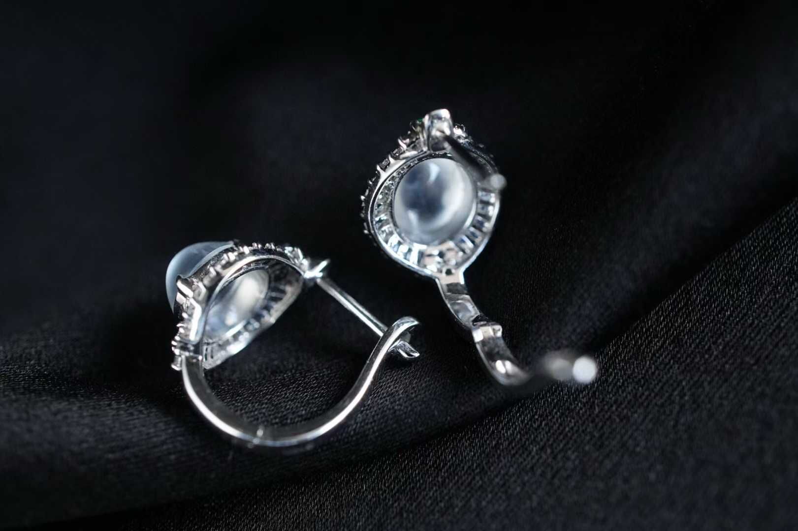 天然翡翠A玉,緬料,高冰茅臺白,蛋面圓潤飽滿,冰冰透透,上身恬靜優雅。耳扣的乾練時尚感也更強!18K金鑽石精工打造,重金豪鑲,點綴陽綠蛋面。