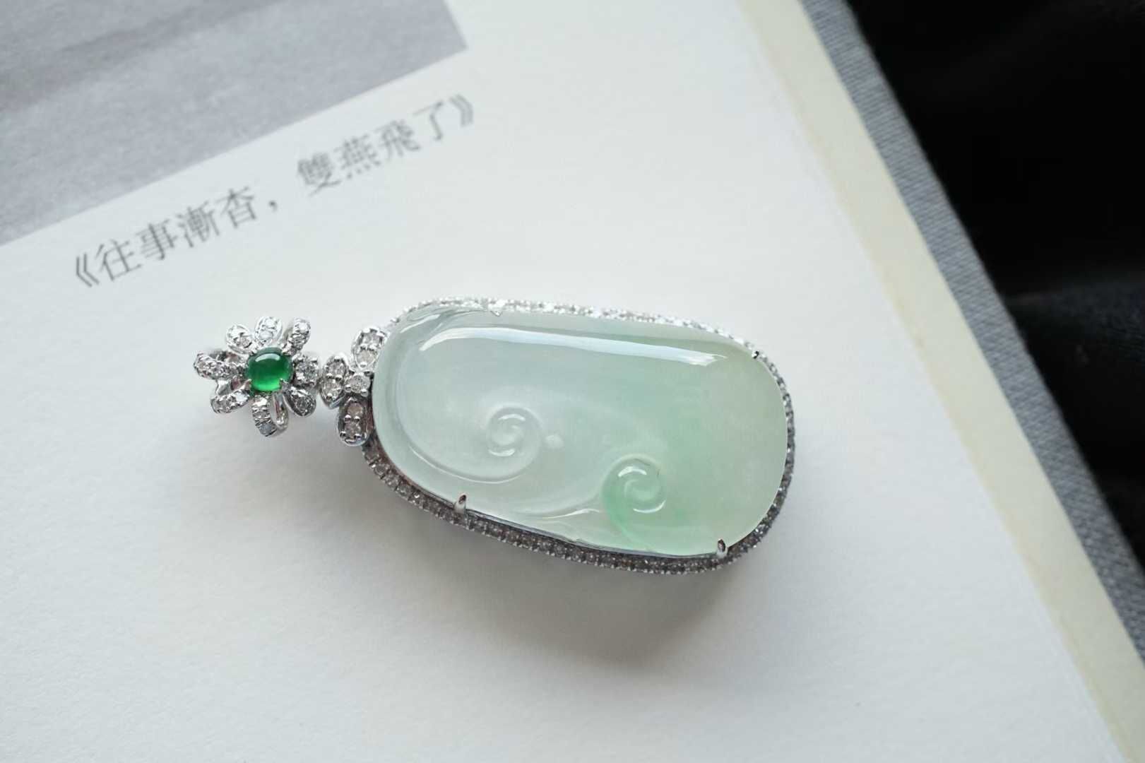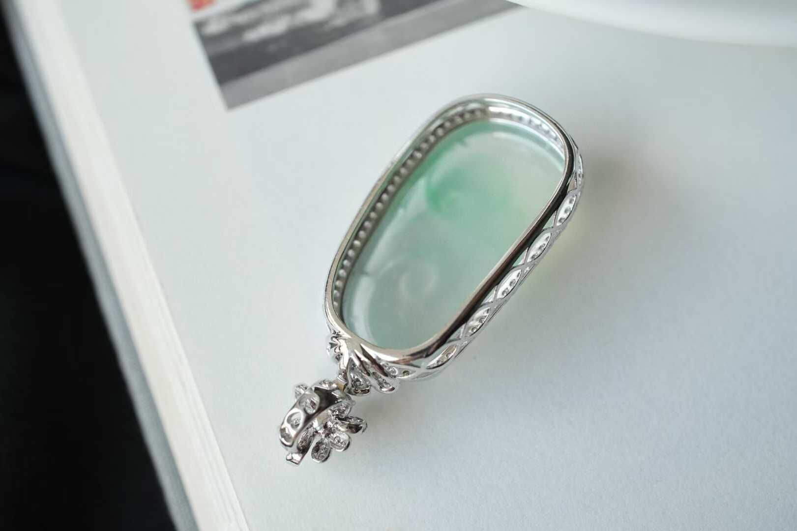 天然翡翠A玉,緬料,木那雪花棉,種水一流,起膠感。種色相融,陽綠色靈動活泛,背面還是一刀切,難得的性價比!18K金滿鑽鑲嵌,精緻貴氣,可遇不可求的美物,十分靈氣。