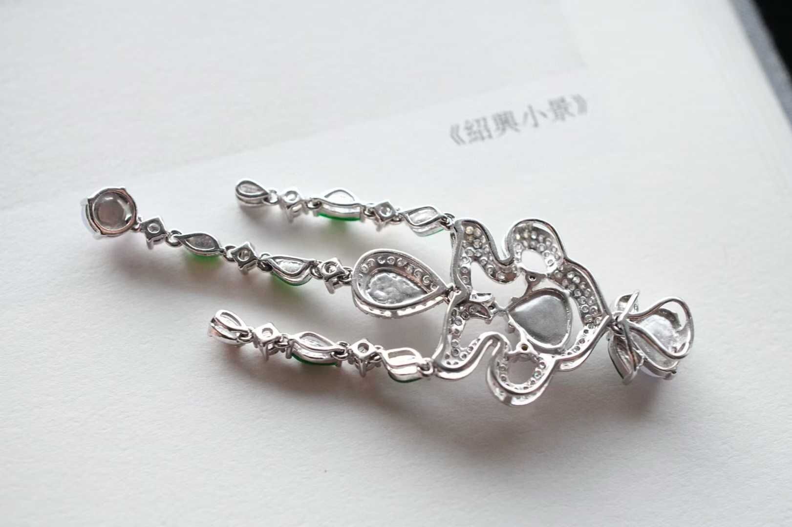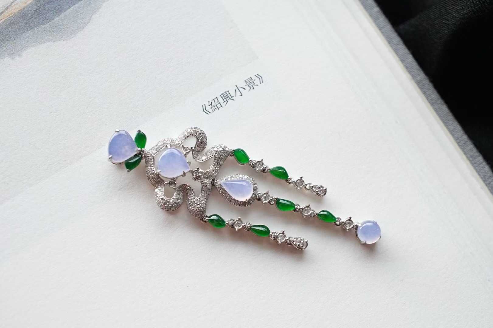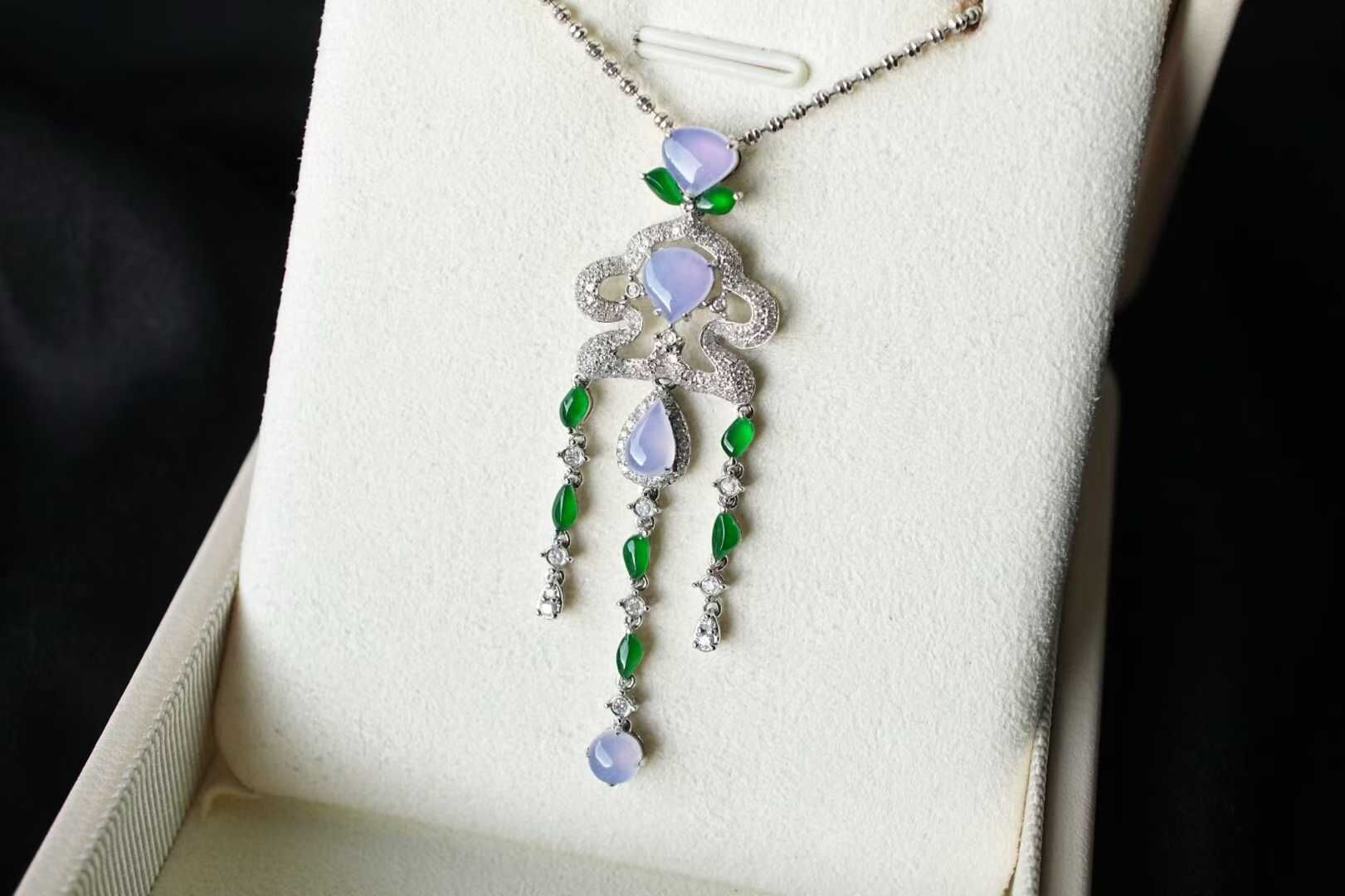 天然翡翠A玉,緬料,冰紫羅蘭和陽綠翡翠的組合!一眼入心的美物,紫羅蘭本就溫柔,流蘇設計更顯柔美,貴氣。18K金鑽石鑲嵌,精工重金!