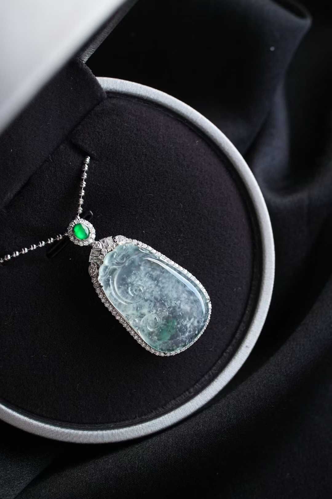 天然翡翠A玉,緬料老坑種,這件如意的種質極美,冰透起膠感,標準的木那雪花棉,在陽光下就像快要融化的冰雪一樣,洋洋灑灑,十分飄逸美麗。佩戴清冷仙氣,矜貴感十足18K金足反鑽石鑲,極光綠蛋面,稀有貨。