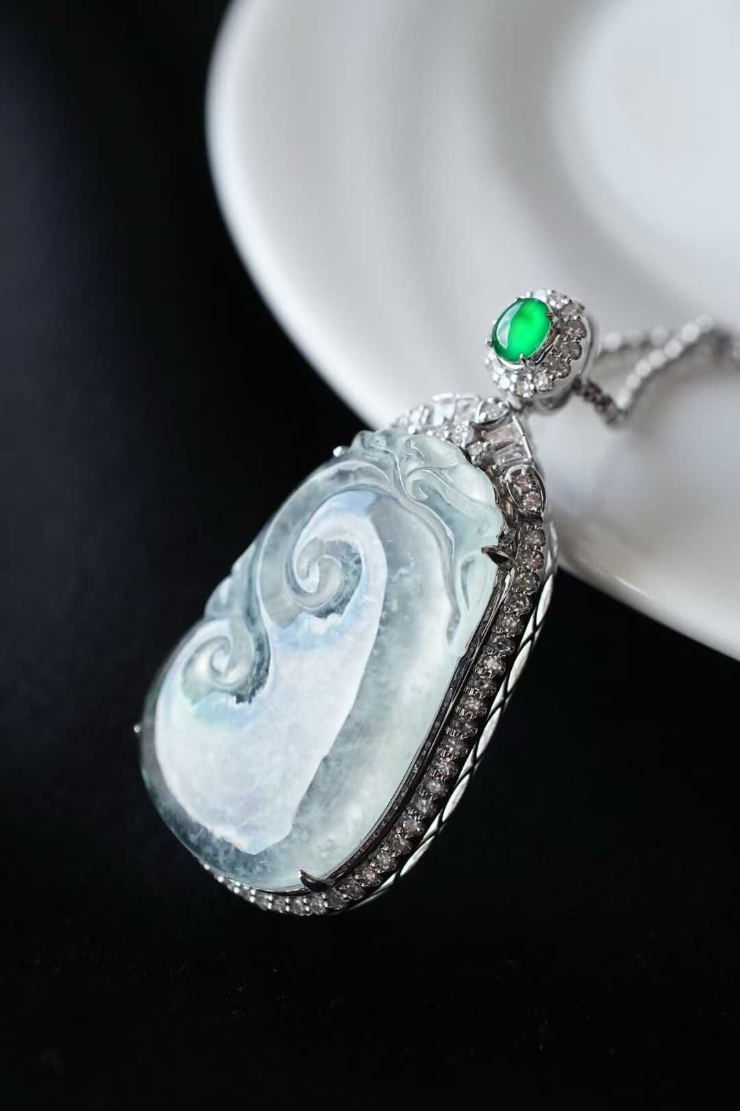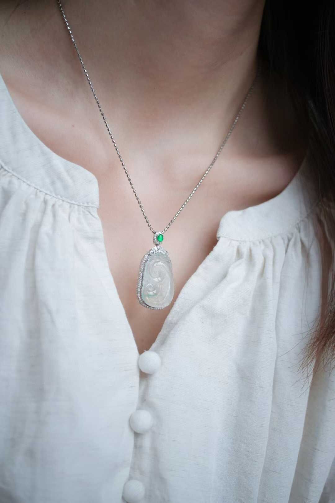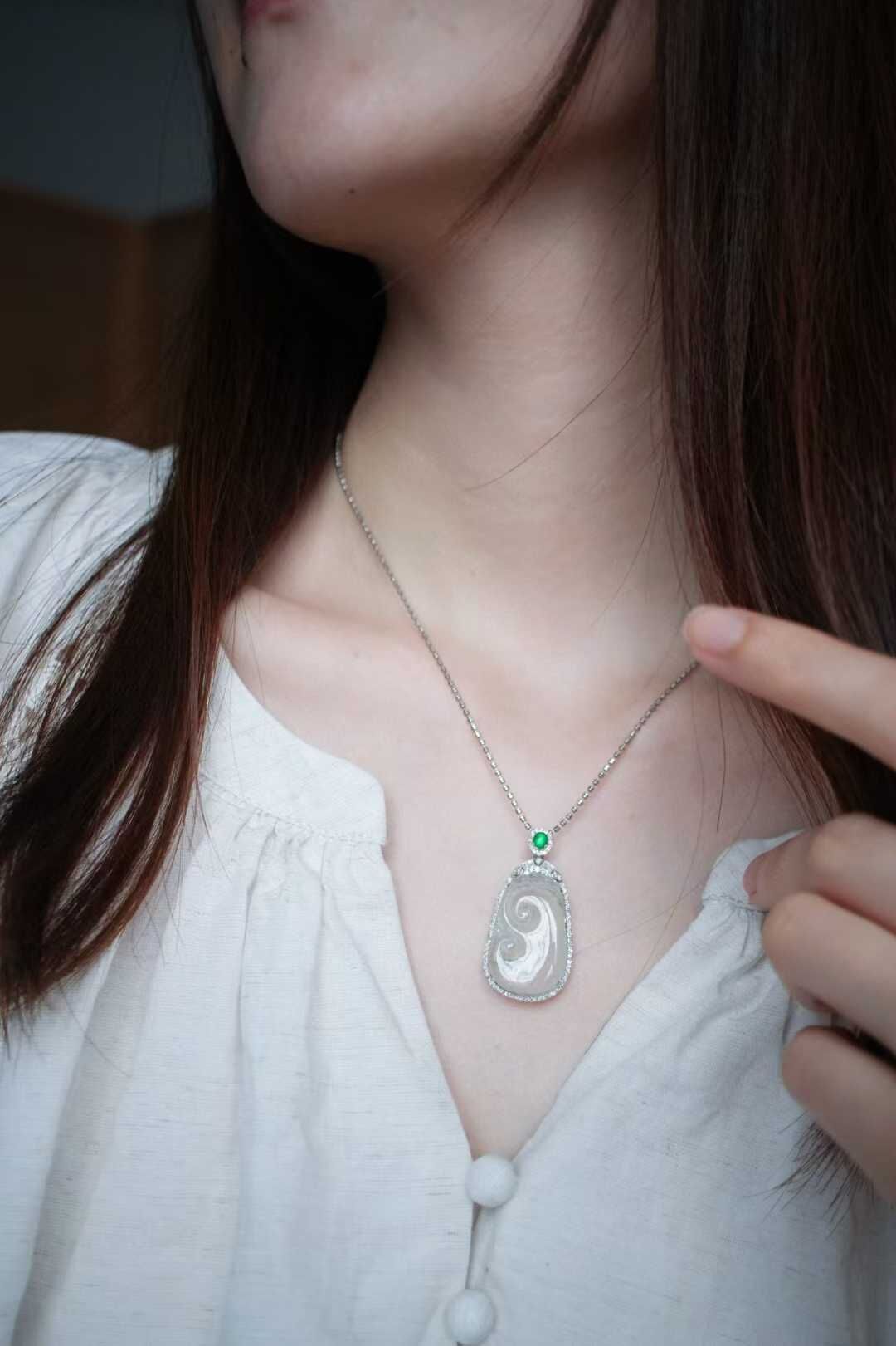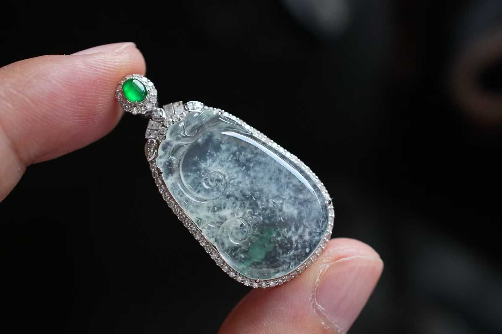 • 翡翠冰種木那雪花棉如意吊墜,天然翡翠A玉, 緬甸玉, Jade, Jadeite