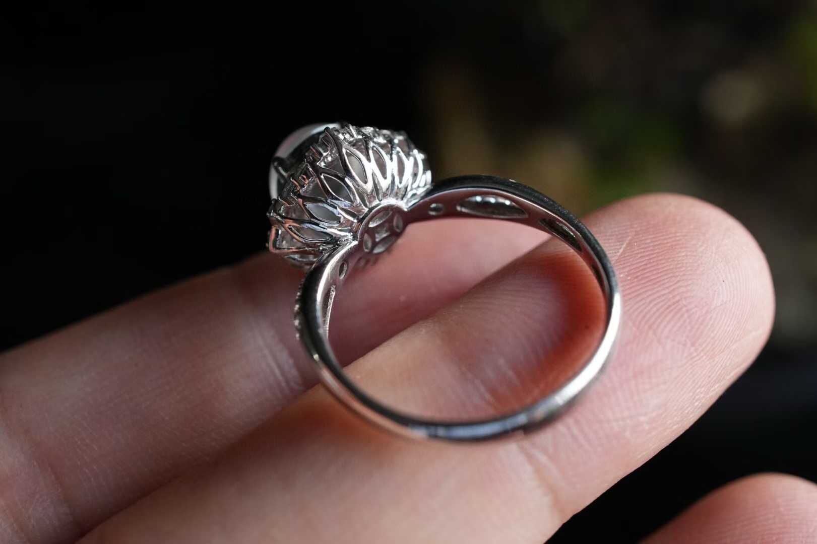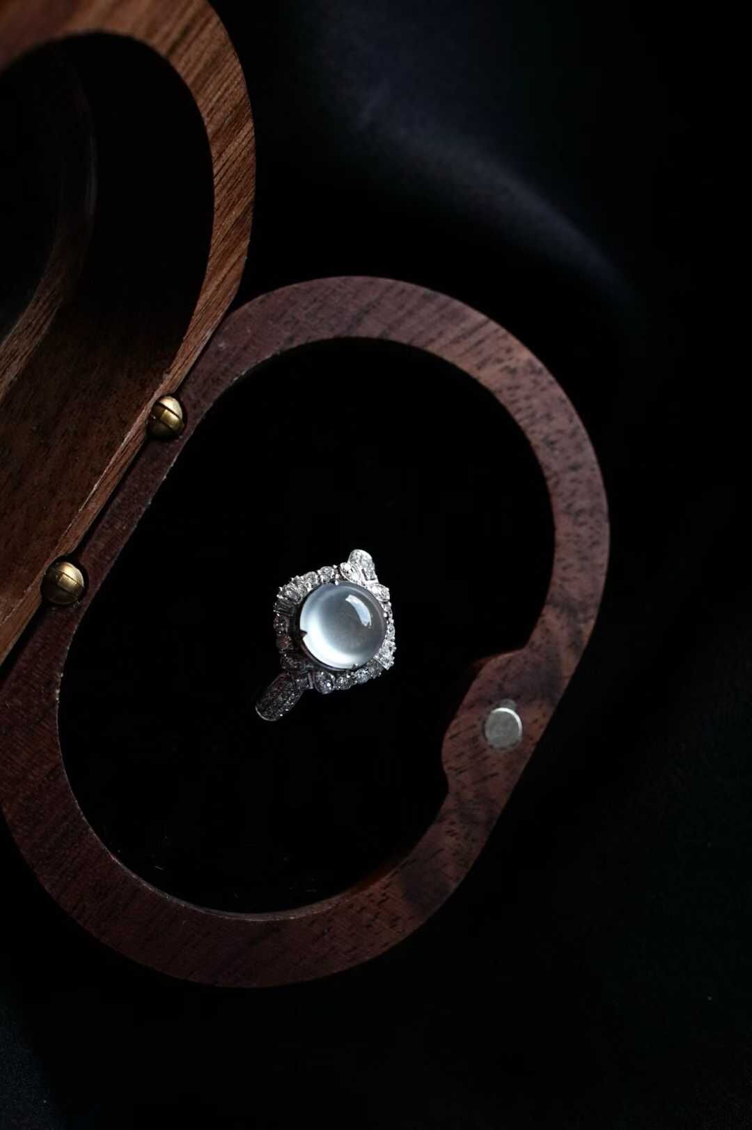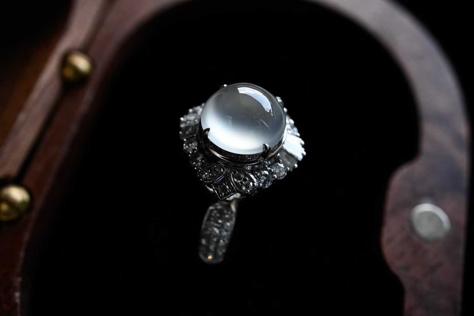 拍不出的炸光感!天然翡翠A玉,緬料,通透澄亮,起熒光,非常飽滿厚墩墩的,讓人一見傾心的美物。百看不厭的設計款高冰蛋面戒指,18K重金質感,碎鑽鋪設,更顯裸石的通透種水,超顯氣質,很有品味的設計,輕奢珠寶感。