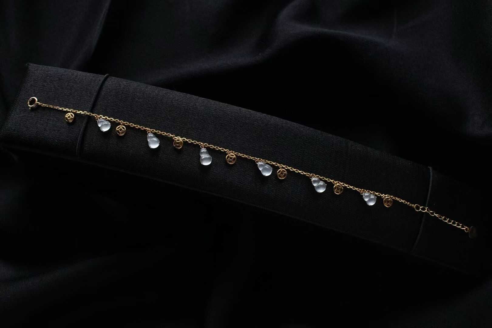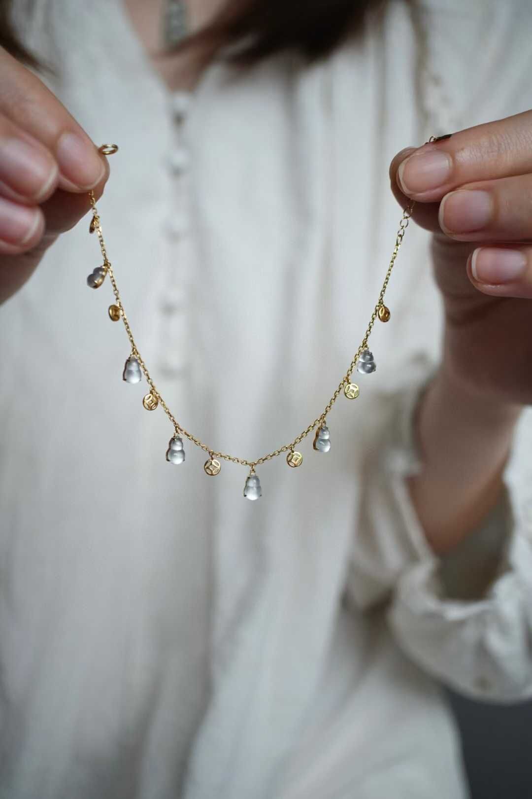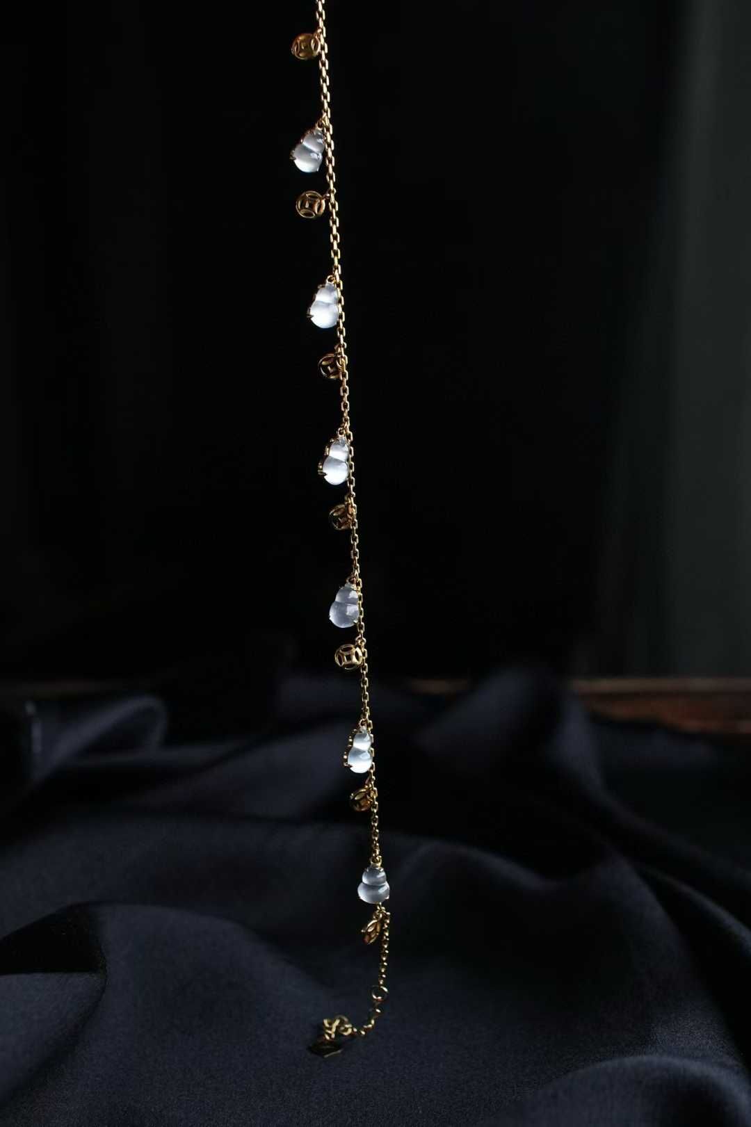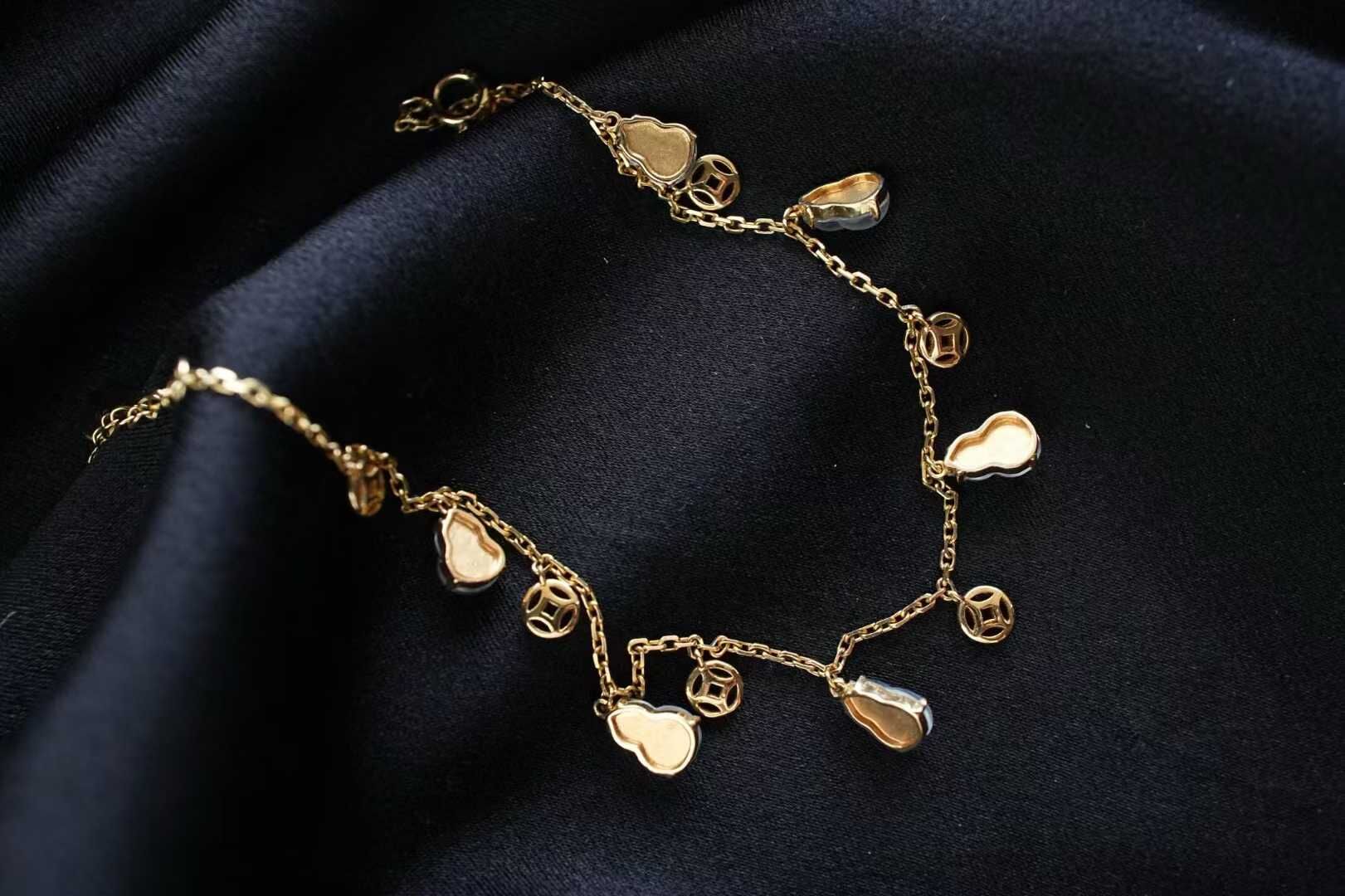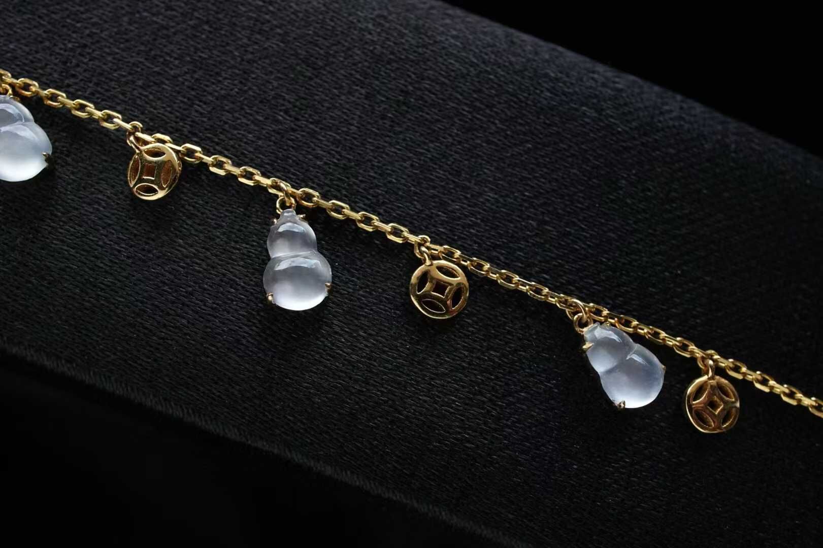 天然翡翠A玉,緬料玻璃種,每一顆葫蘆都在發光的即視感,起鋼光,靈氣滿滿。18K金鑲嵌,中間以古典銅錢銜接,寓意“福祿”,上手靈動精緻。
