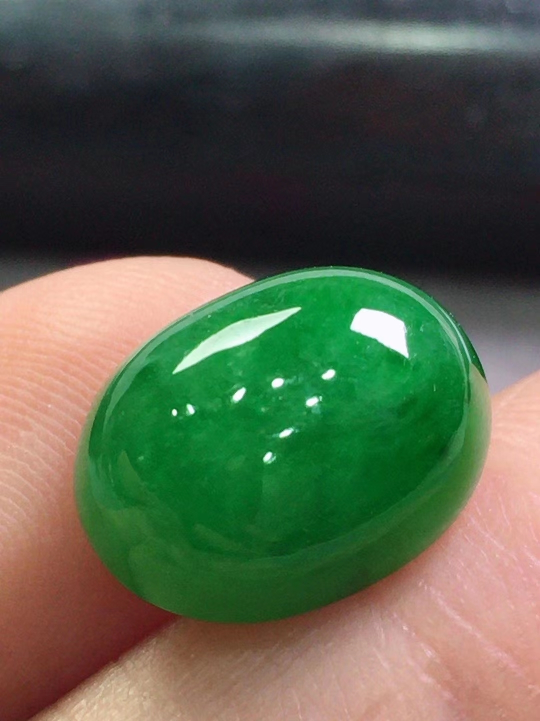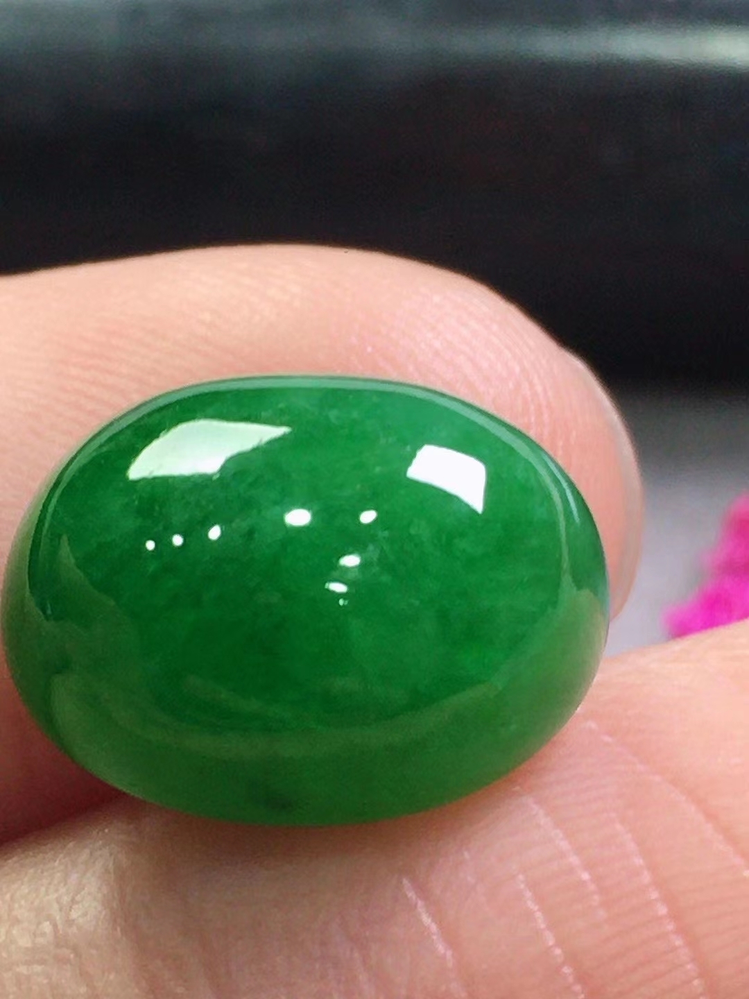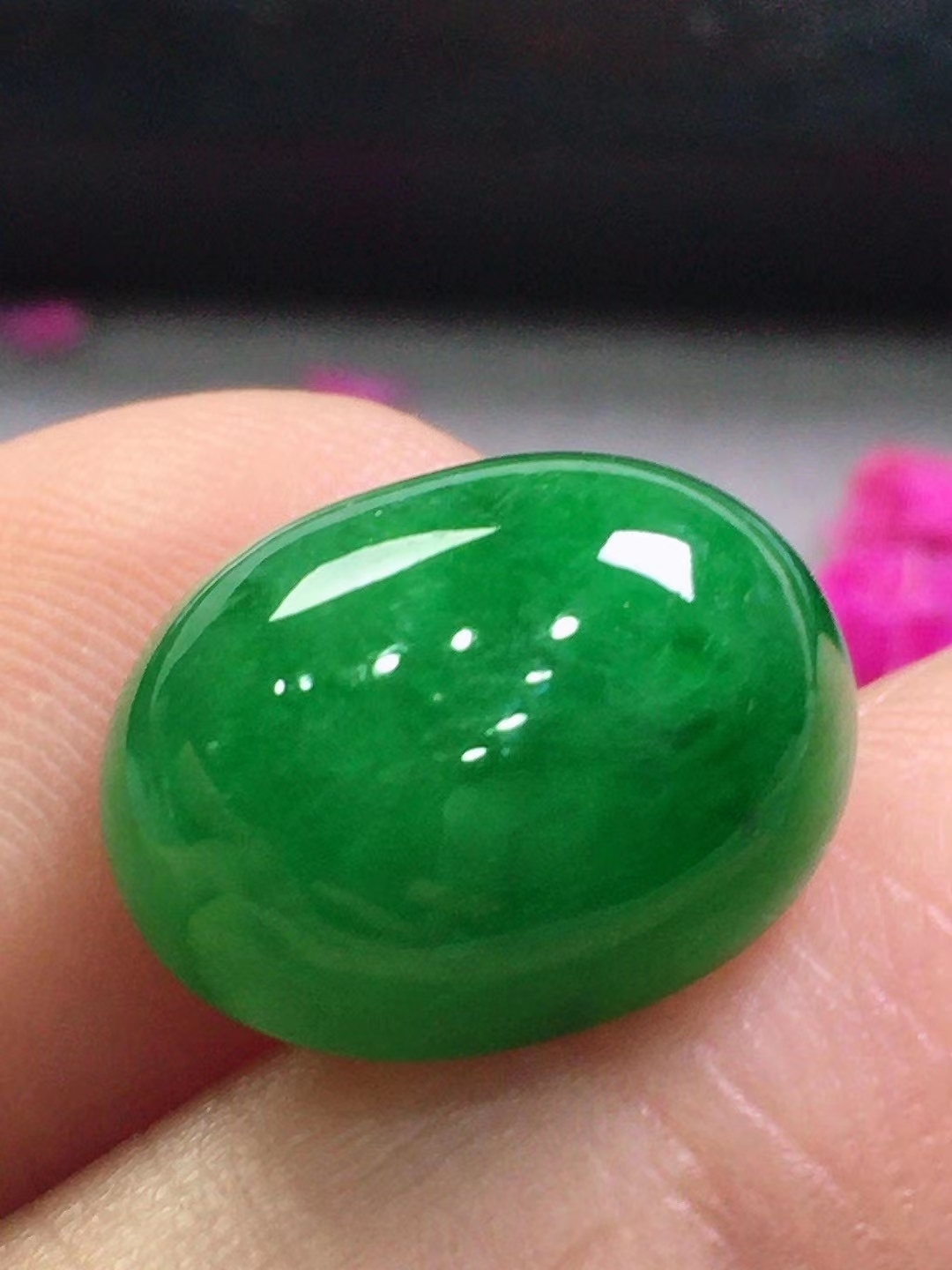 天然翡翠A玉,飽滿,辣陽綠,鮮豔奪目,厚裝,鑲嵌後價值倍增,完美無紋裂,這粒夠辣、夠水,而且夠「卜」夠厚,鑲戒指一流!