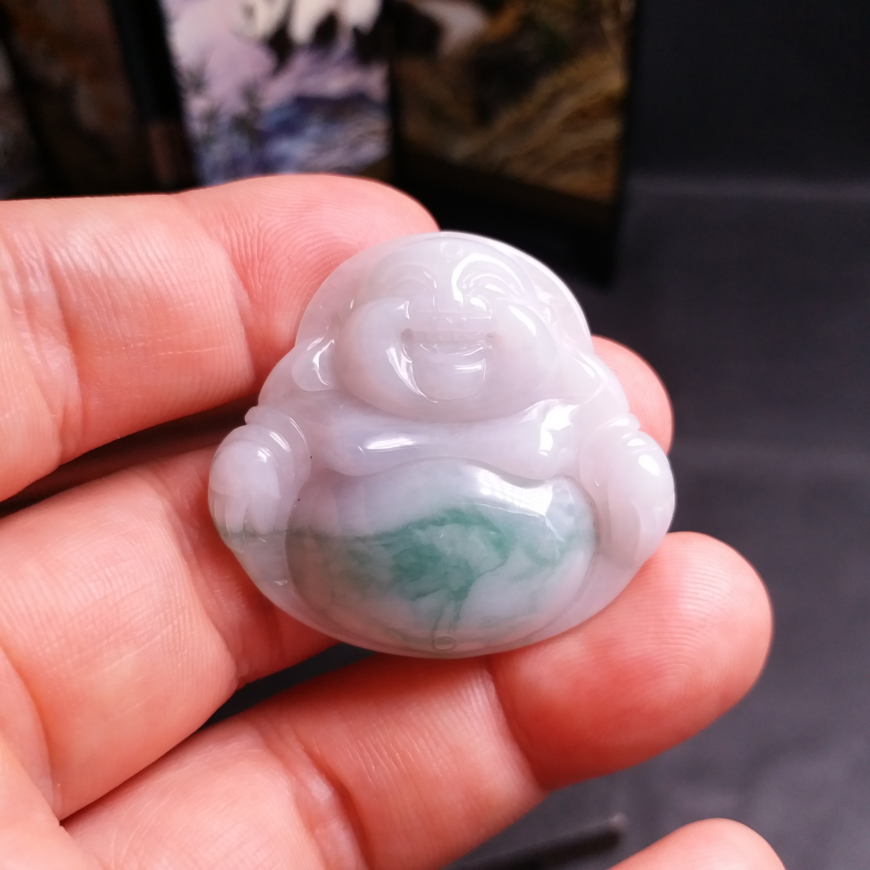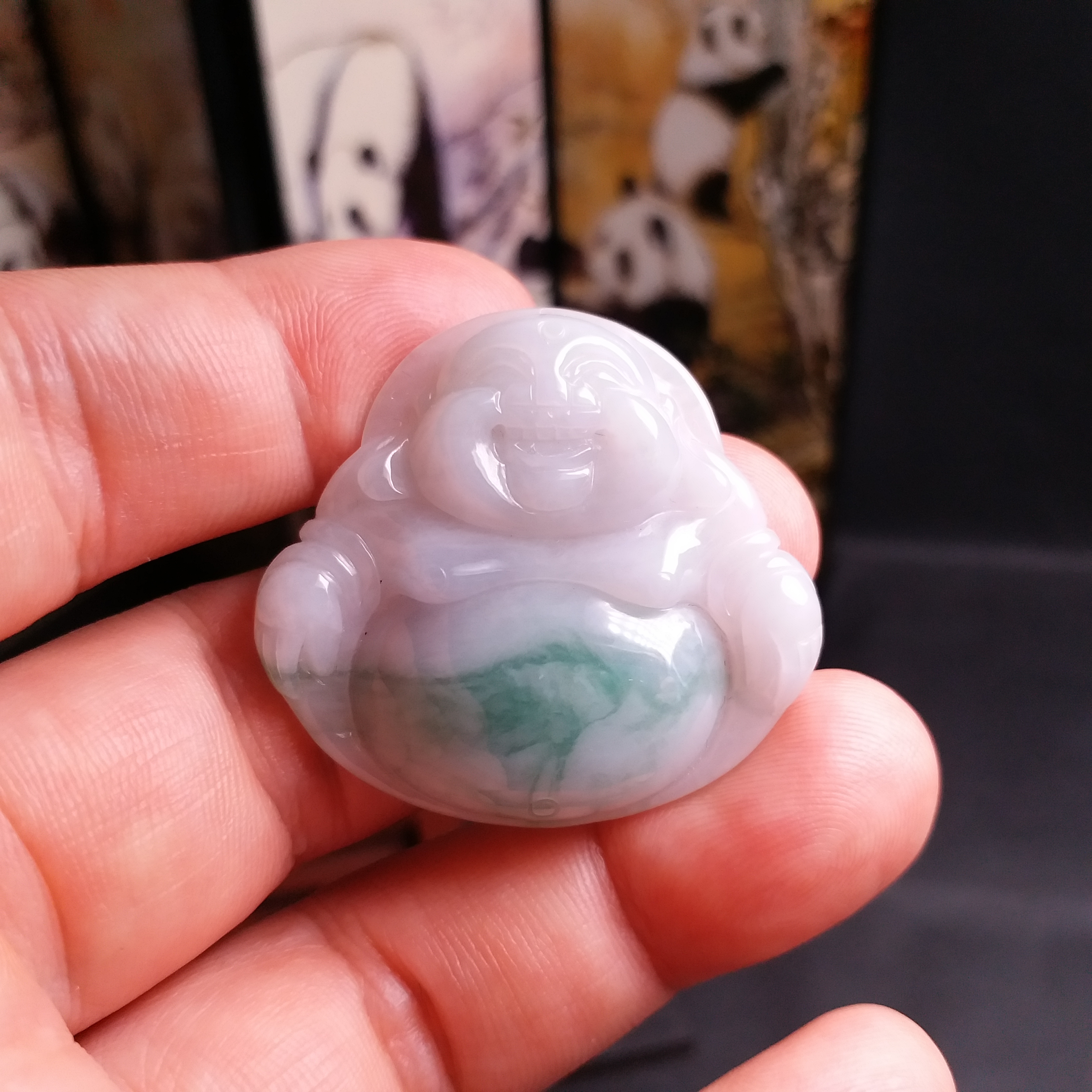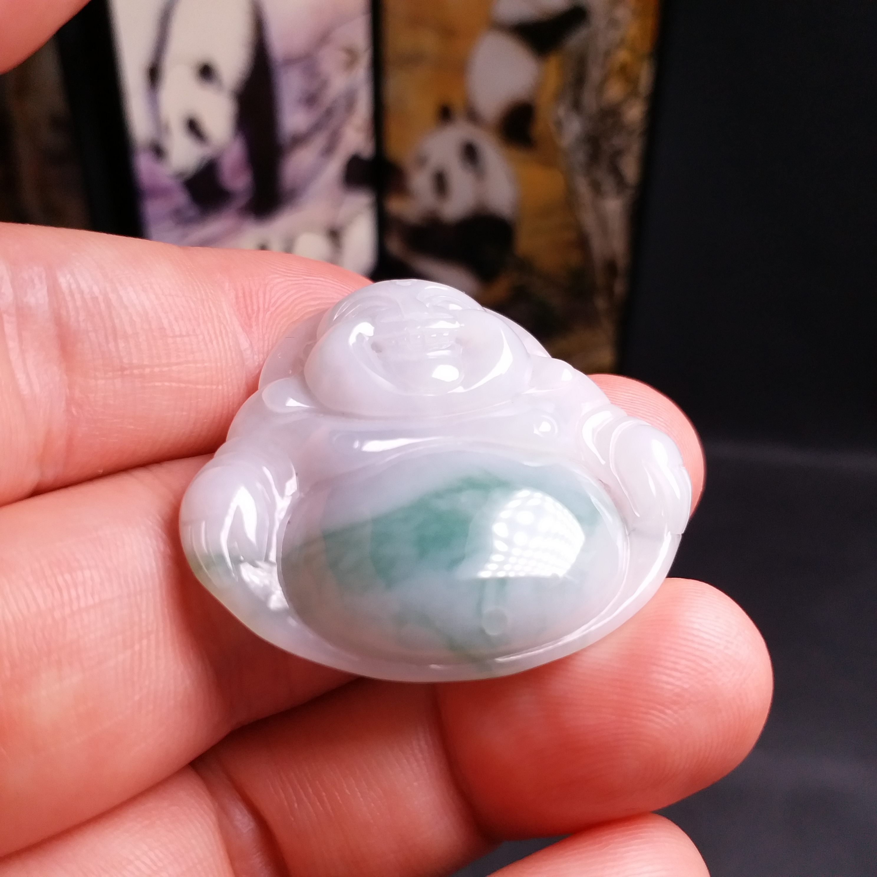 • 冰糯白底飄花笑佛吊墜, 天然翡翠A玉, 緬甸玉, Jade, Jadeite