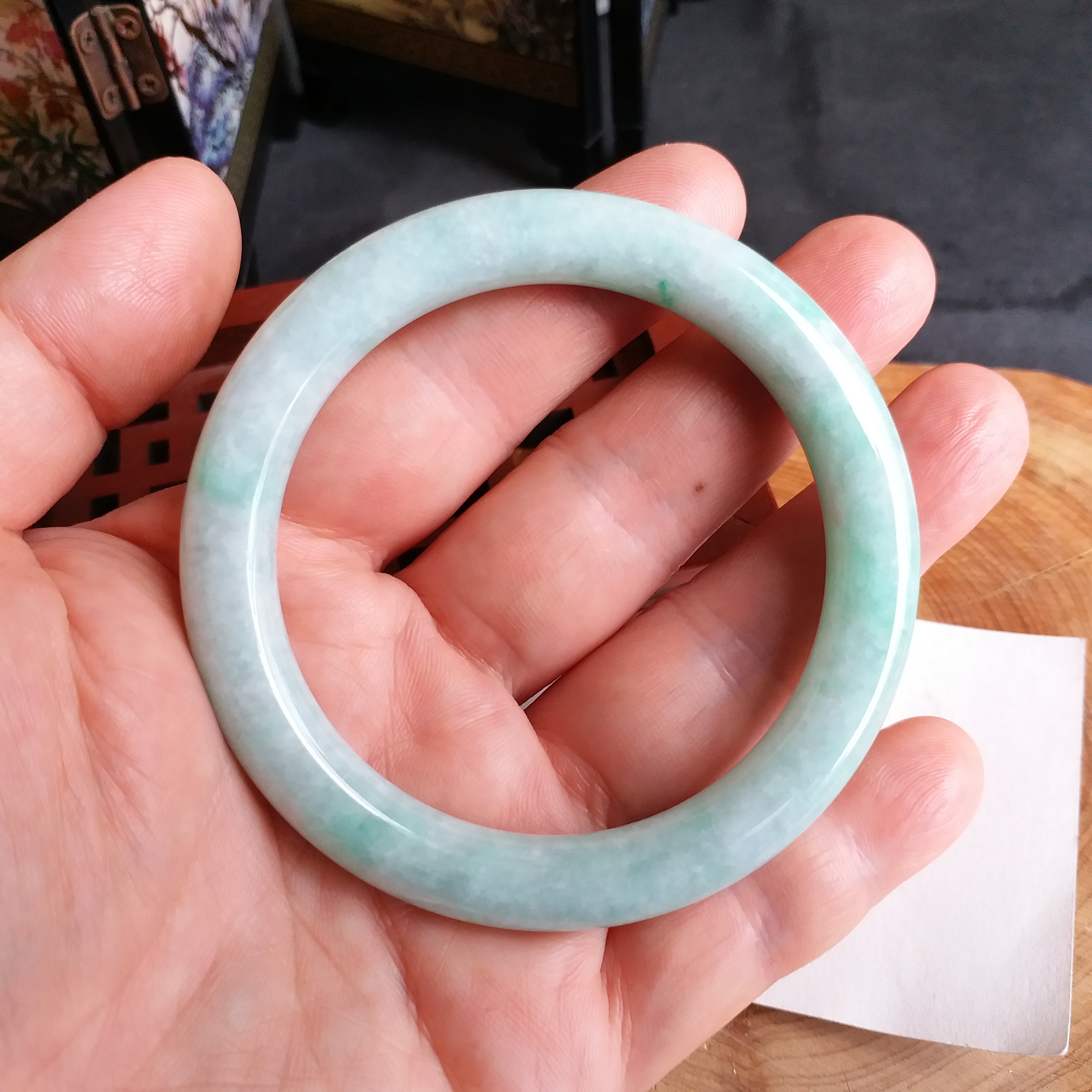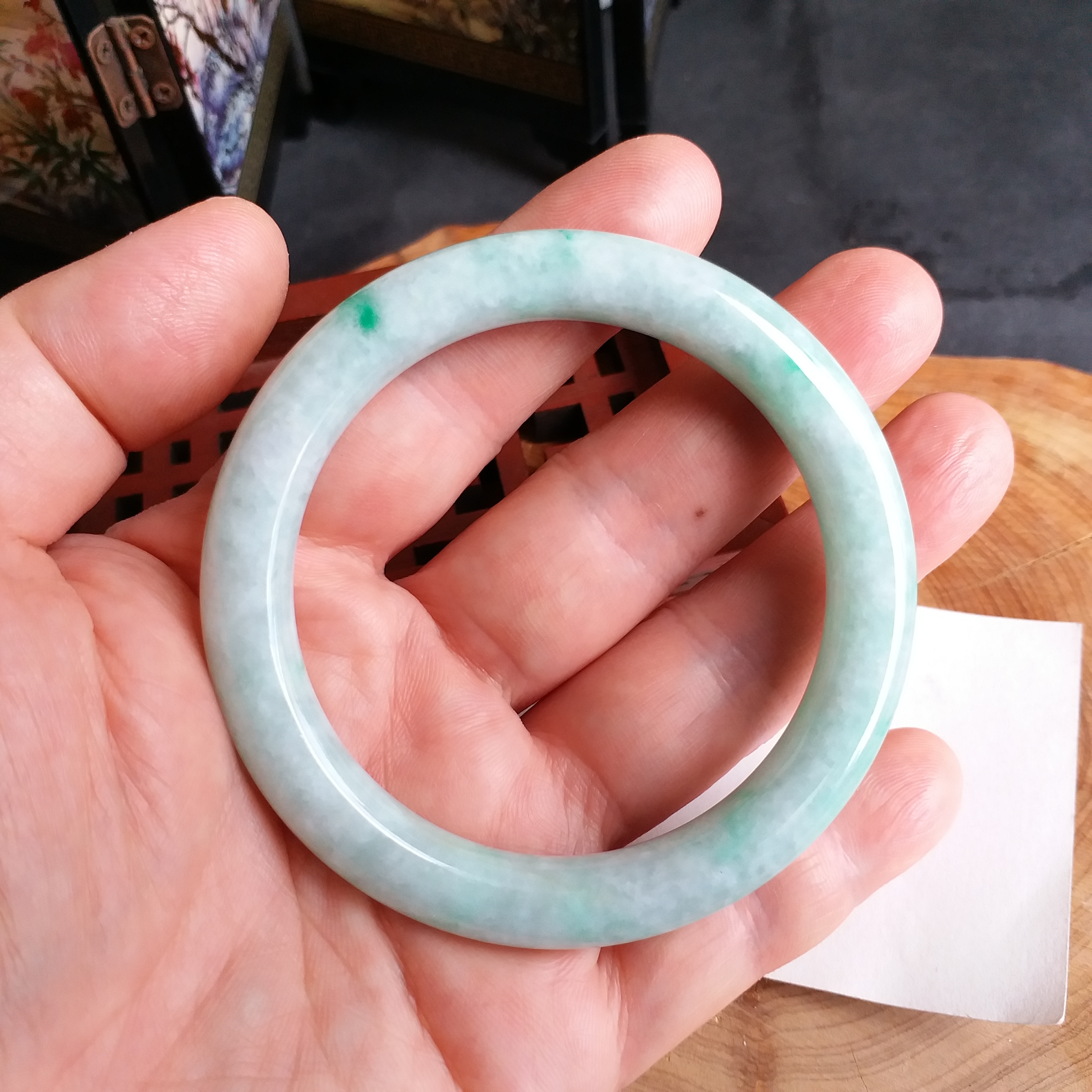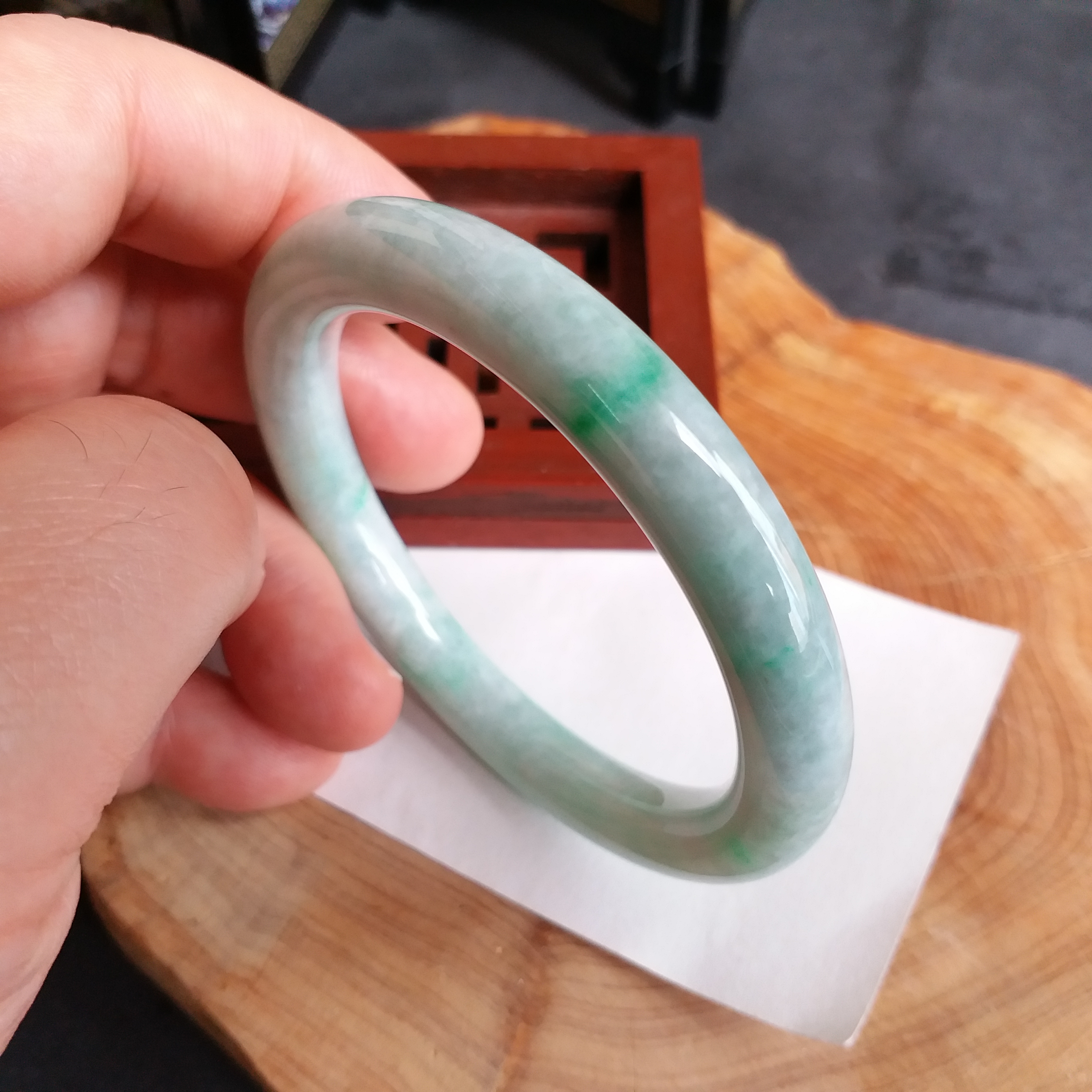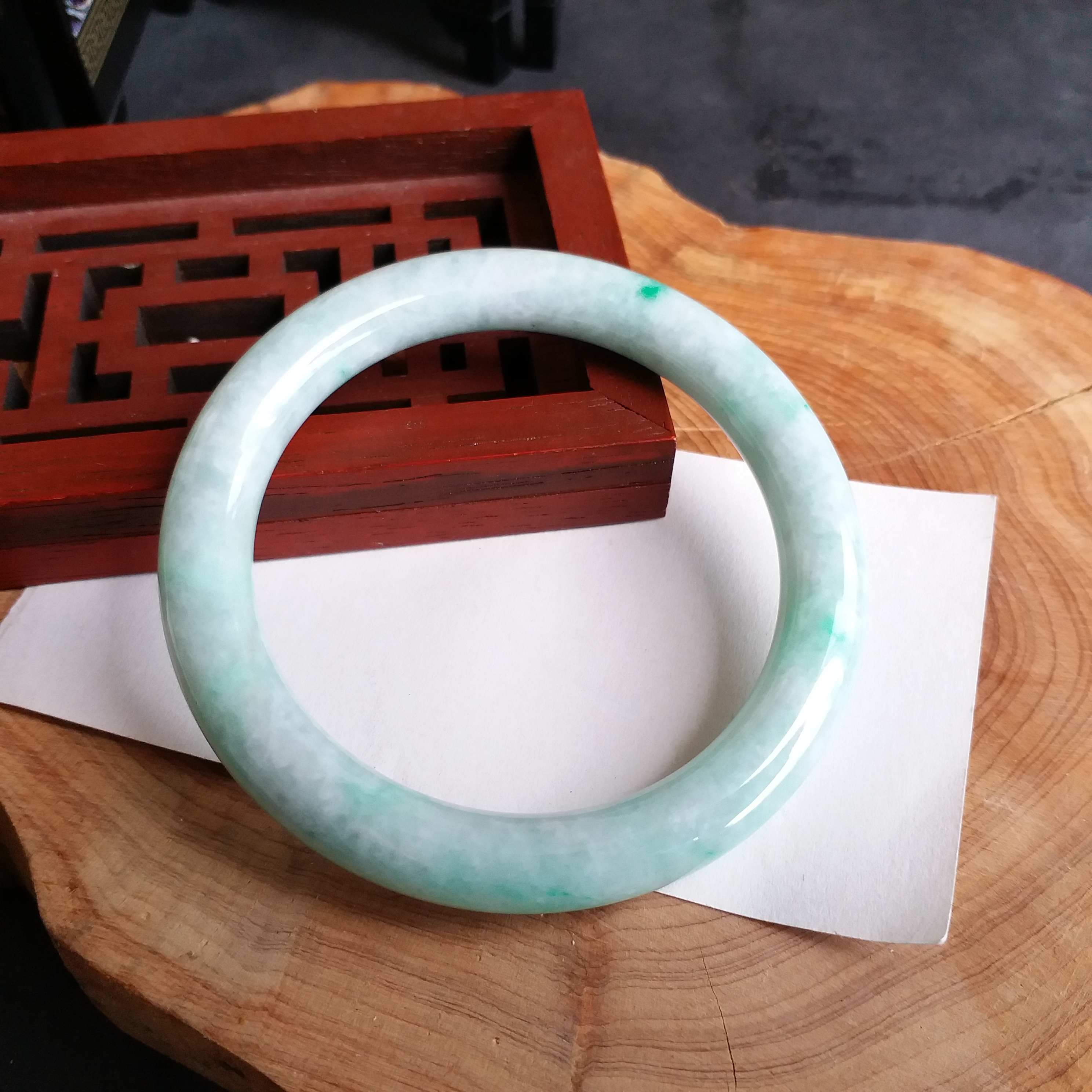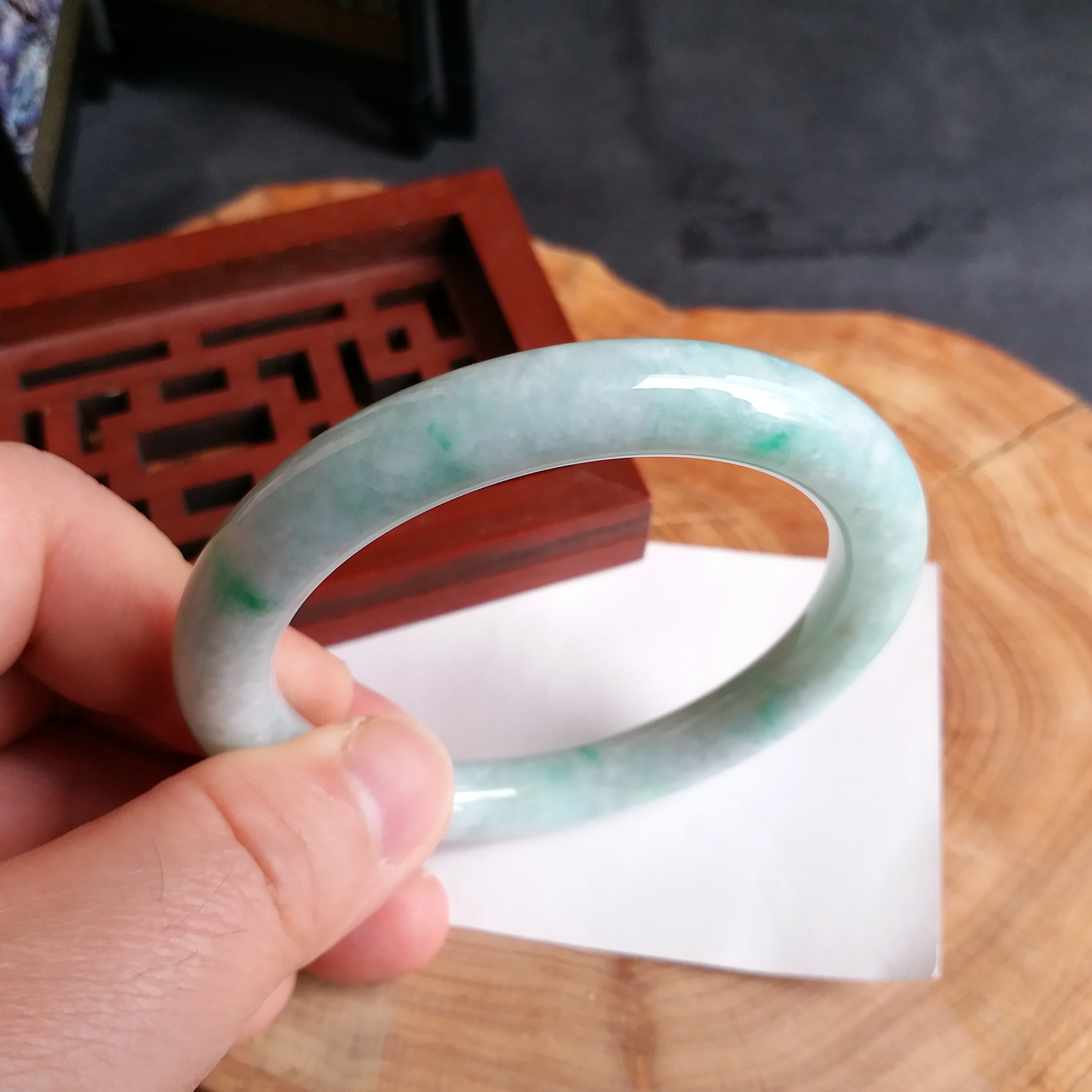 • 冰糯飄綠花圓條玉鐲 55mm, 天然翡翠A玉, 緬甸玉, Jade, Jadeite