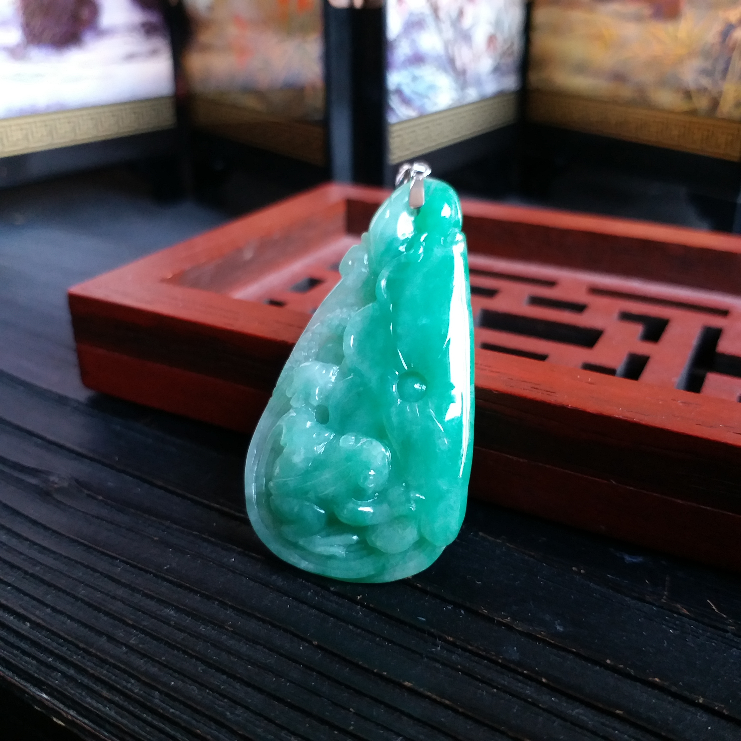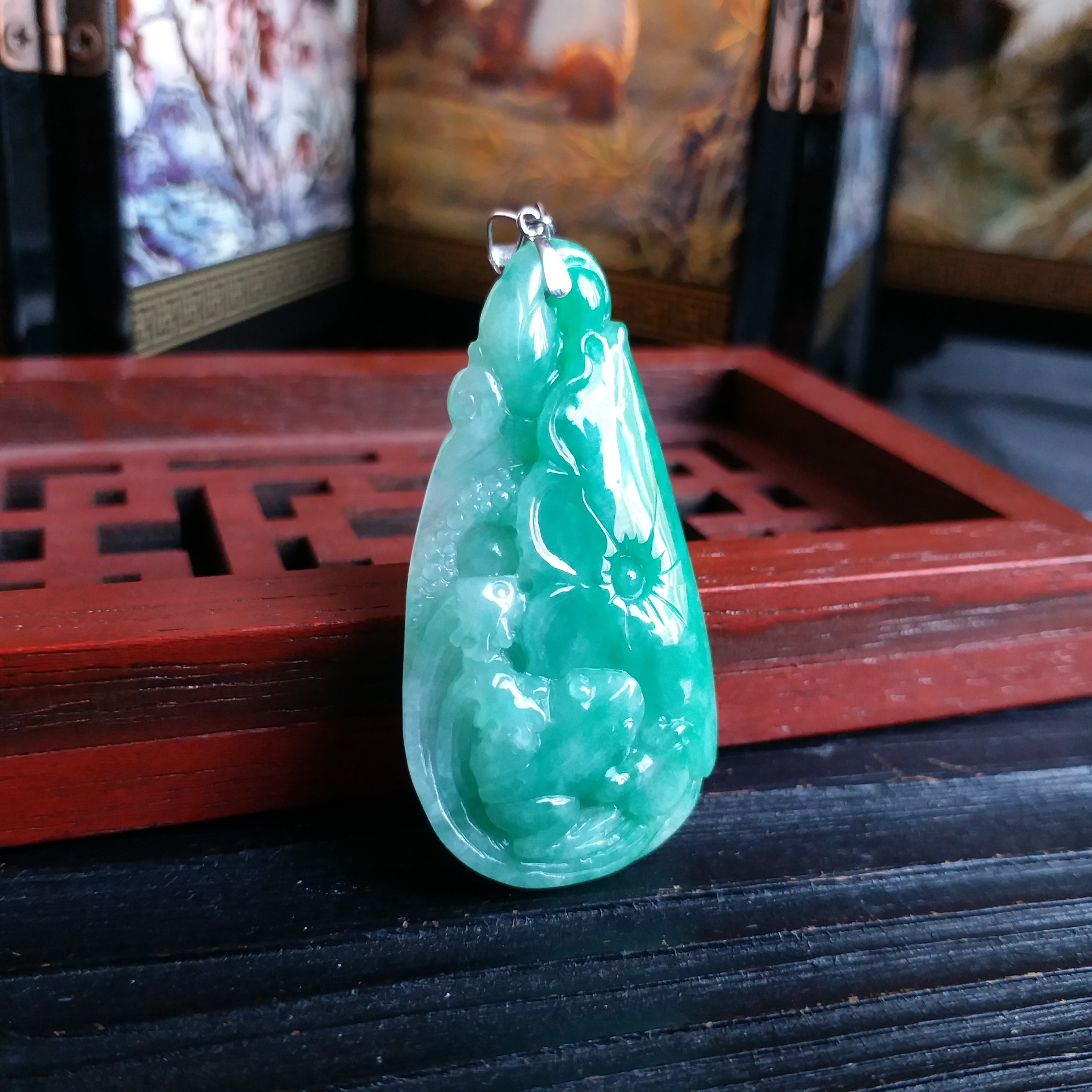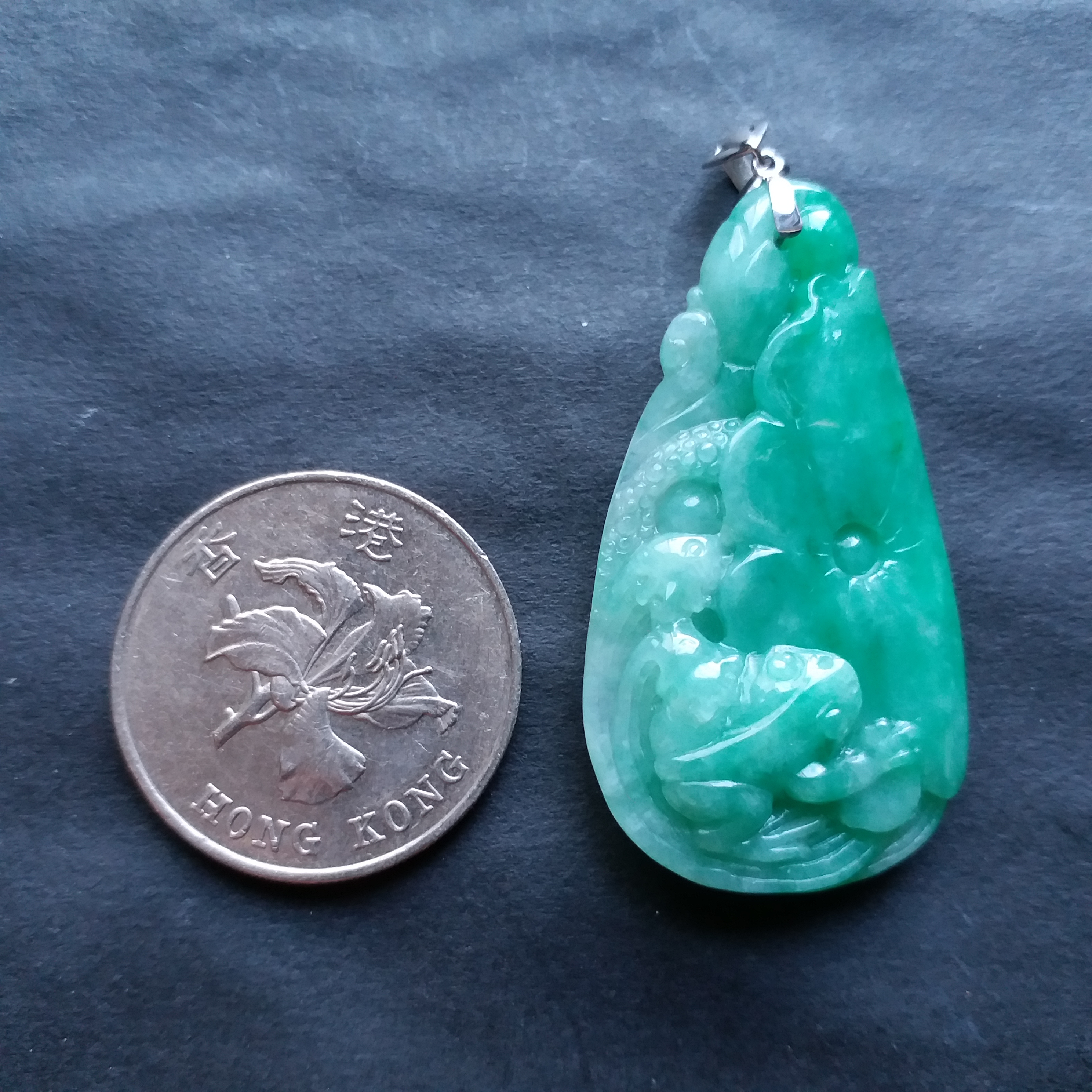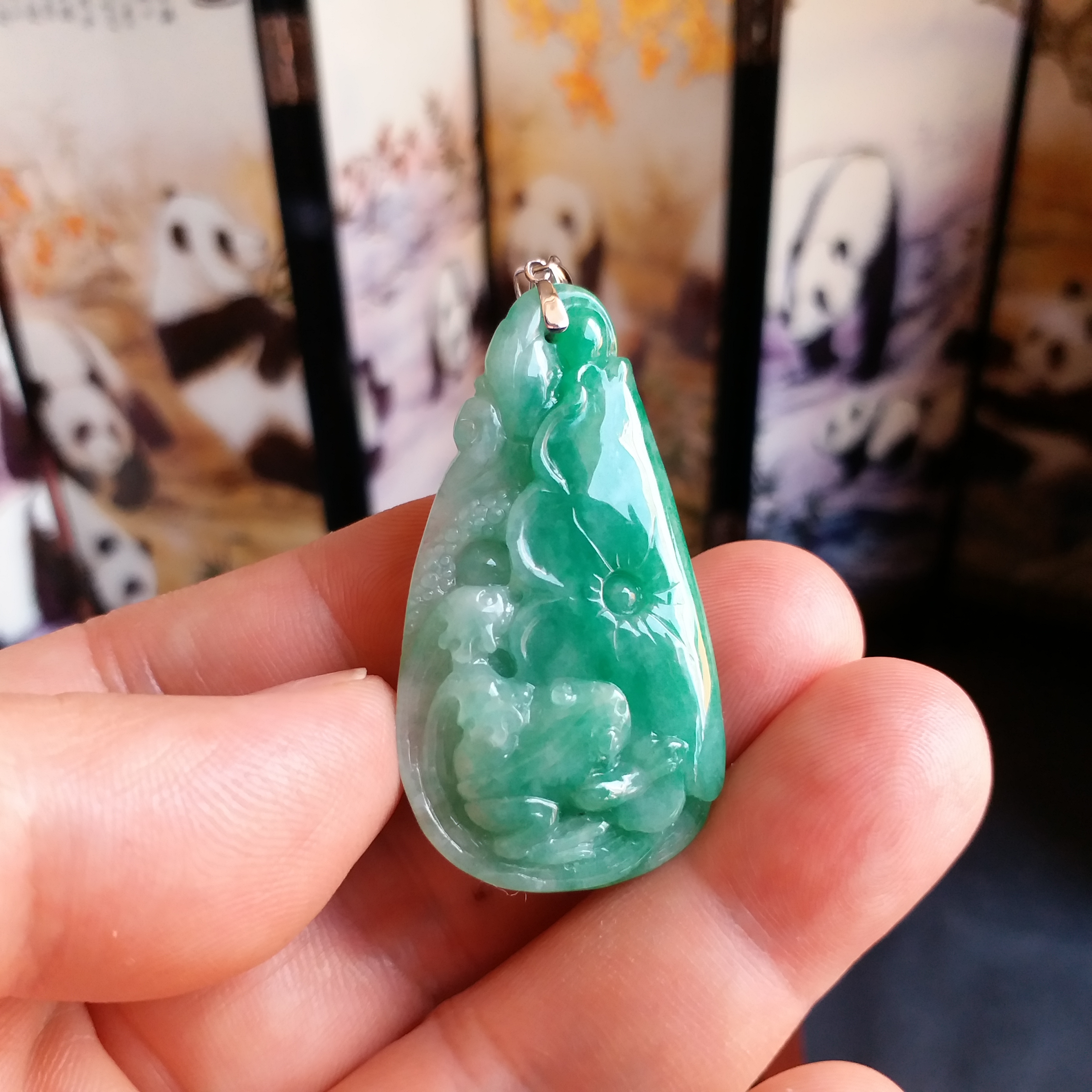 • 冰糯陽綠蓮葉金蟾+18K金扣吊墜, 天然翡翠A玉, 緬甸玉, Jade, Jadeite