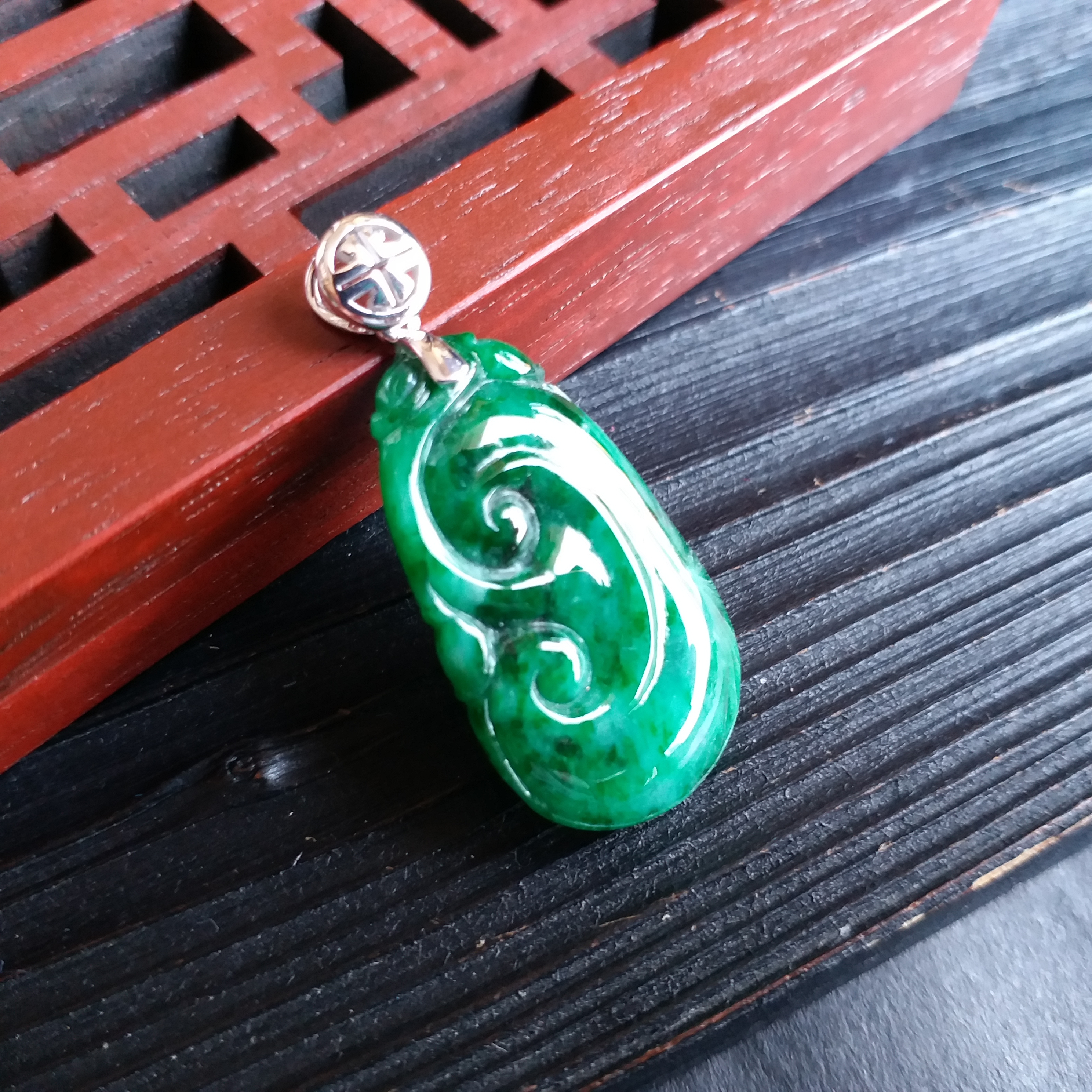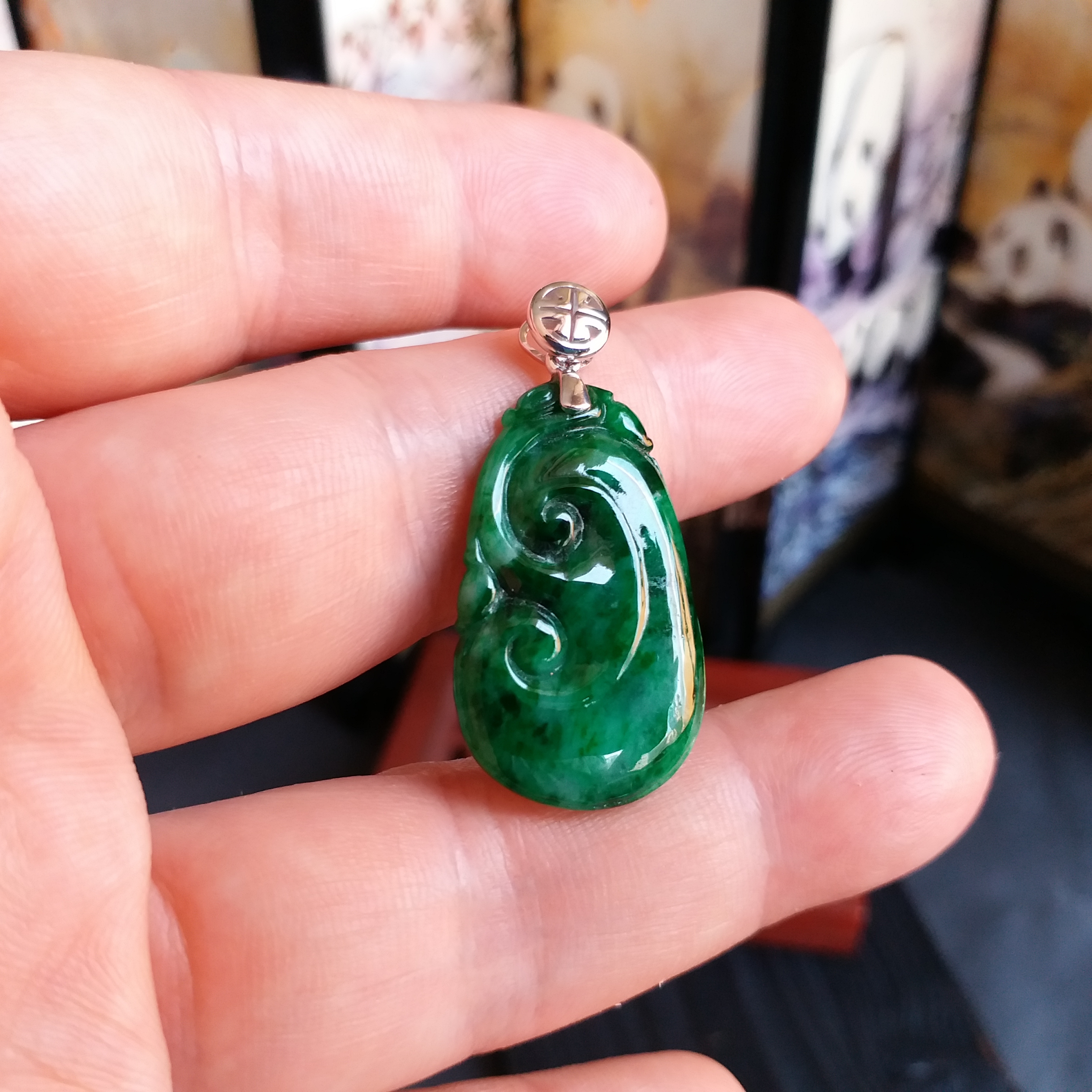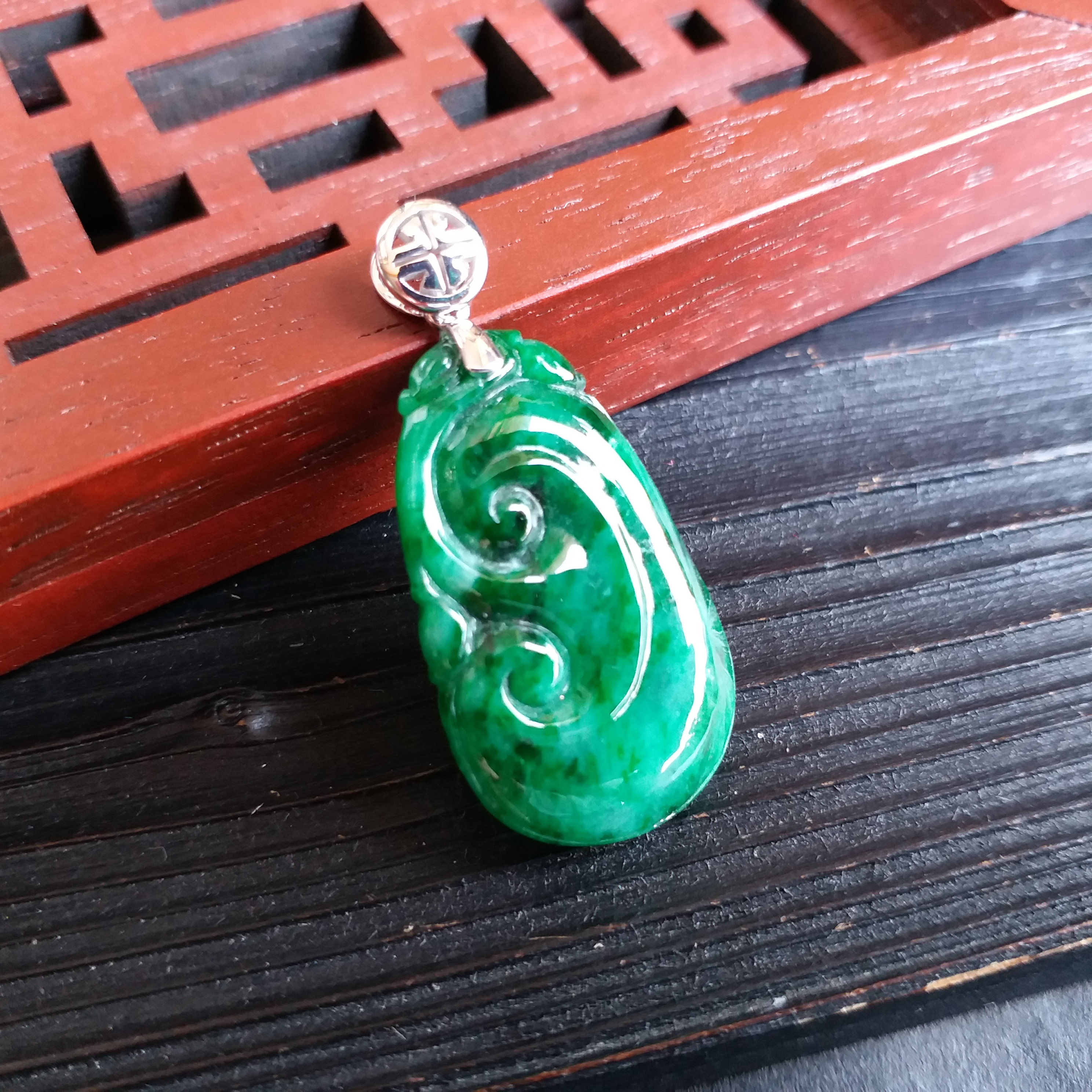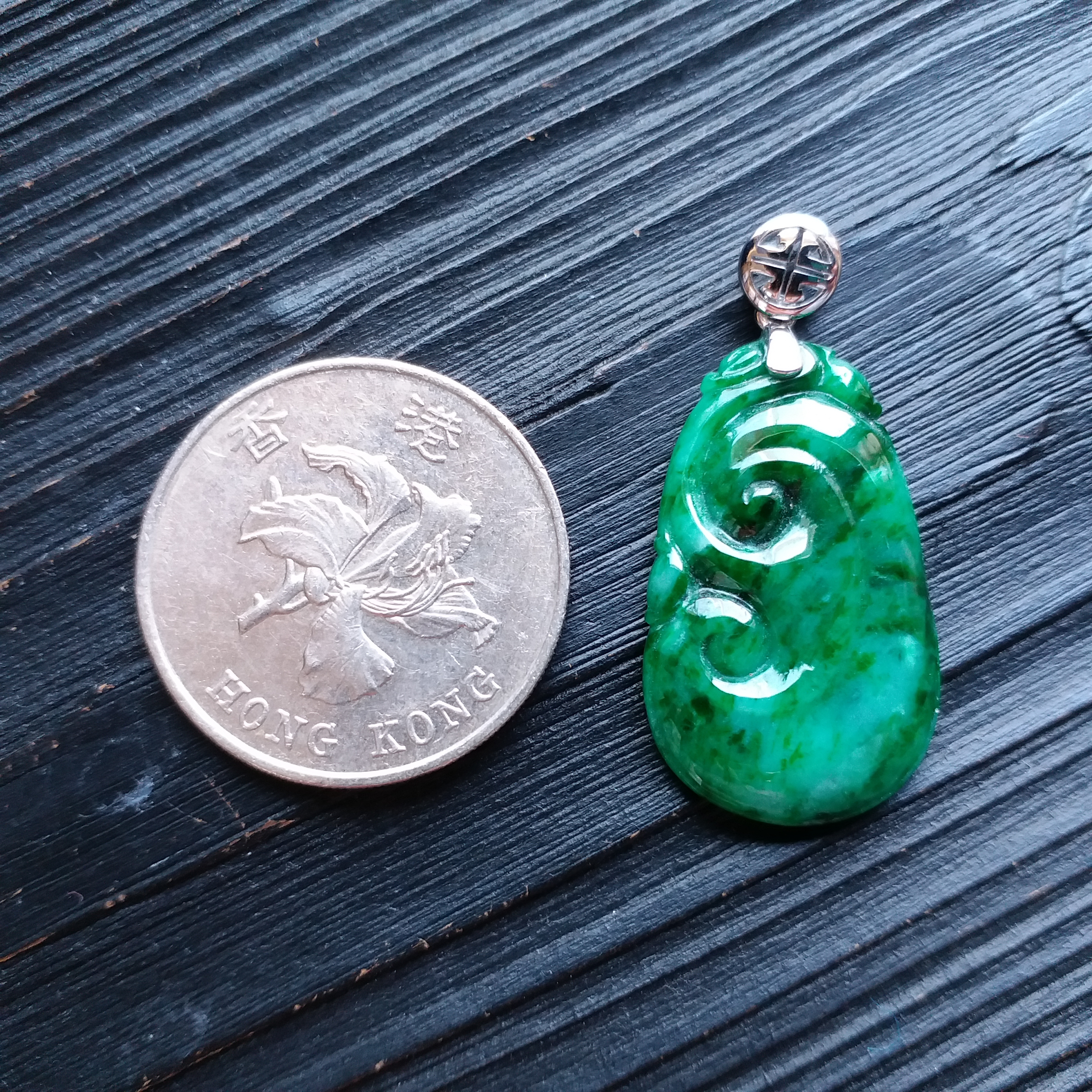 • 老坑冰糯滿綠如意+18K金扣吊墜, 天然翡翠A玉, 緬甸玉, Jade, Jadeite