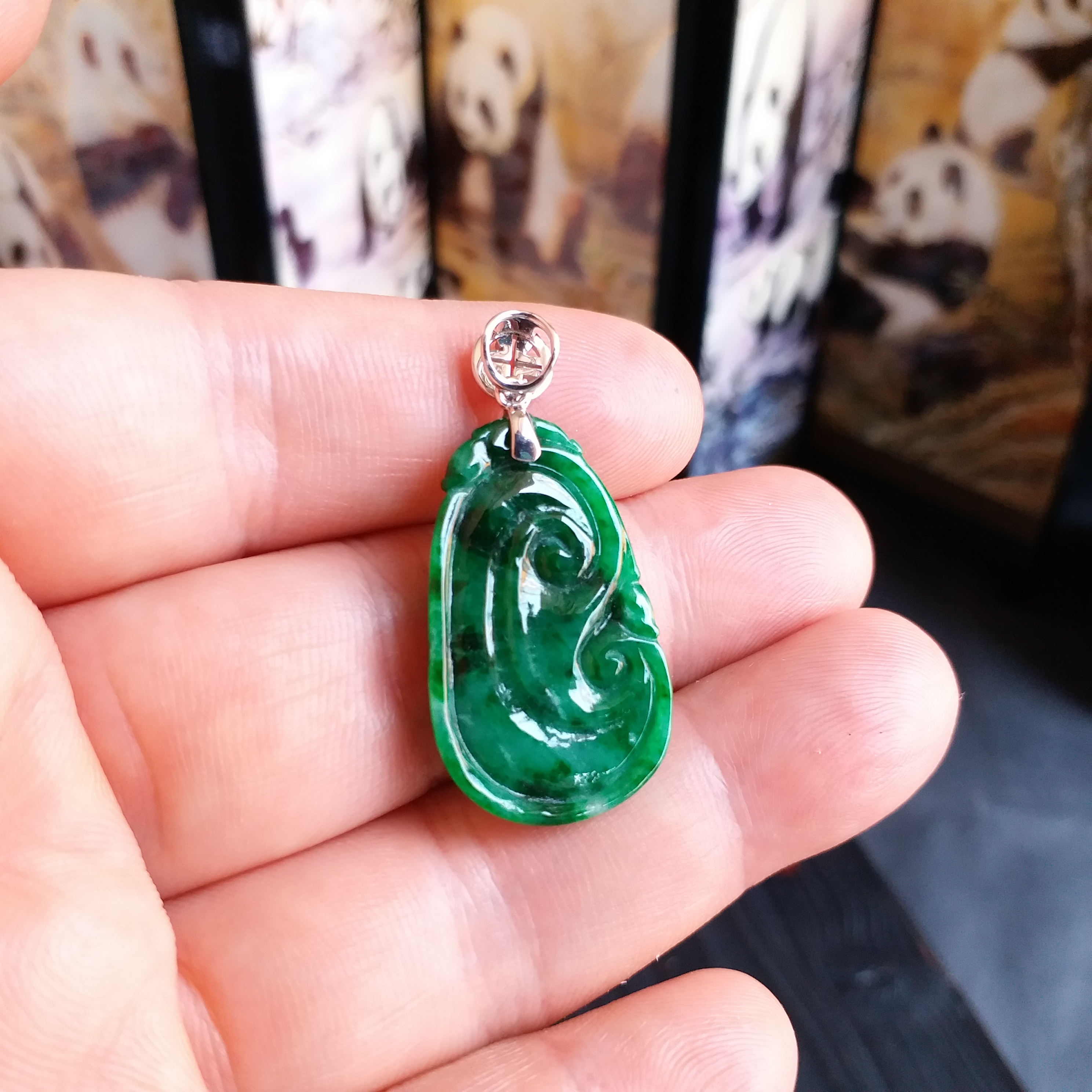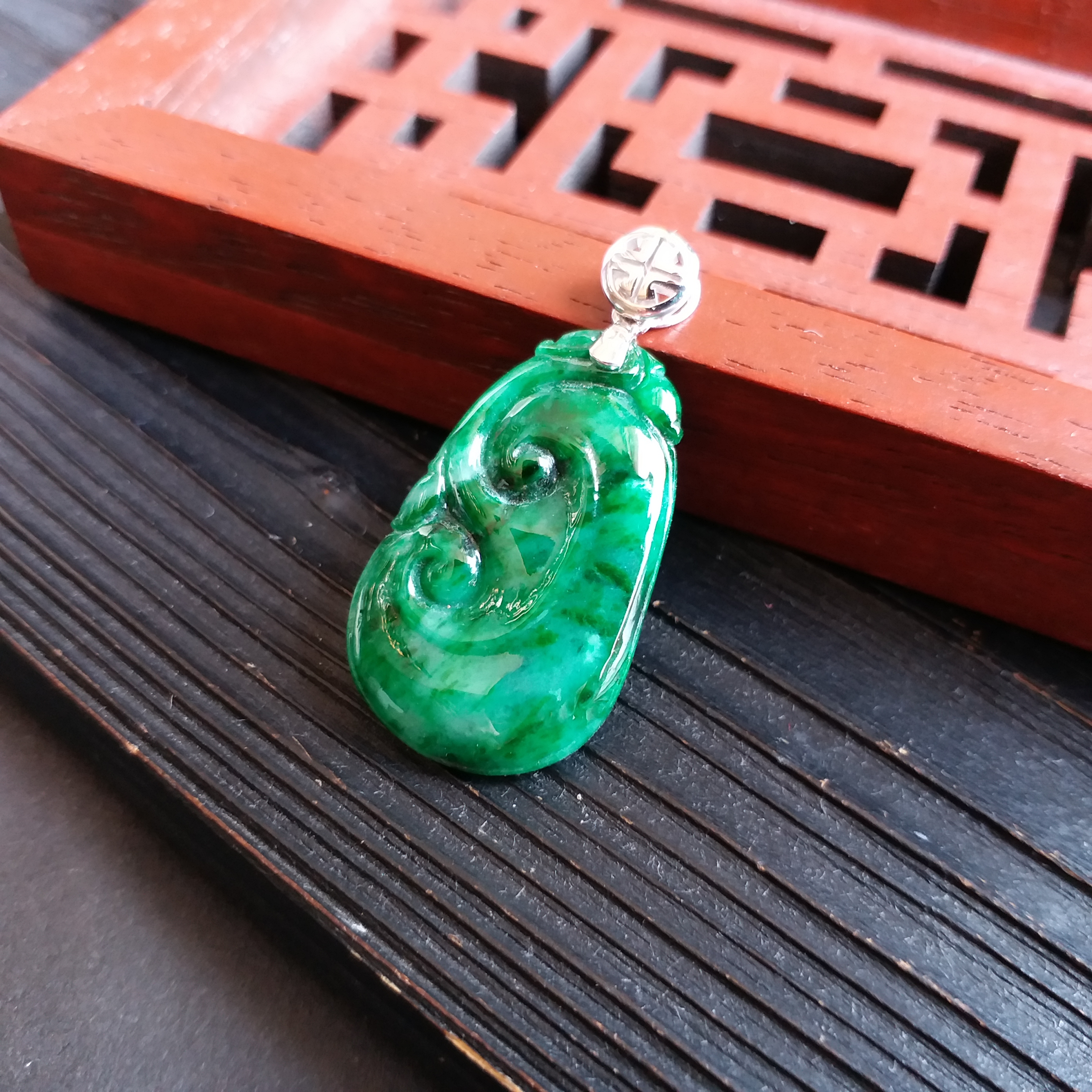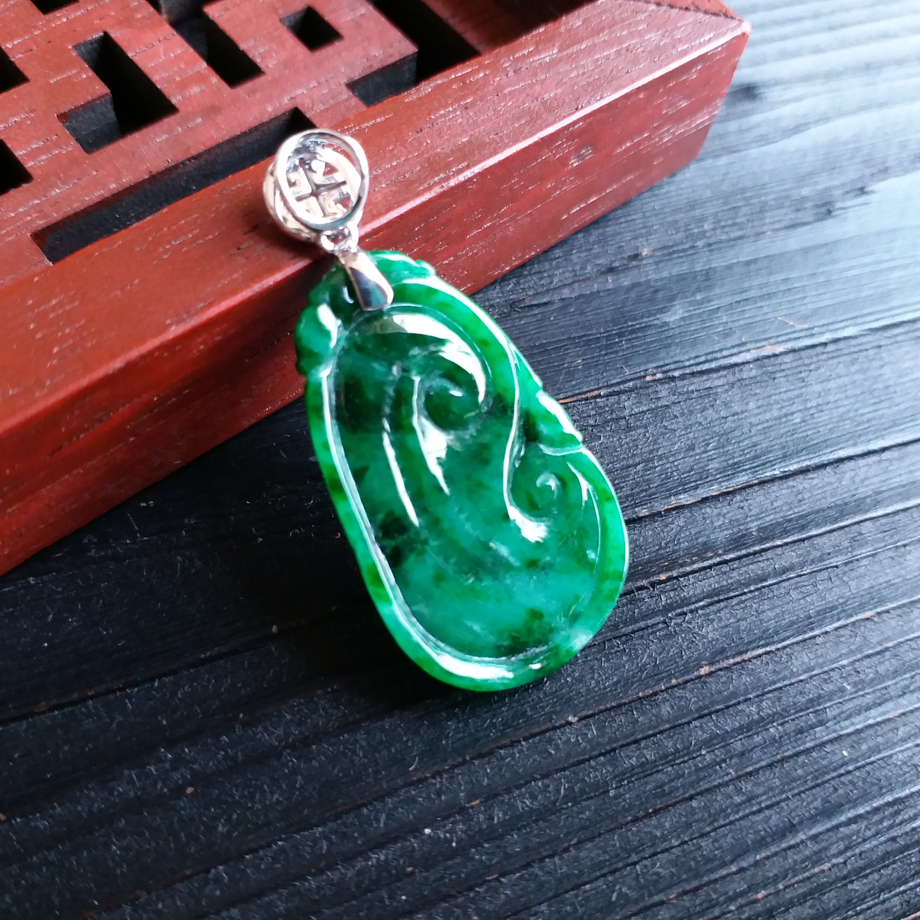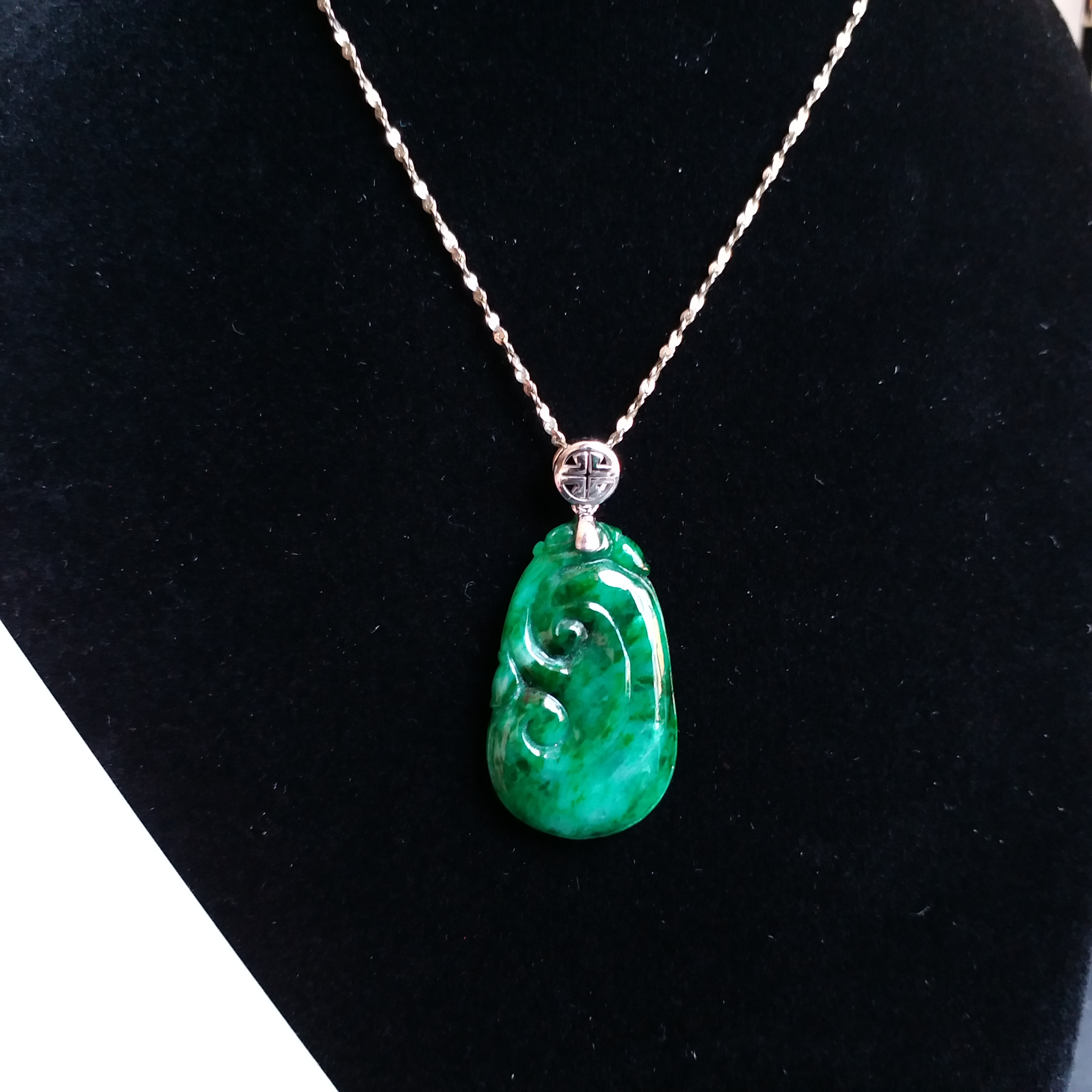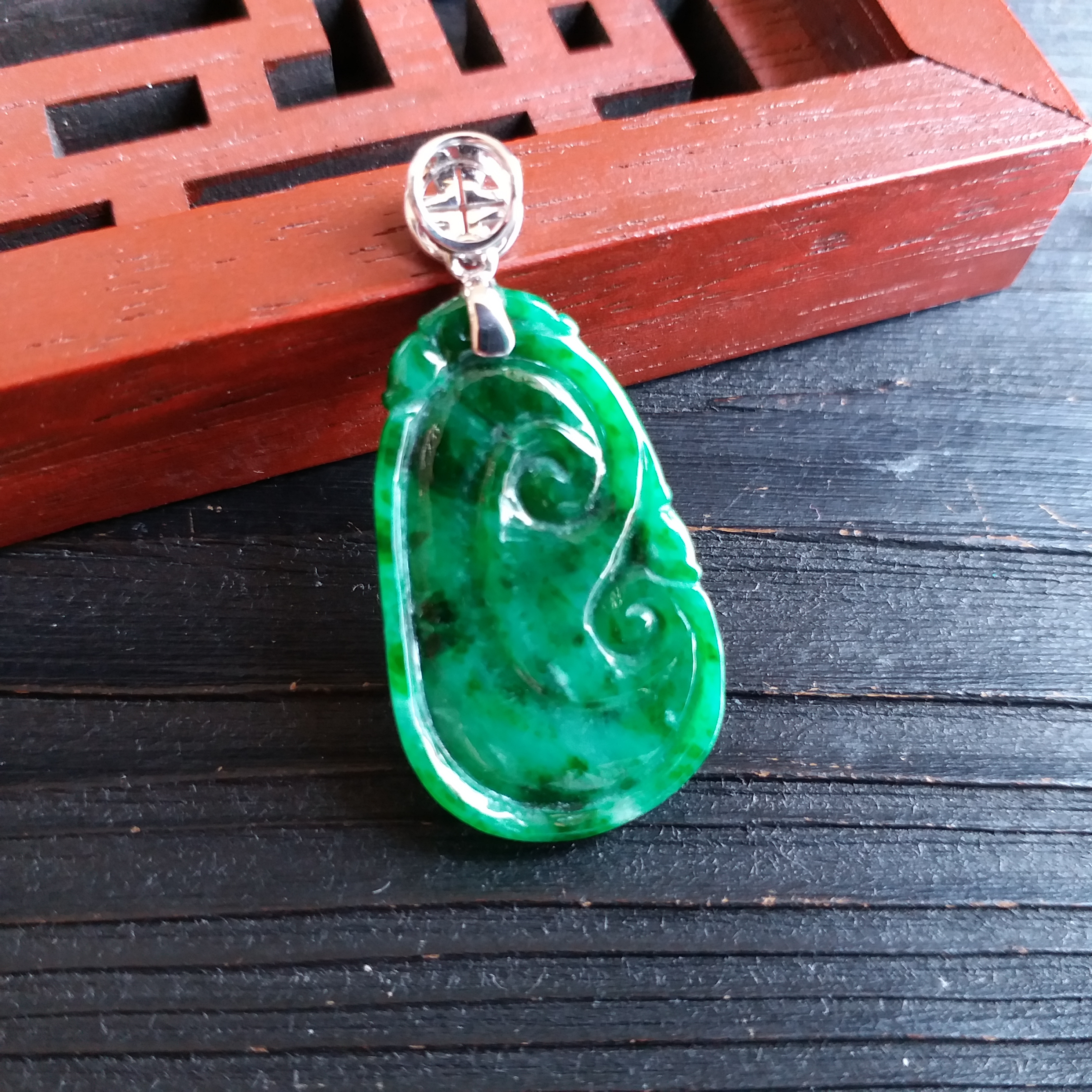 • 老坑冰糯滿綠如意+18K金扣吊墜, 天然翡翠A玉, 緬甸玉, Jade, Jadeite