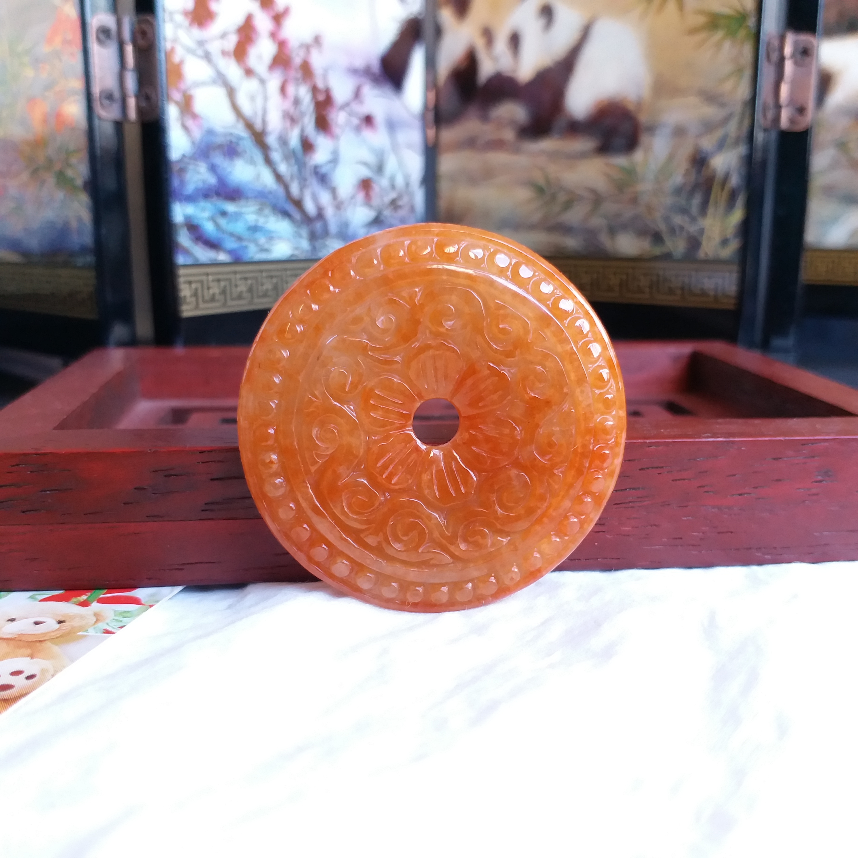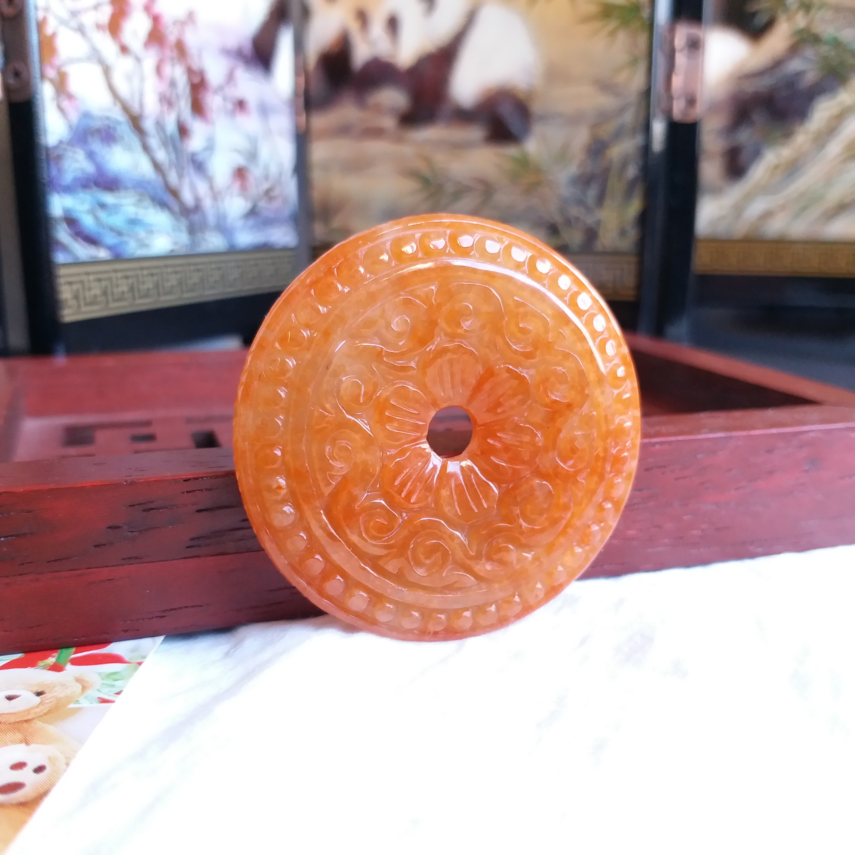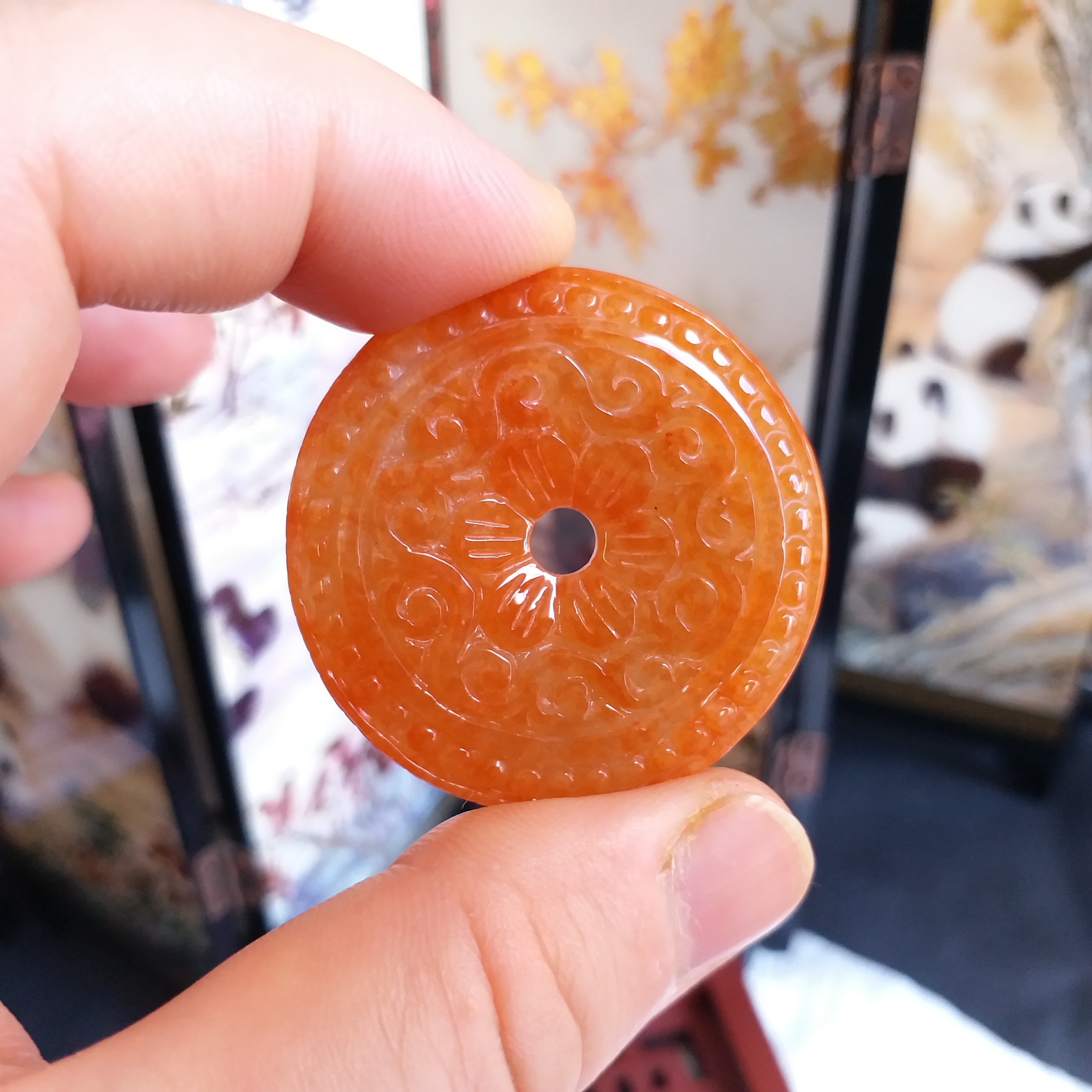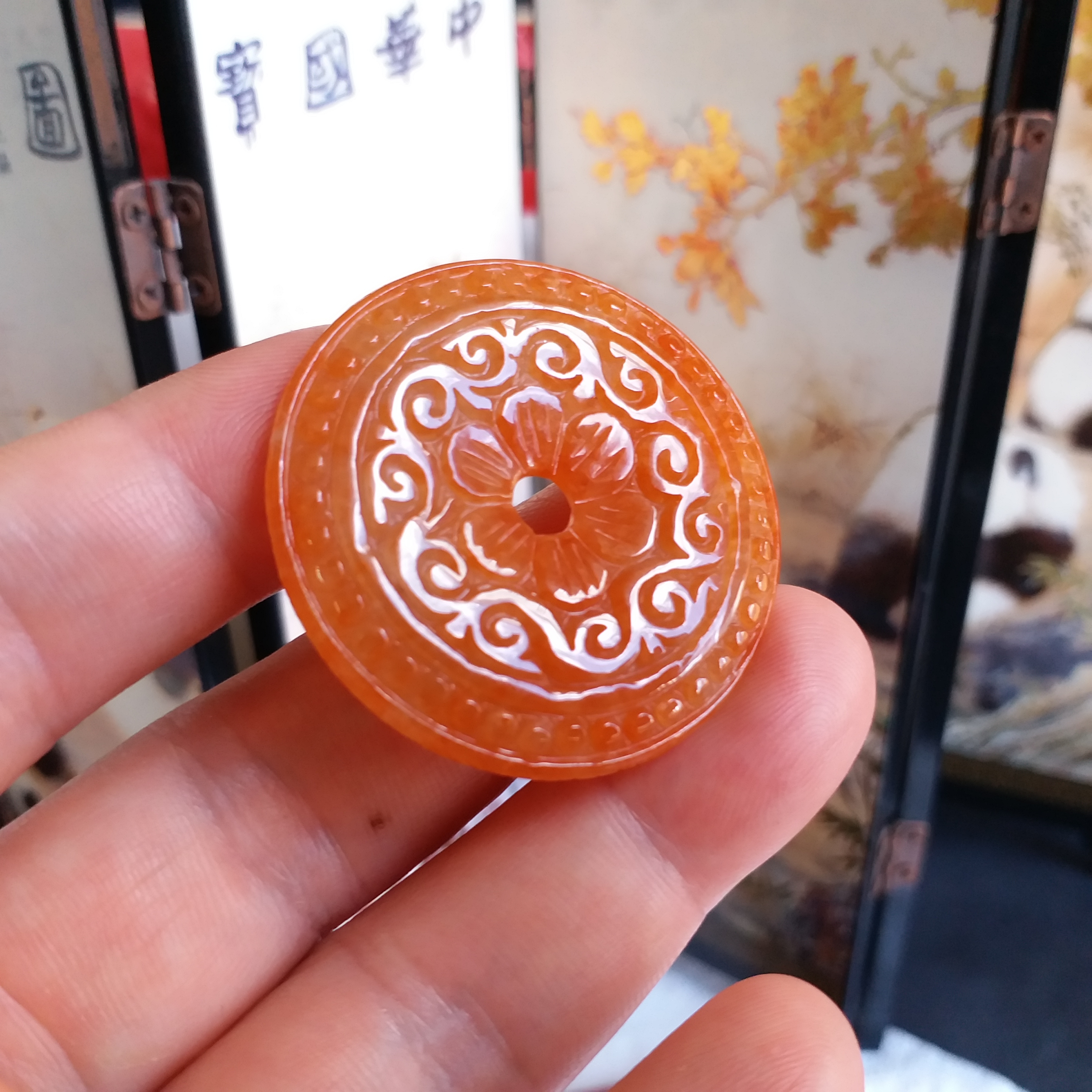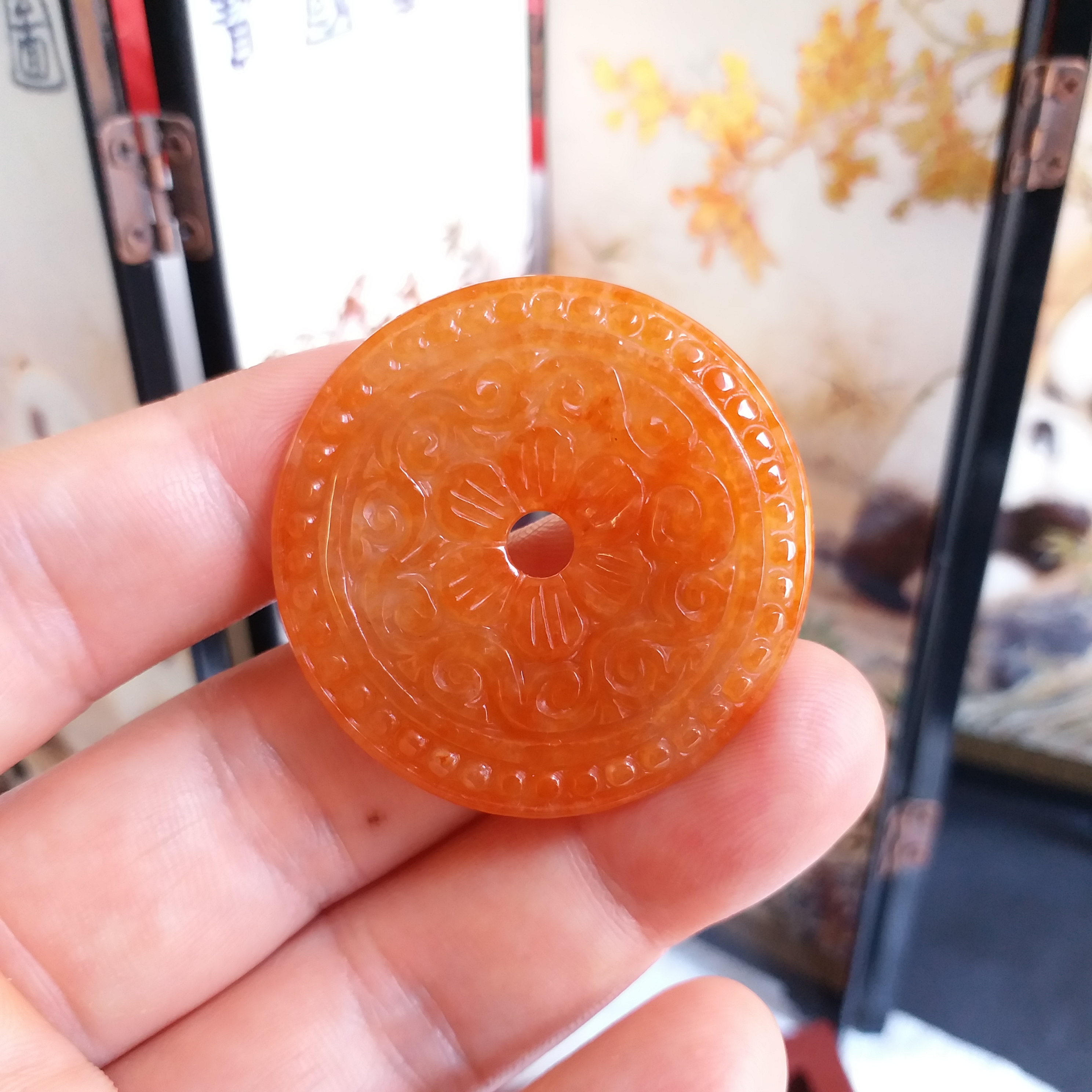 • 冰糯紅翡雕花平安扣 (38.8mm直徑), 天然翡翠A玉, 緬甸玉, Jade, Jadeite