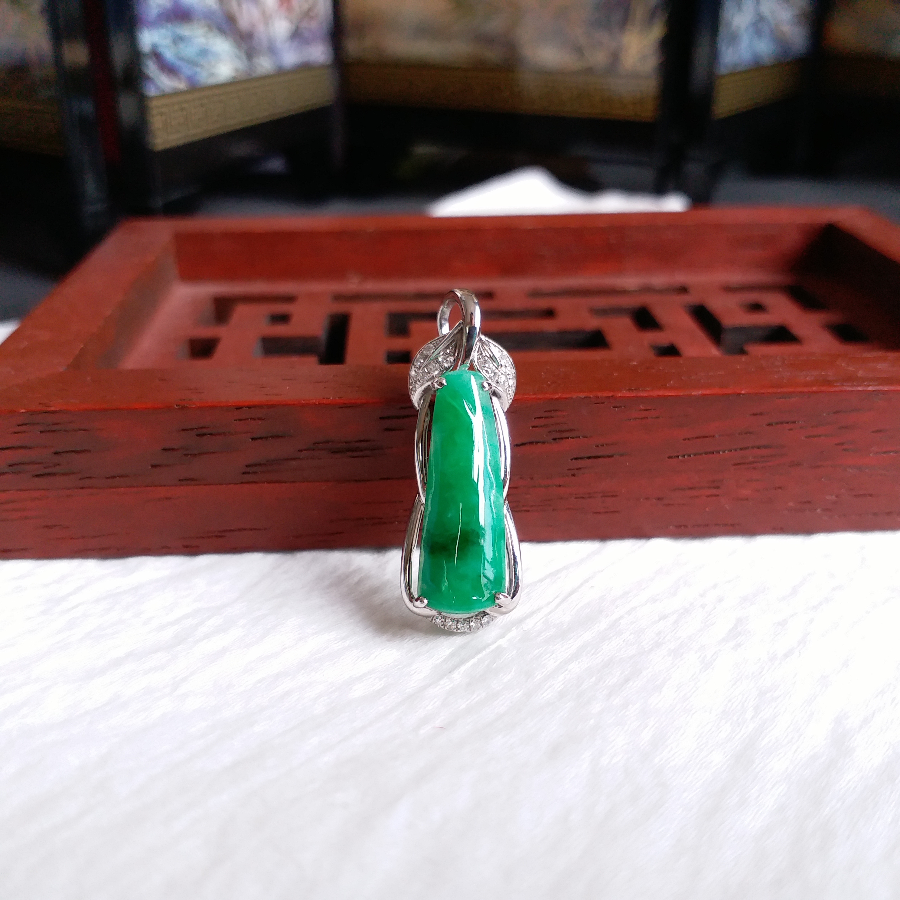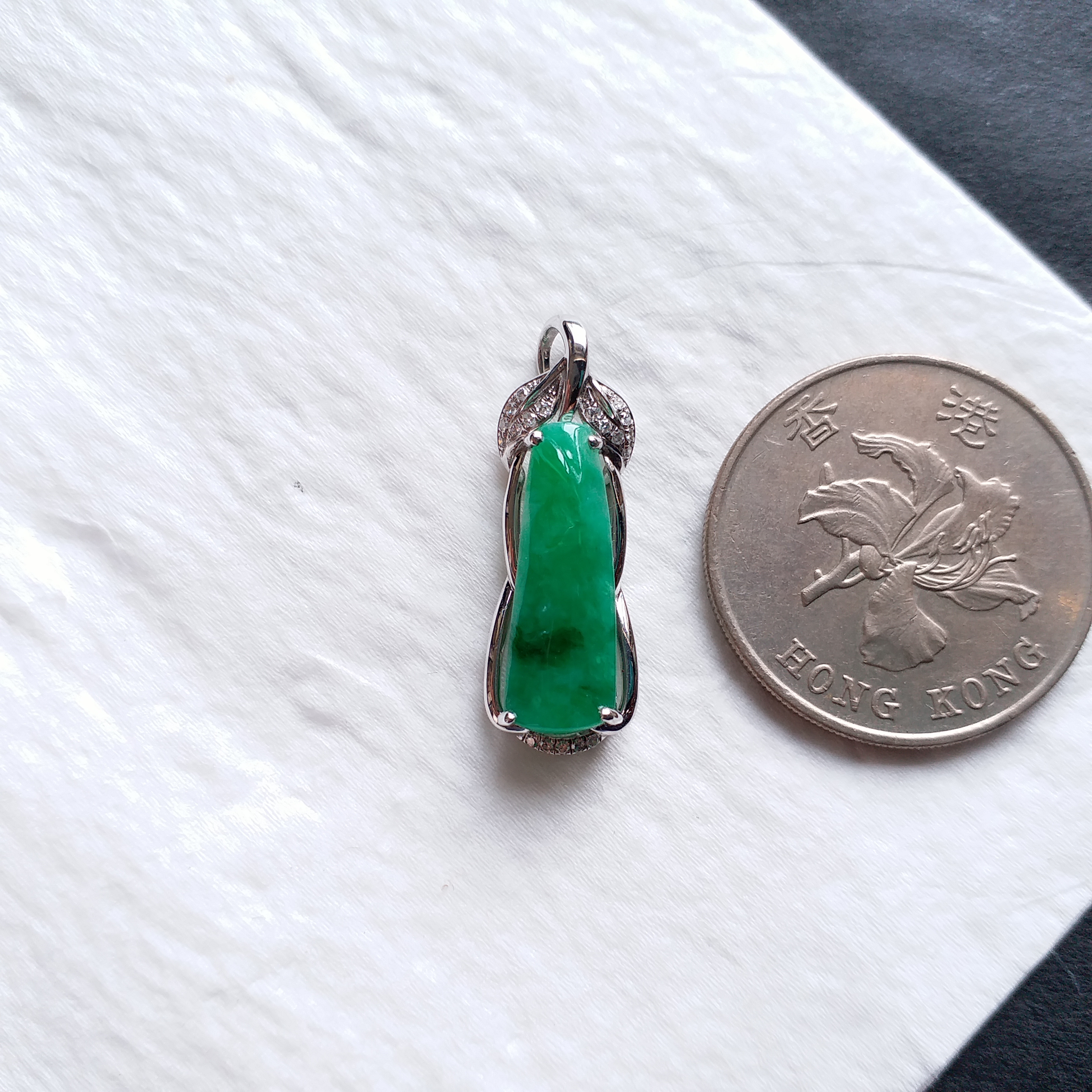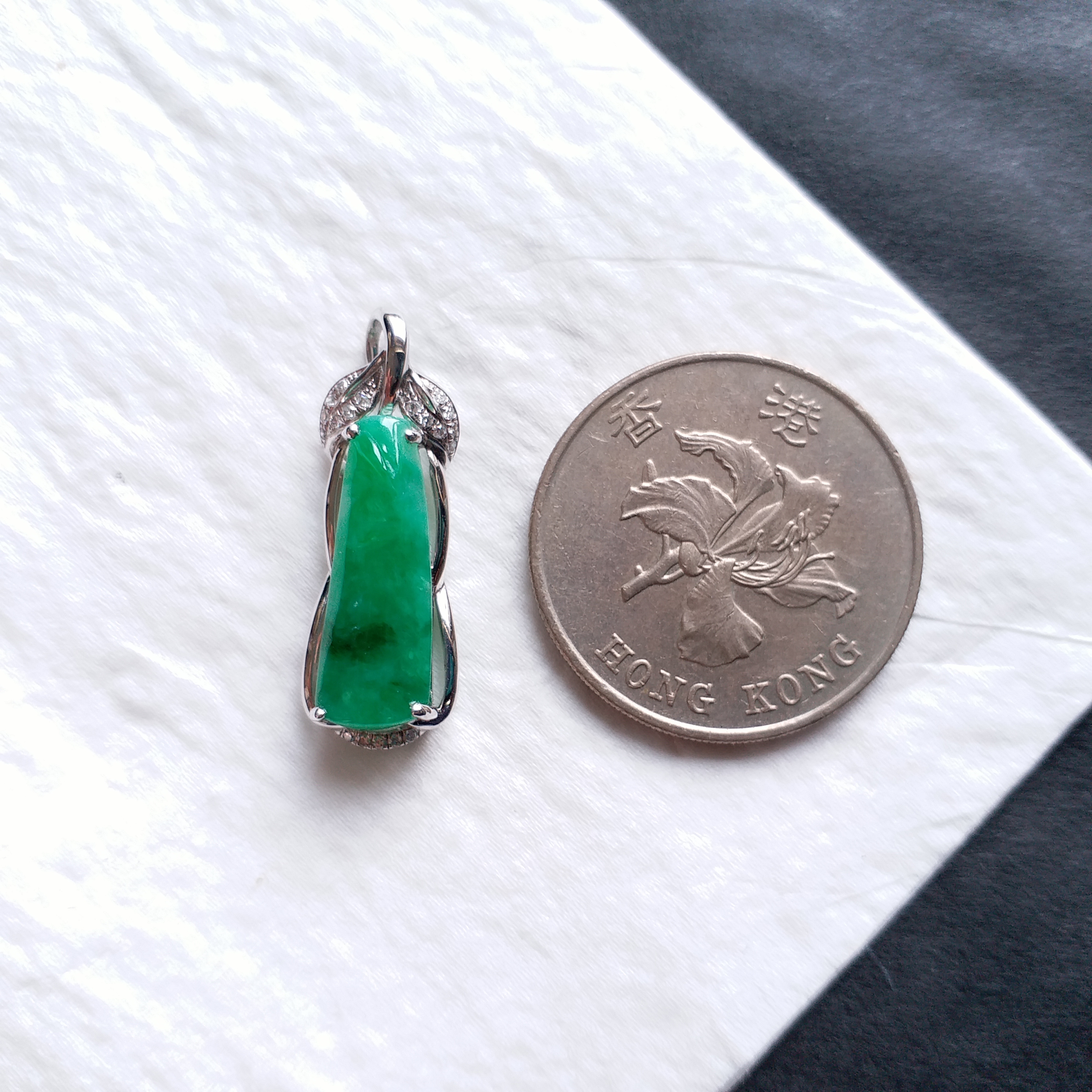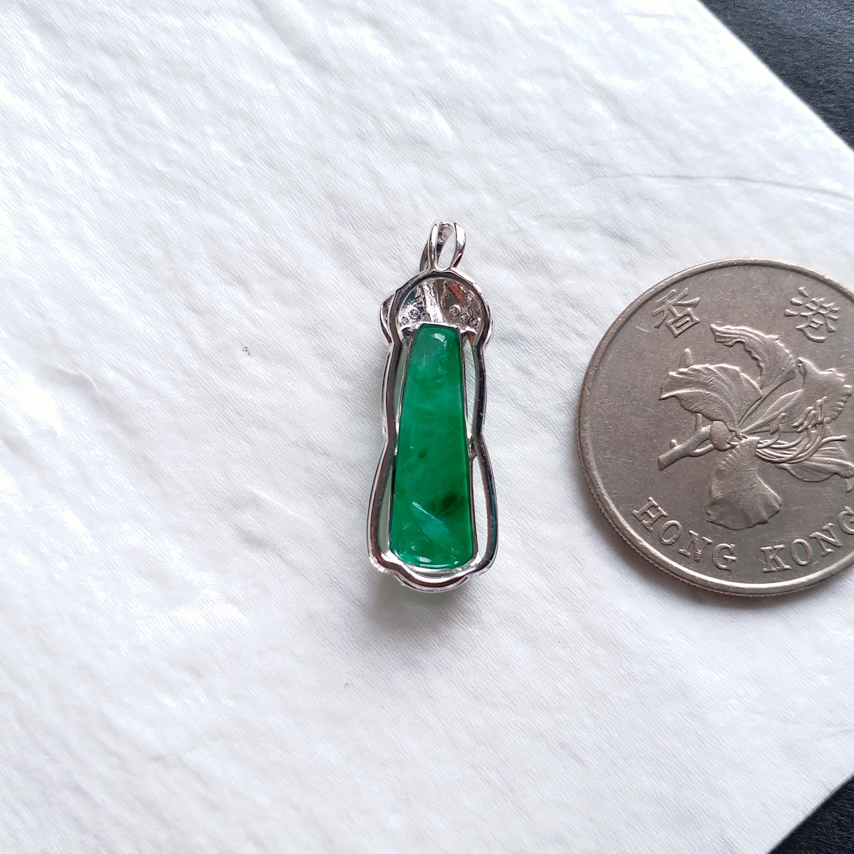 • 冰陽綠節節高昇鑲18K金真鑽小吊墜, 天然翡翠A玉, 緬甸玉, Jade, Jadeite