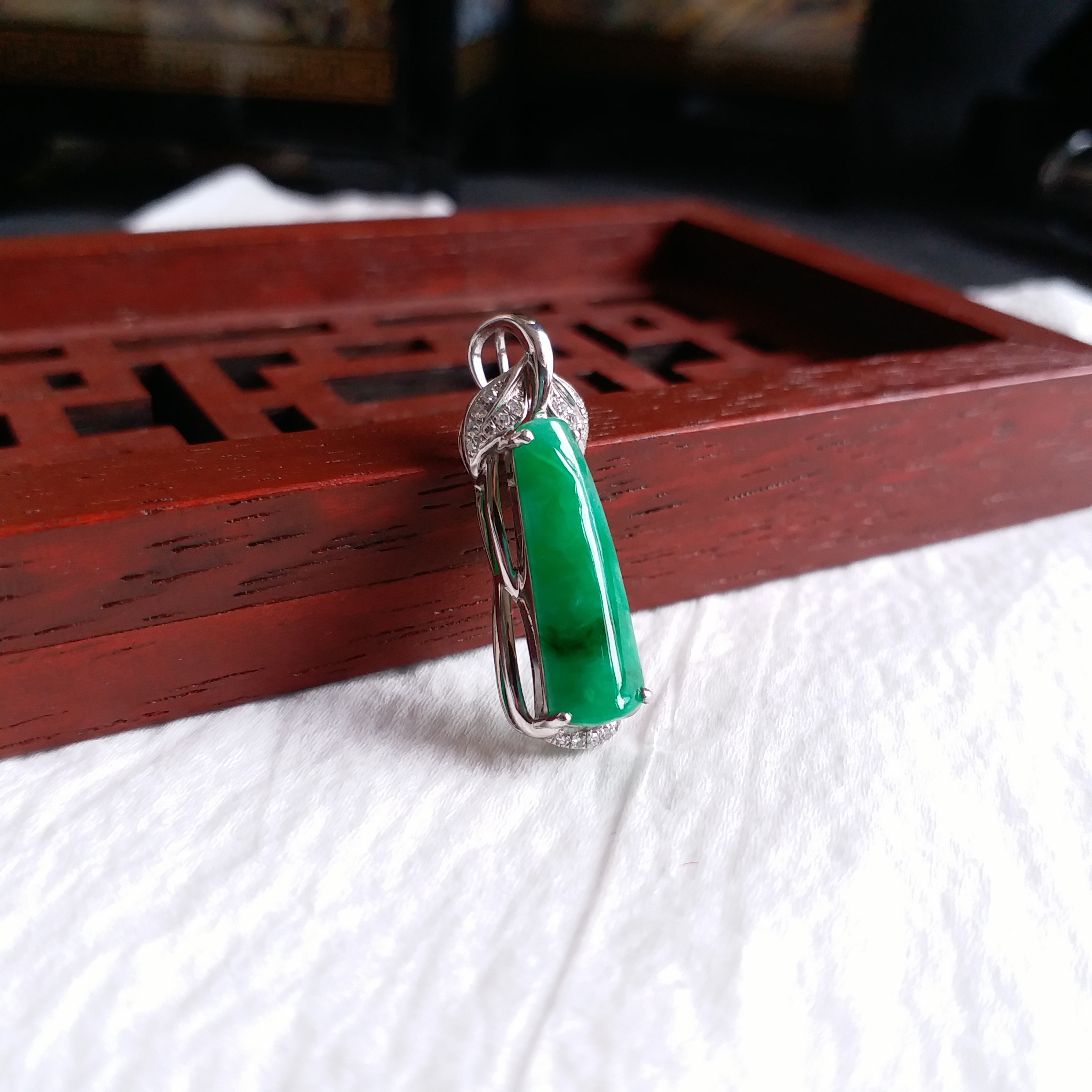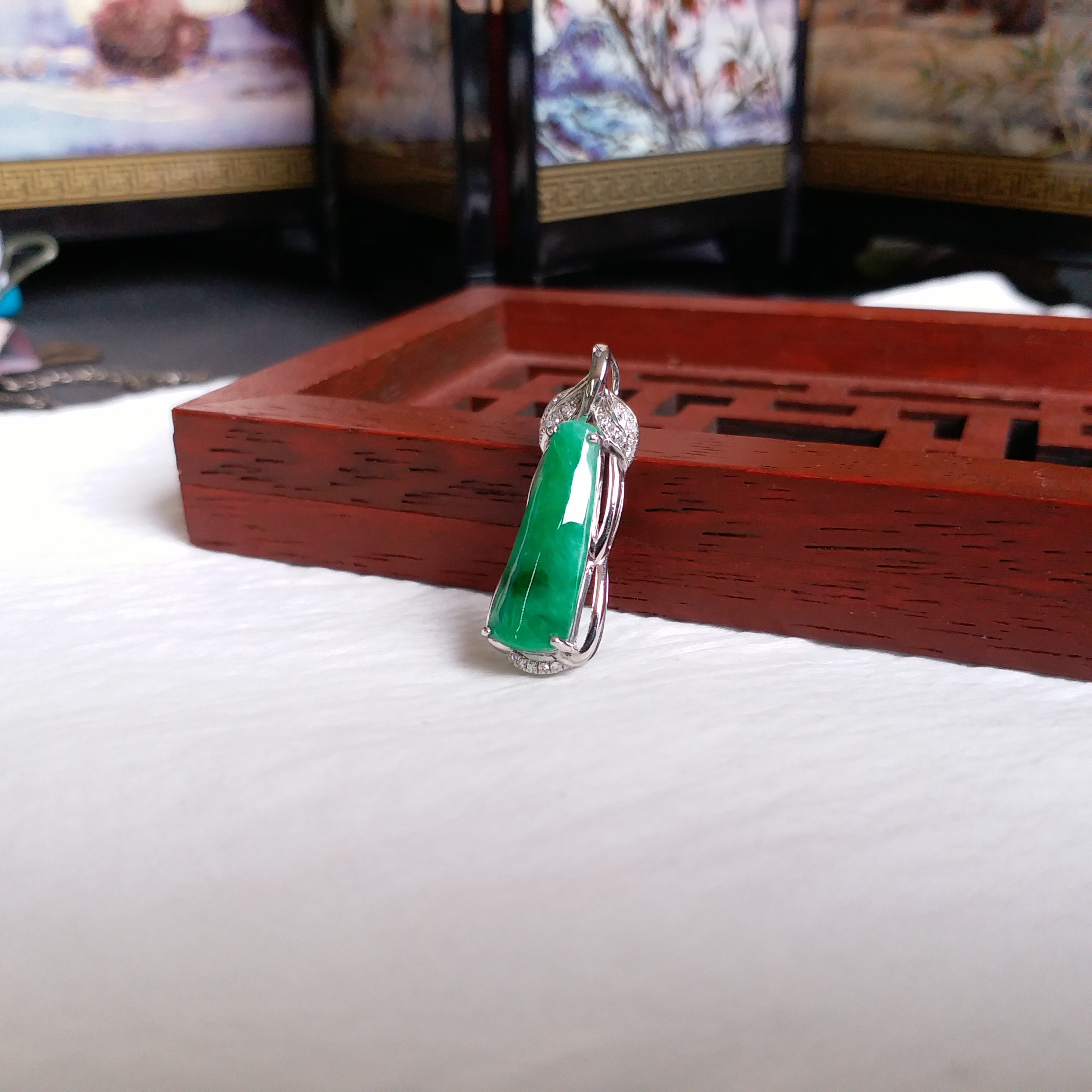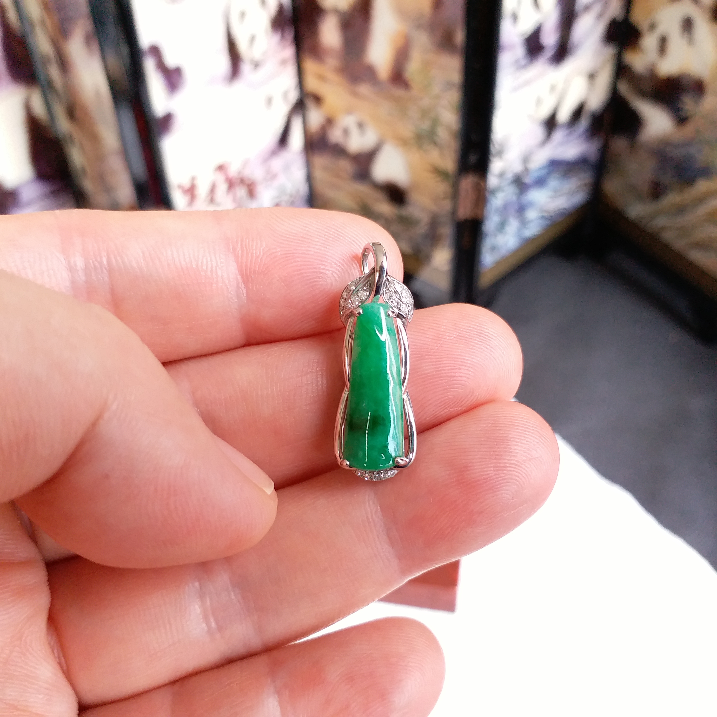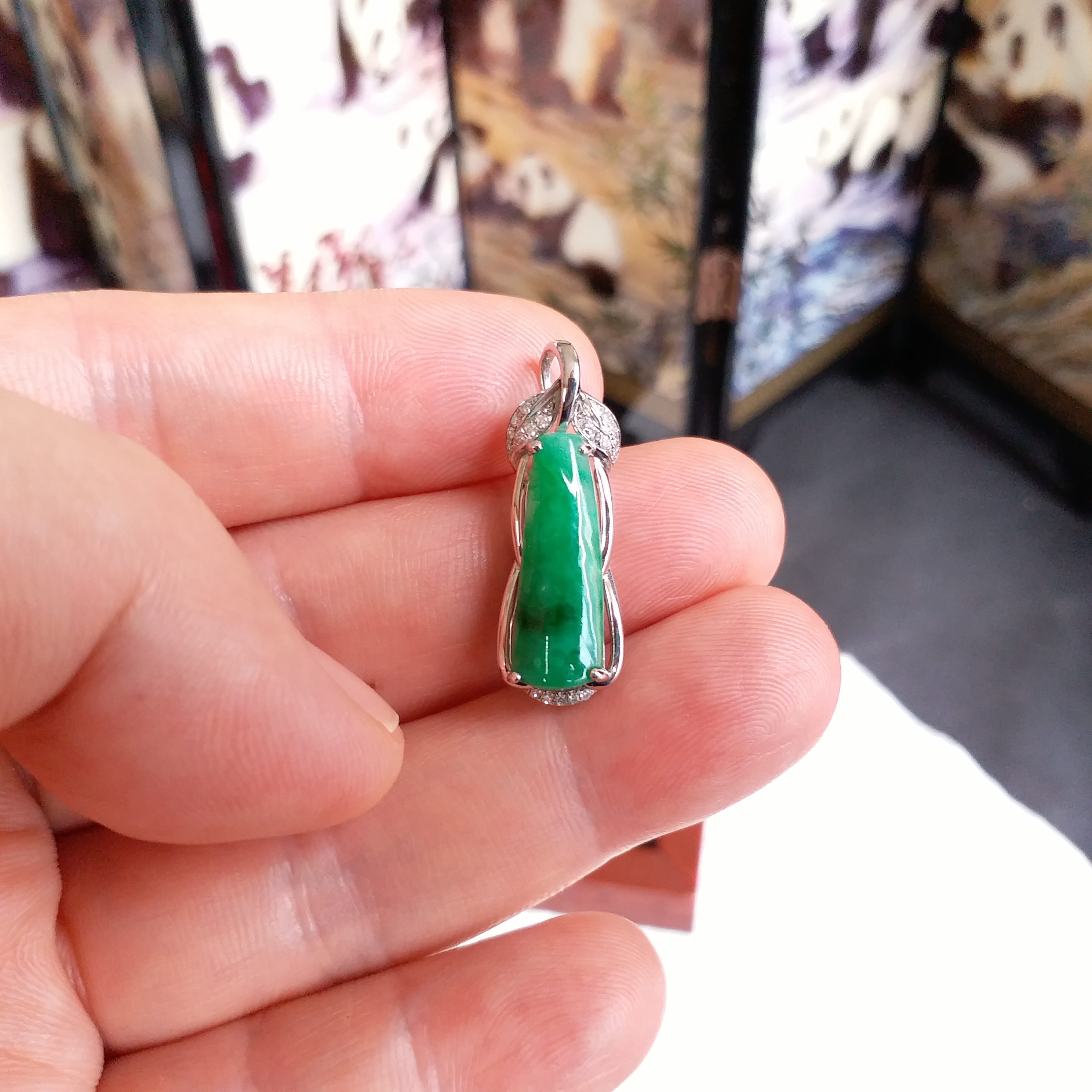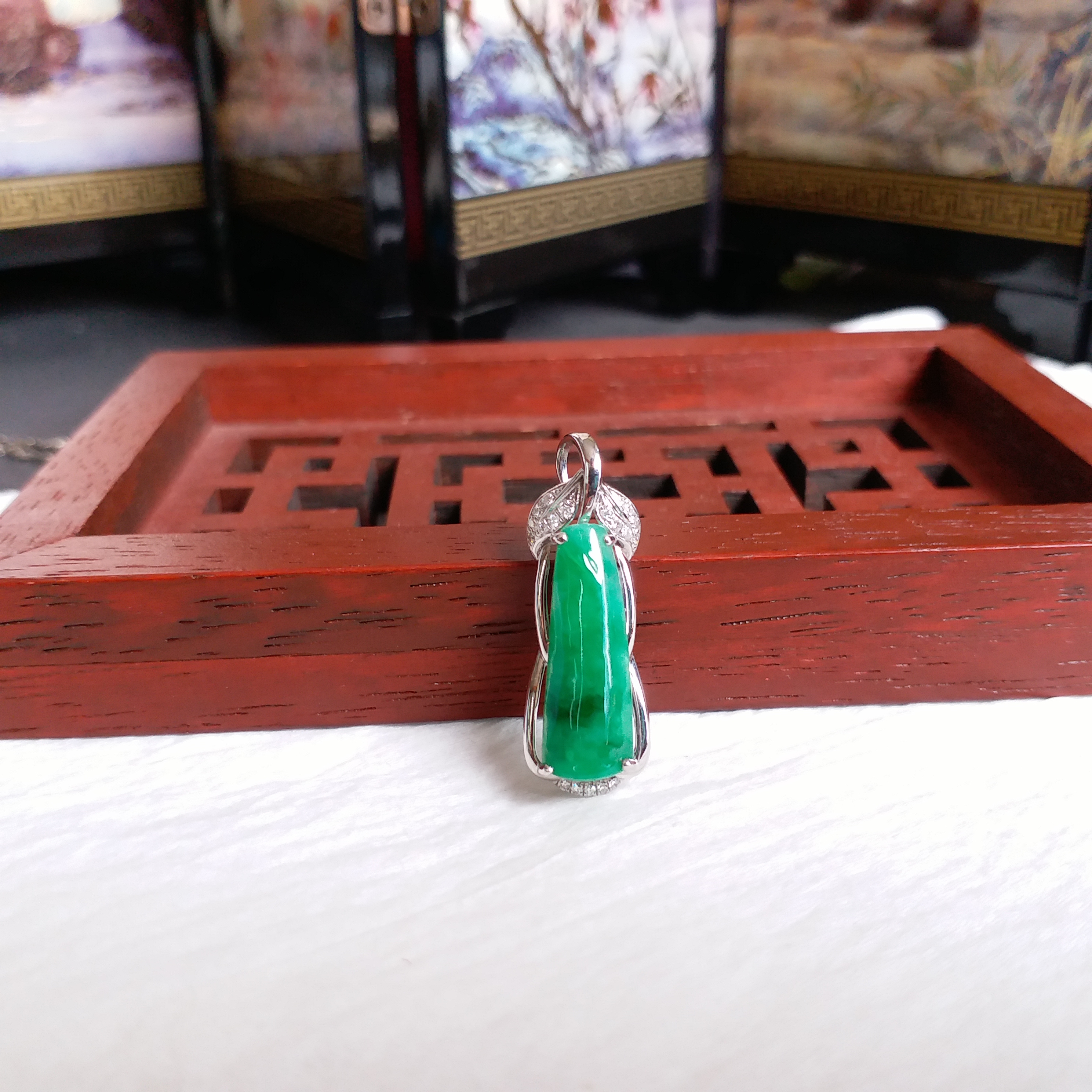 • 冰陽綠節節高昇鑲18K金真鑽小吊墜, 天然翡翠A玉, 緬甸玉, Jade, Jadeite