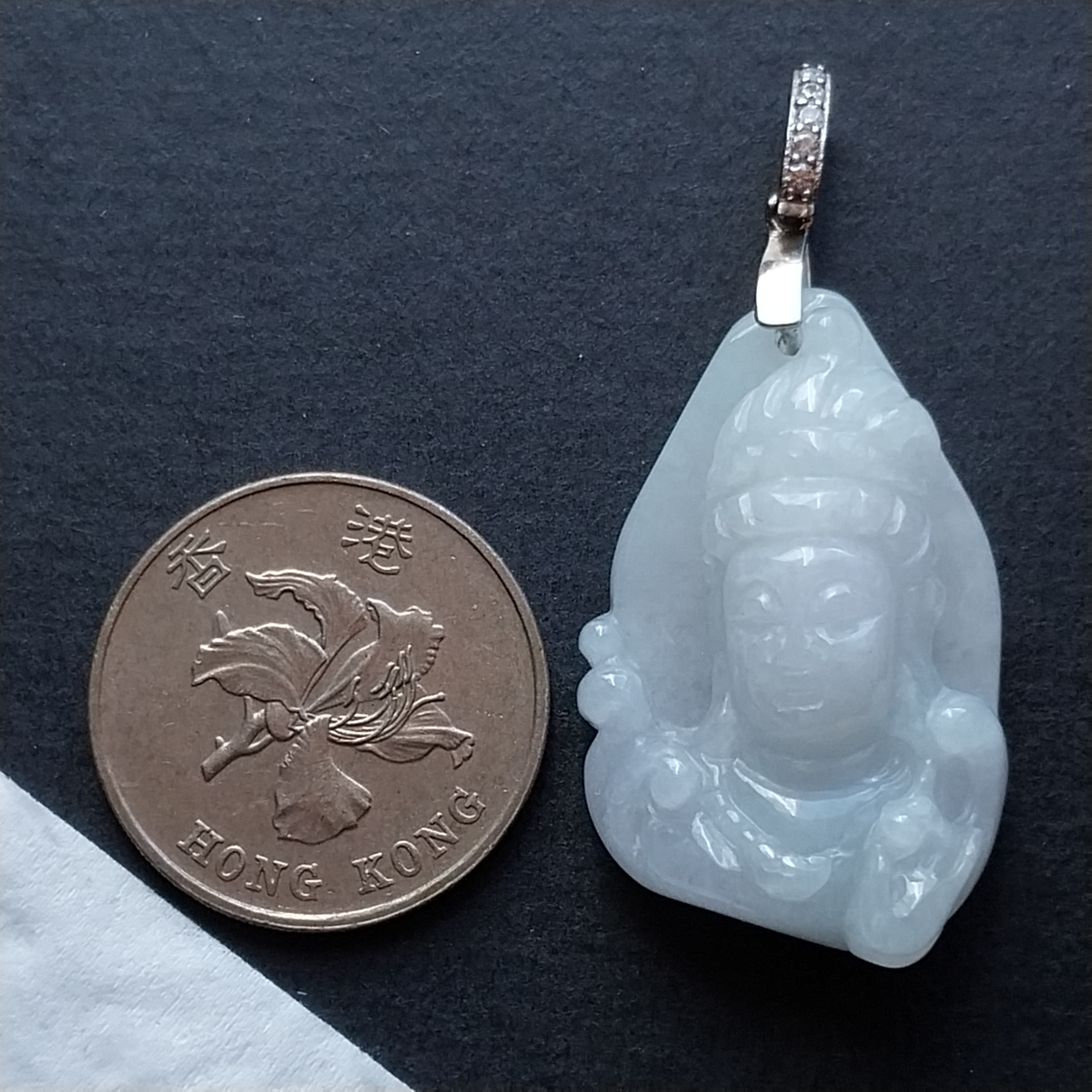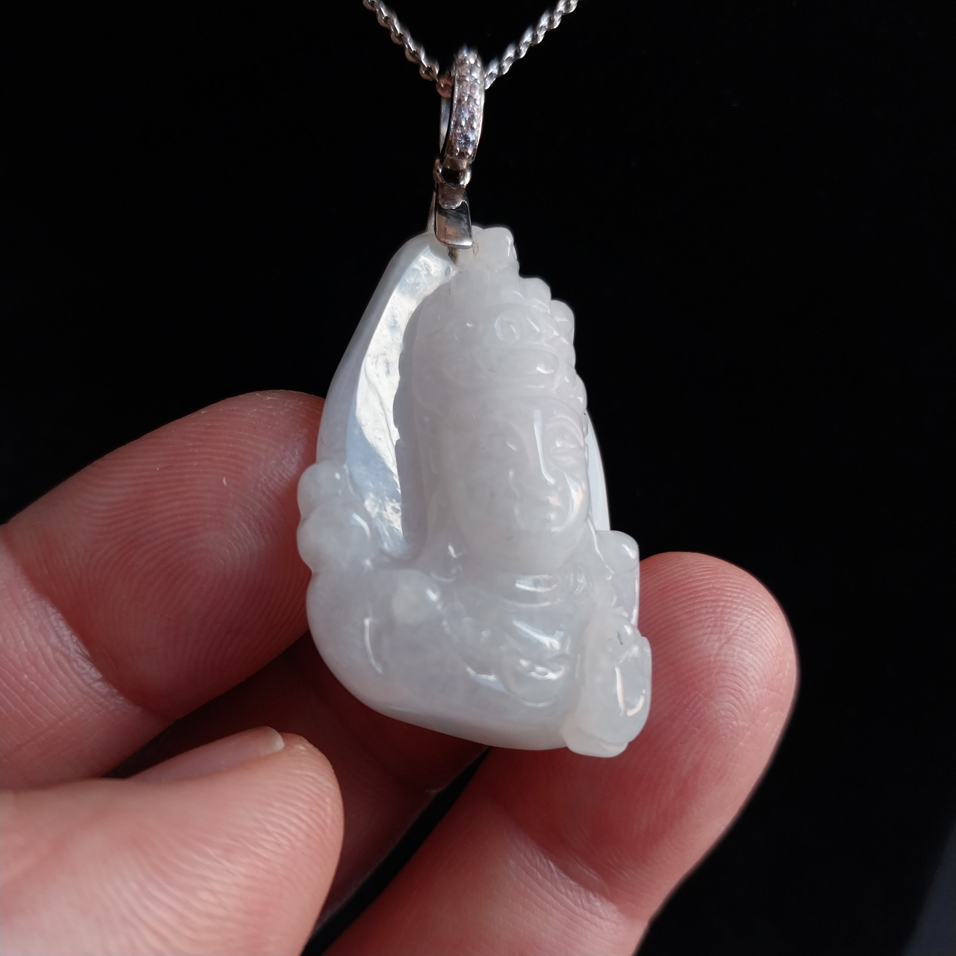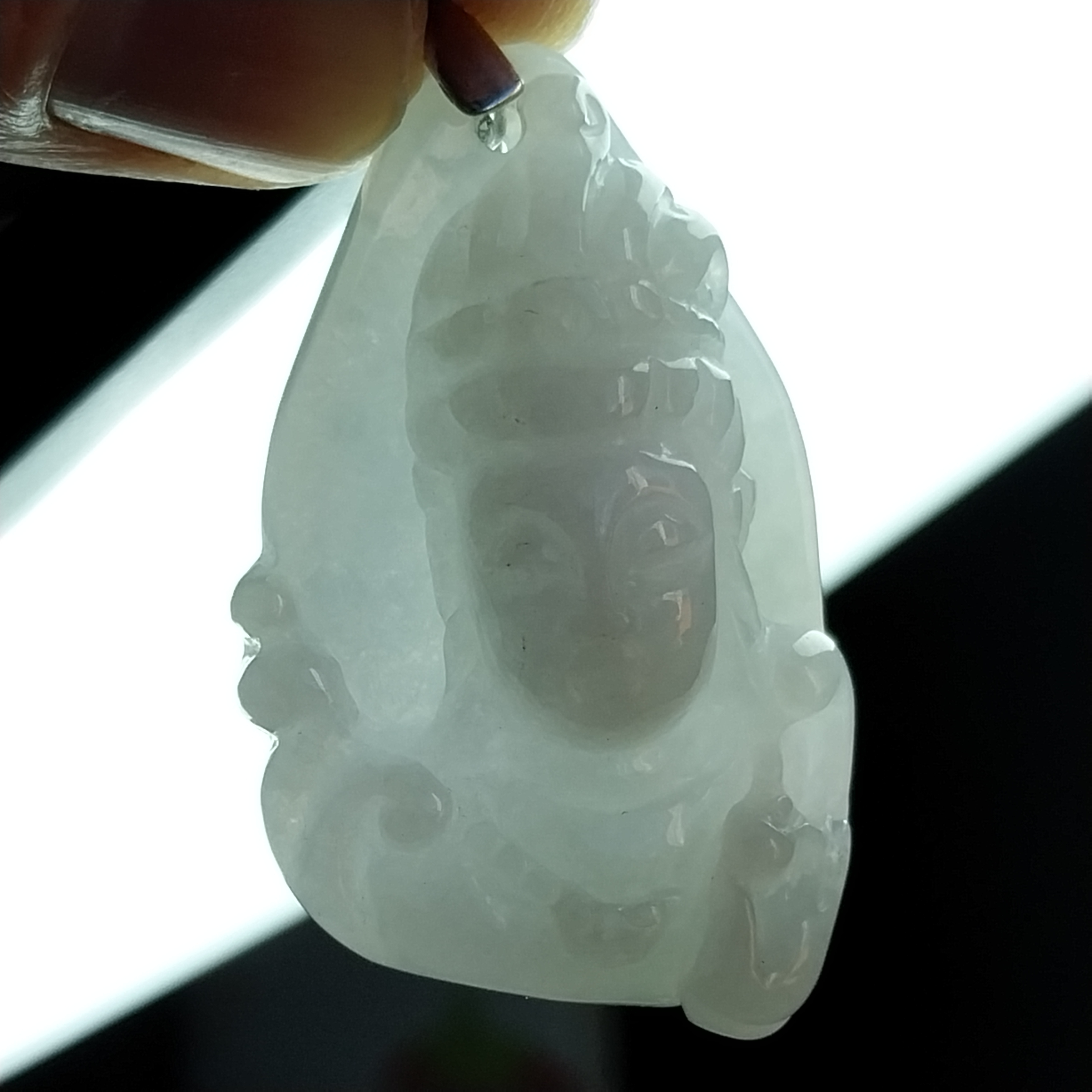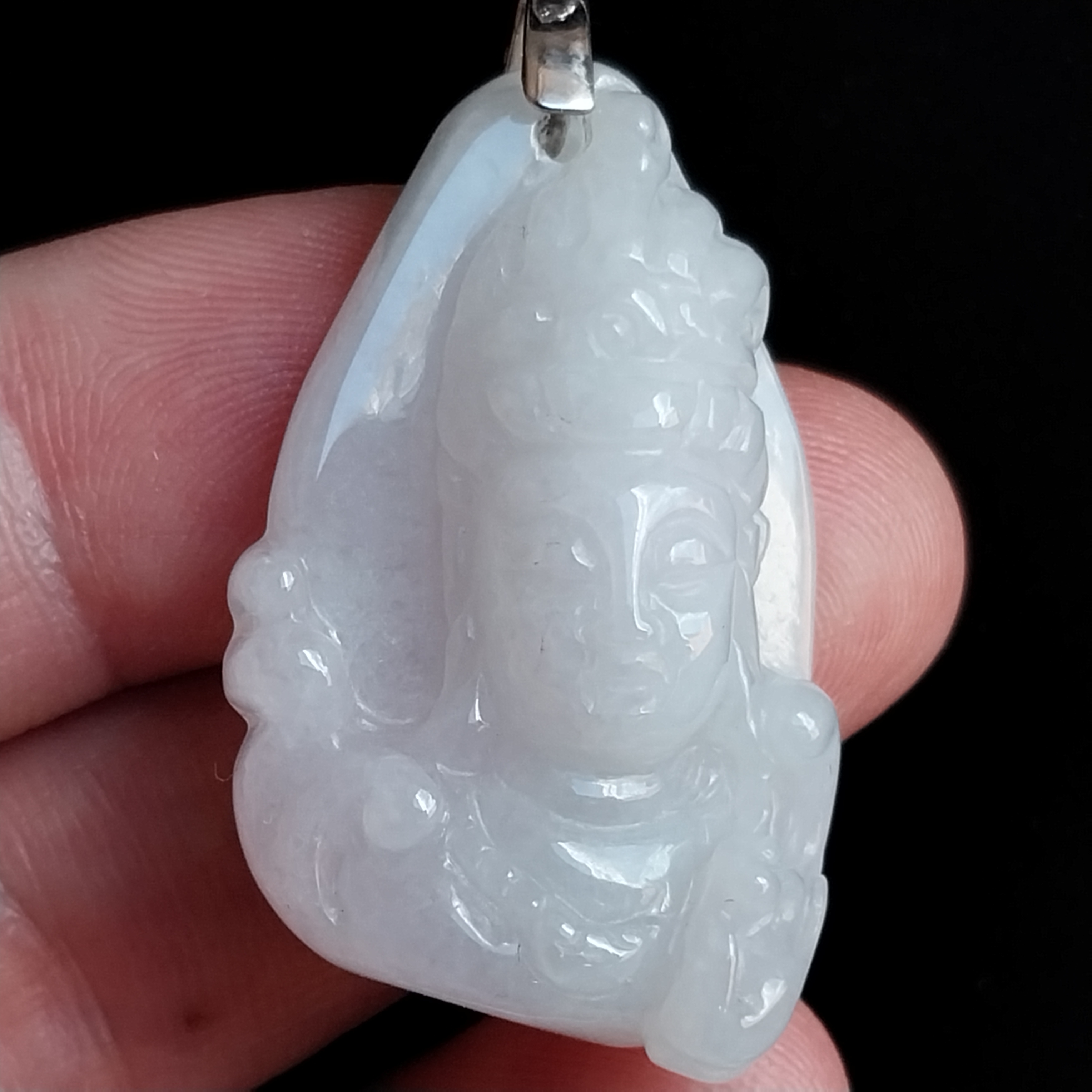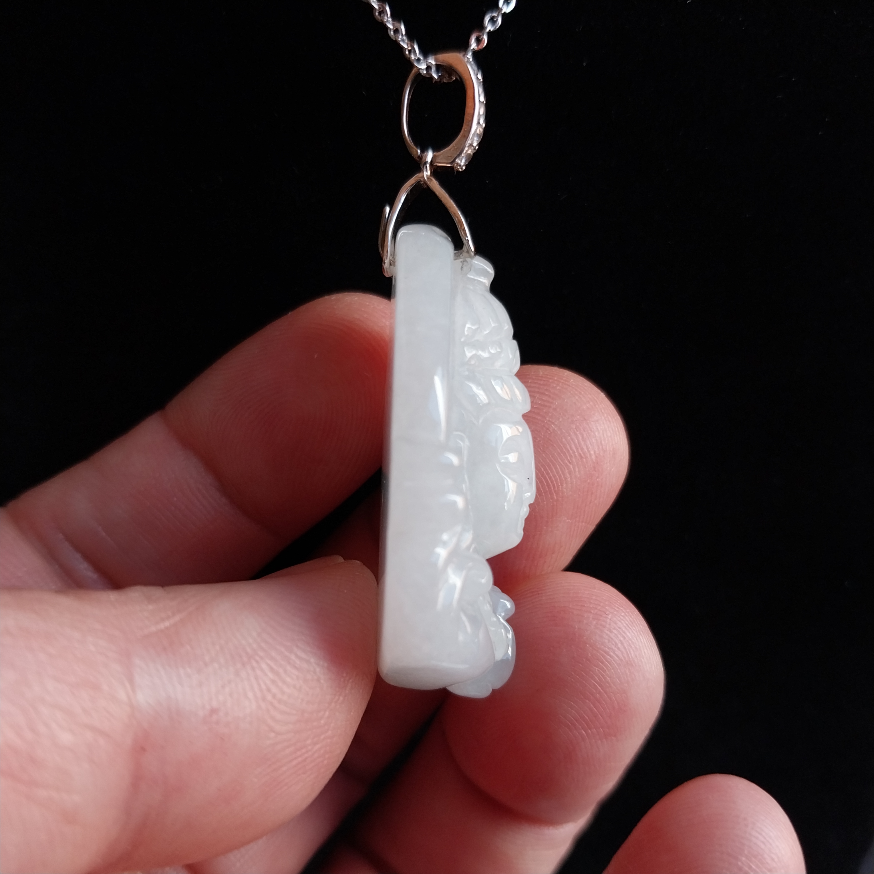 • 冰糯白翡觀音像吊墜, 天然翡翠A玉, 緬甸玉, Jade, Jadeite