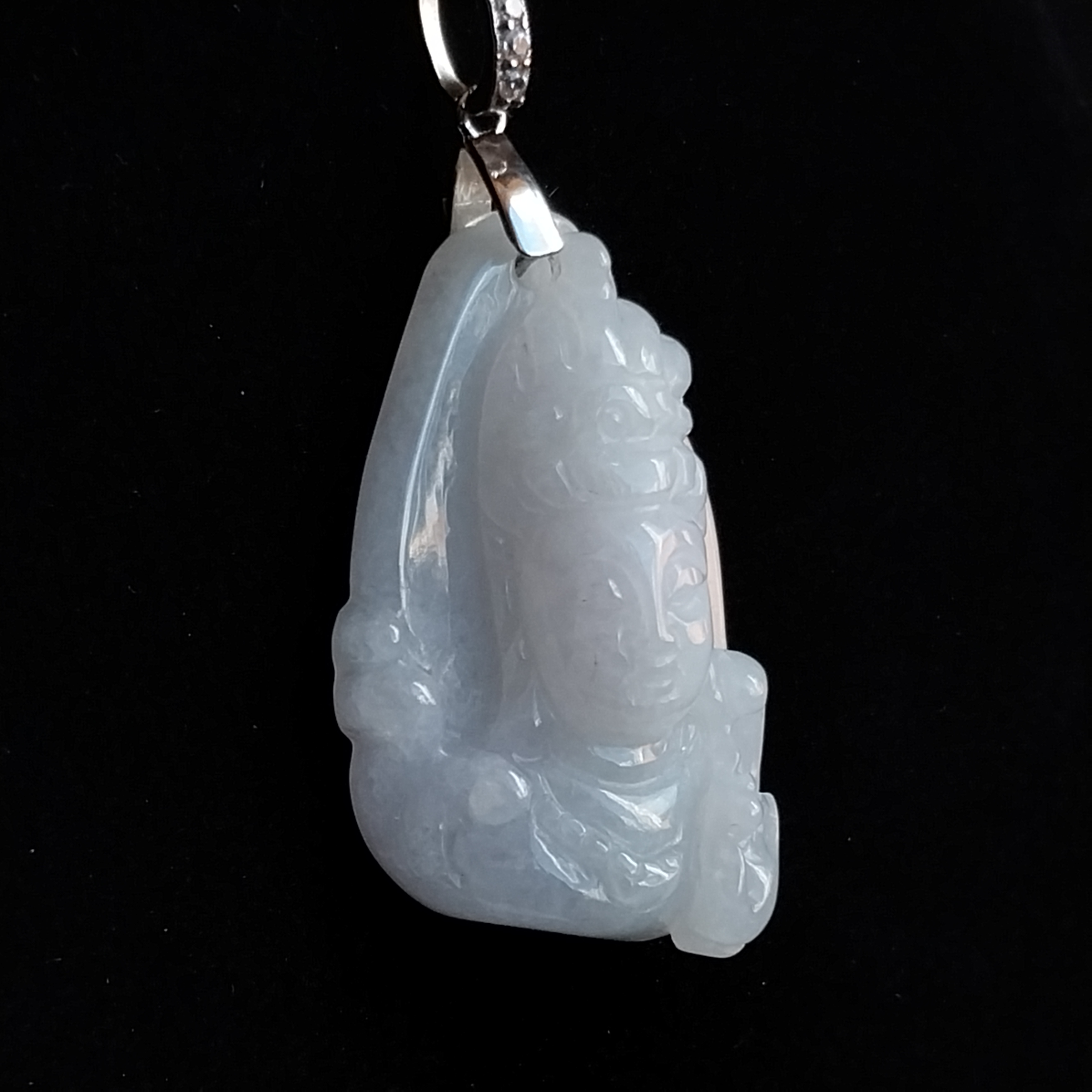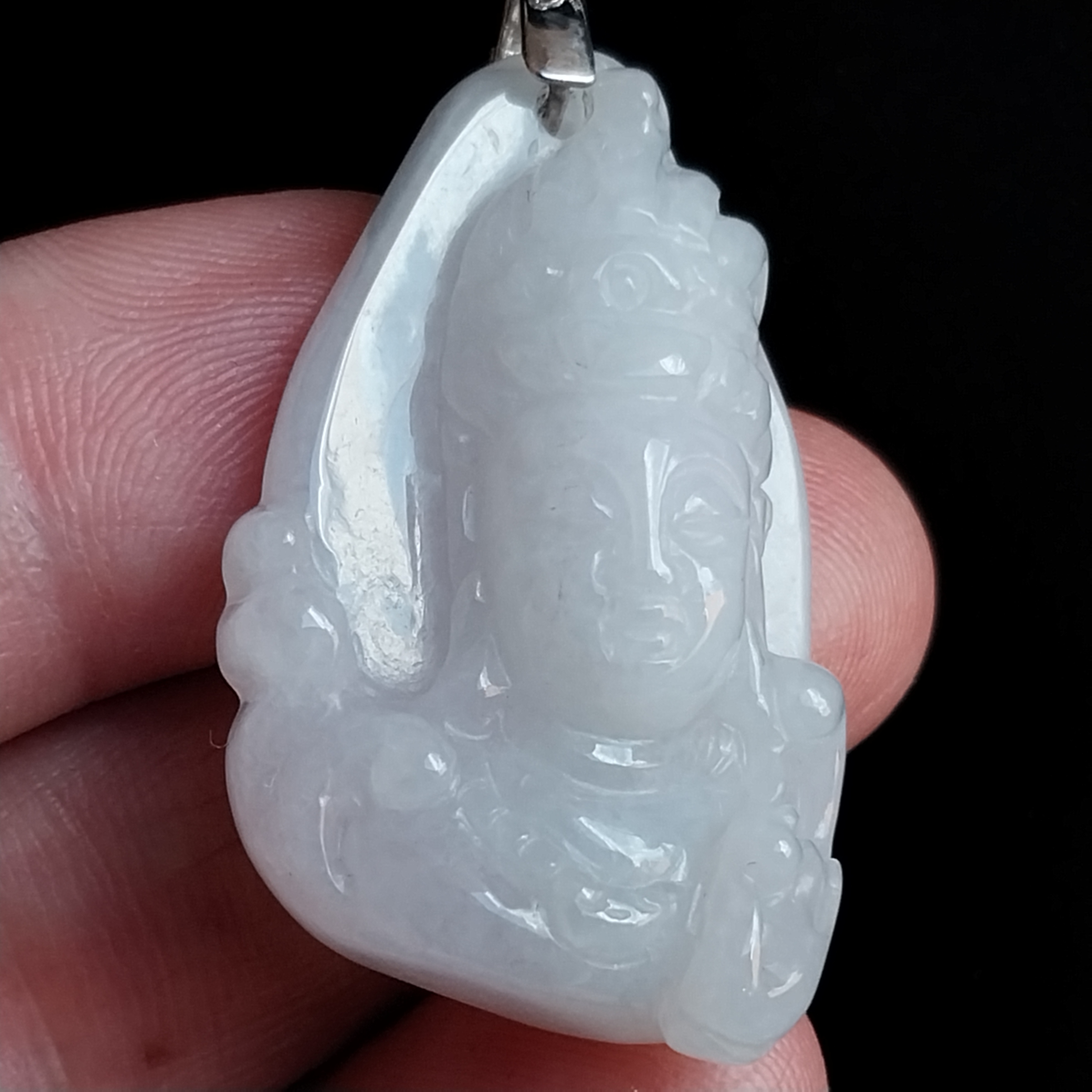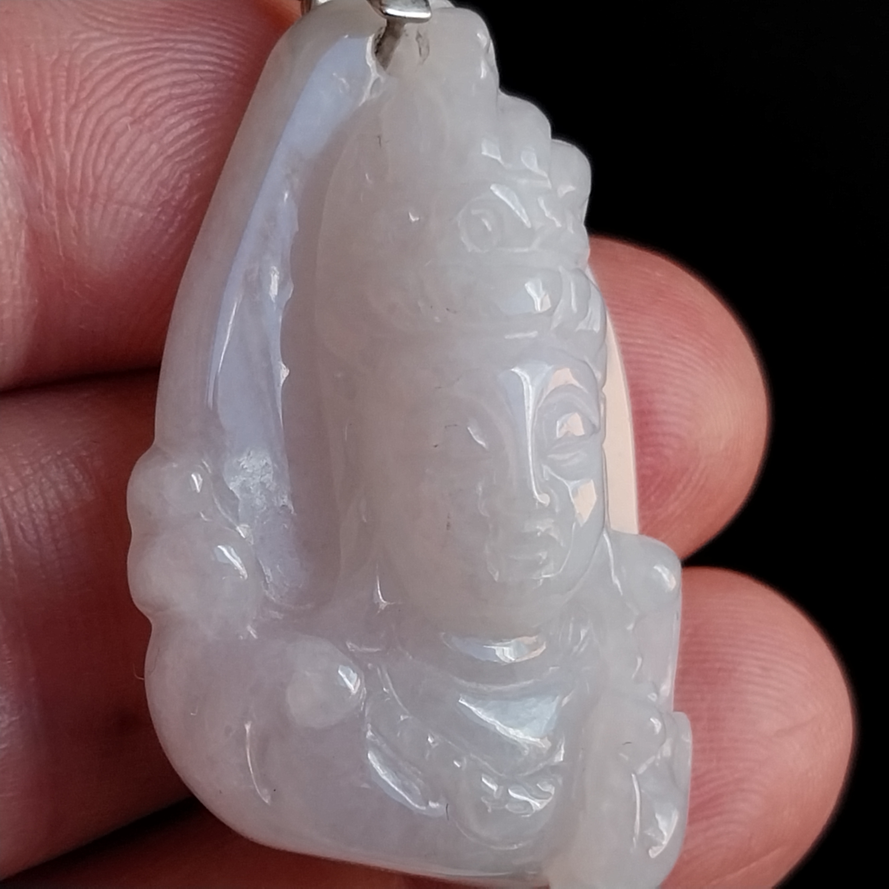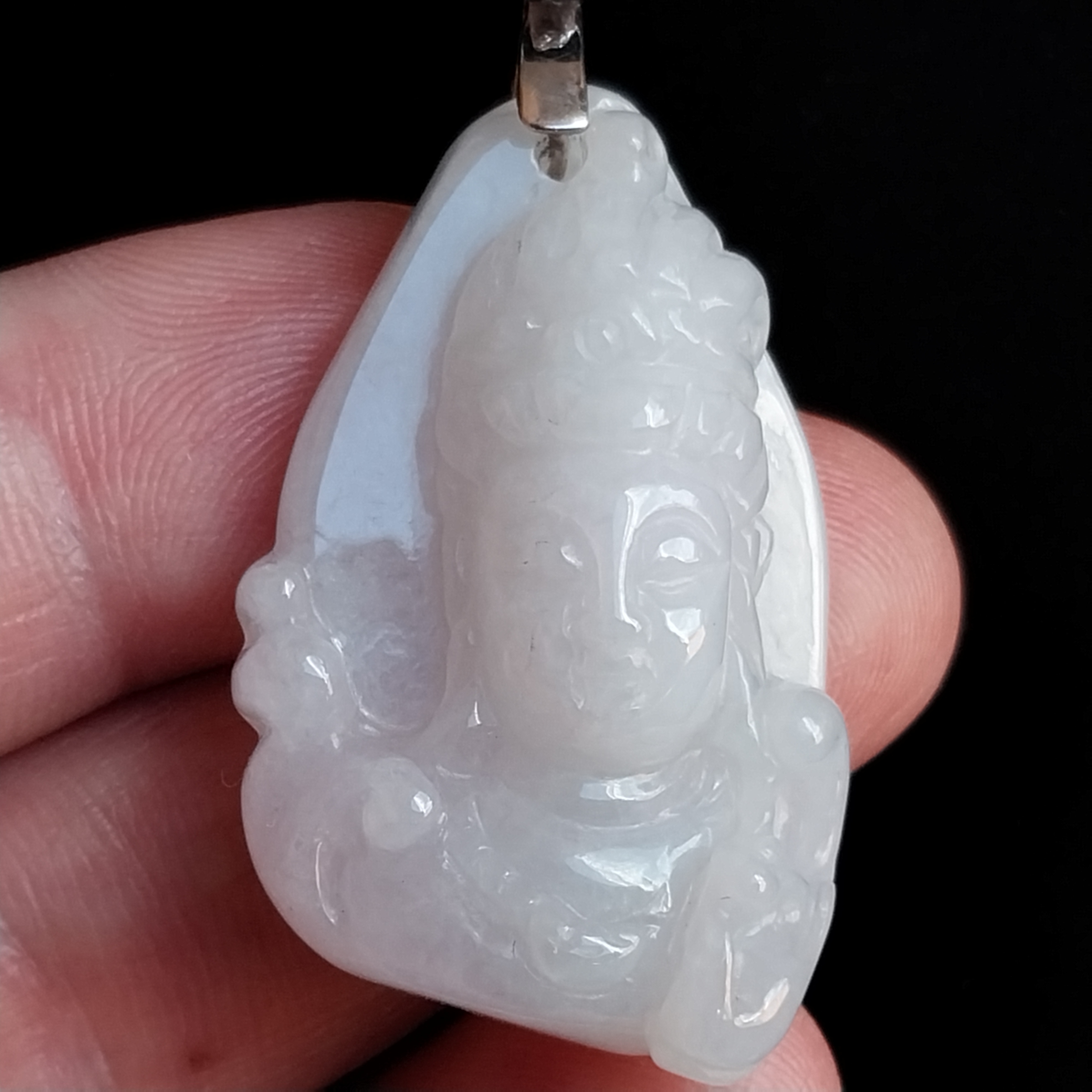 • 冰糯白翡觀音像吊墜, 天然翡翠A玉, 緬甸玉, Jade, Jadeite