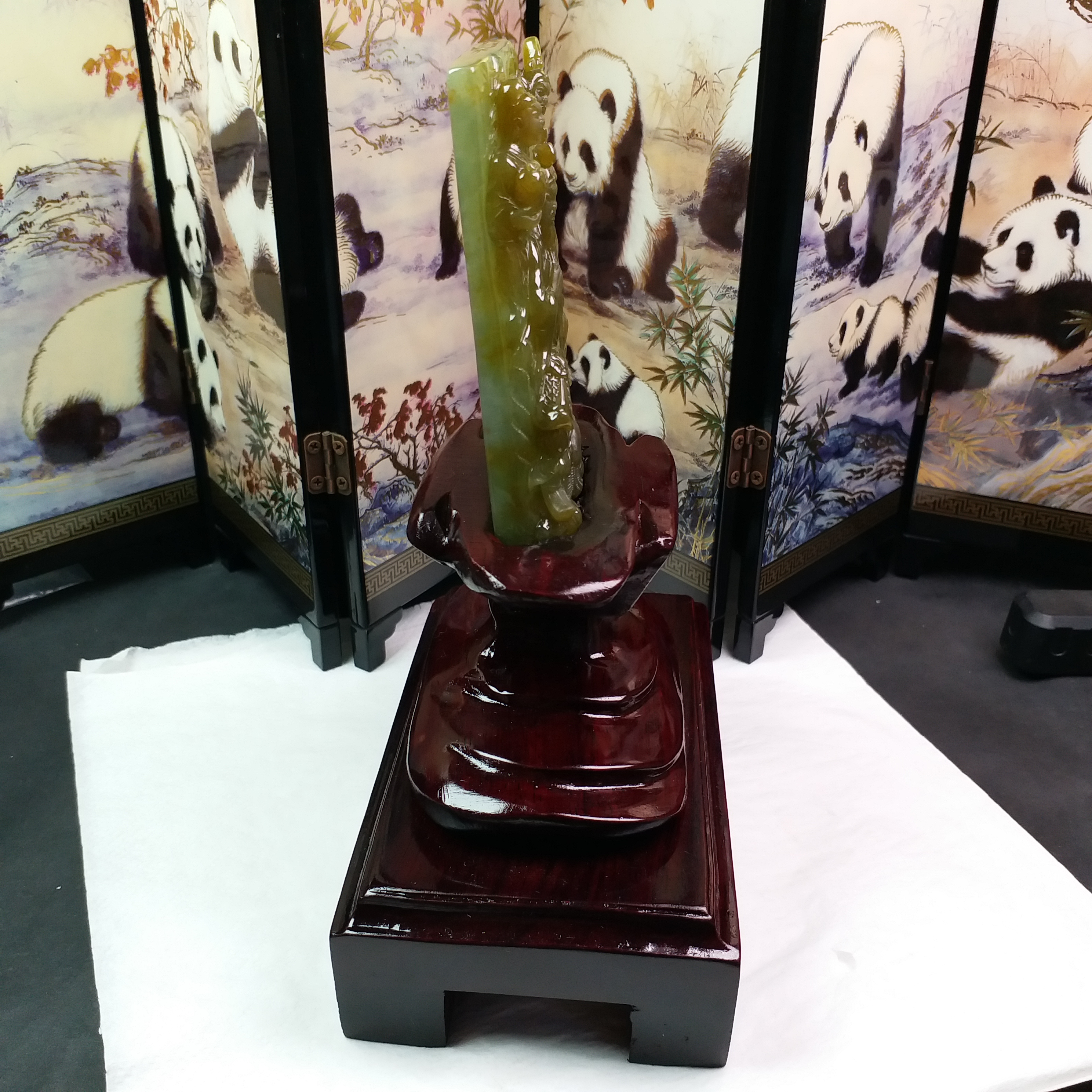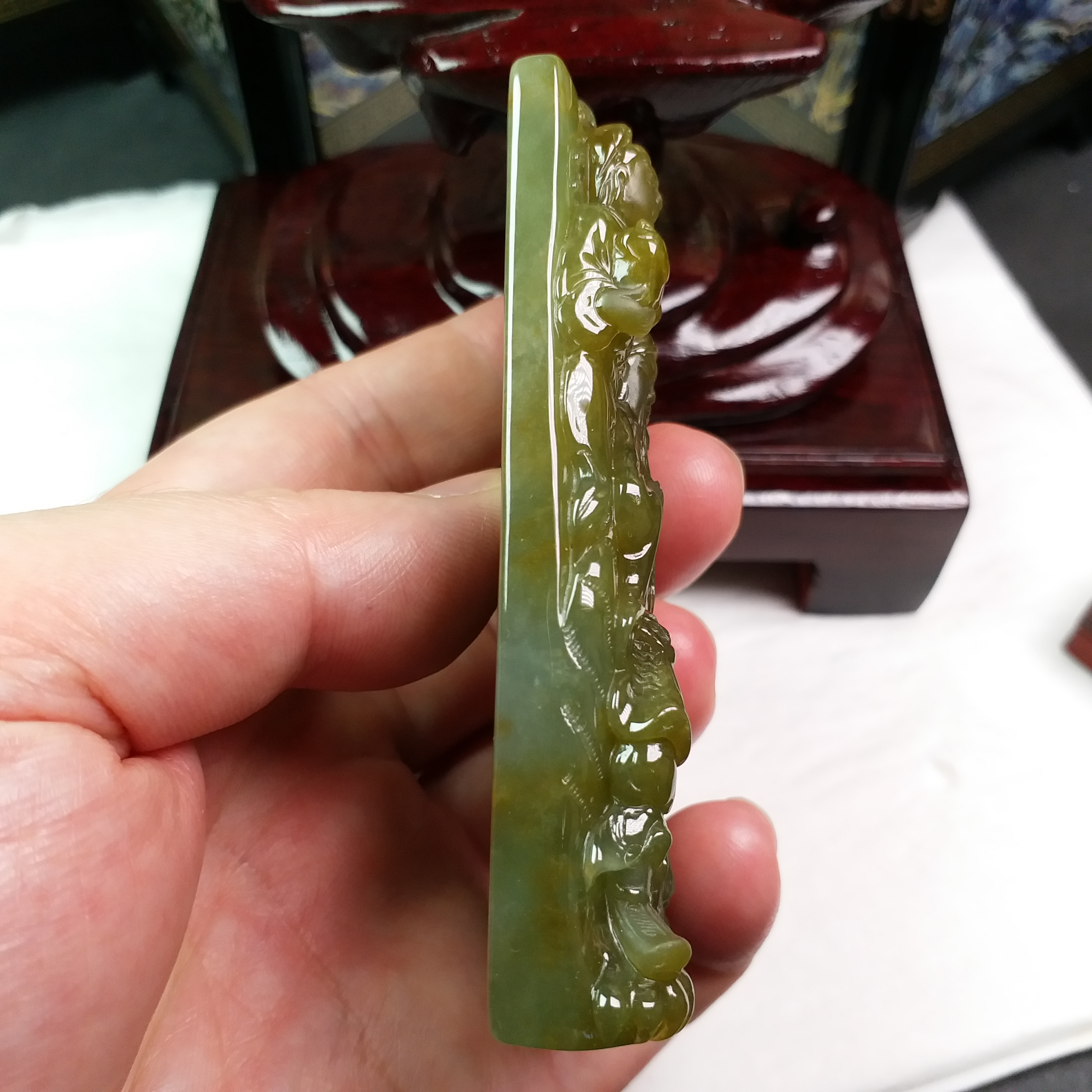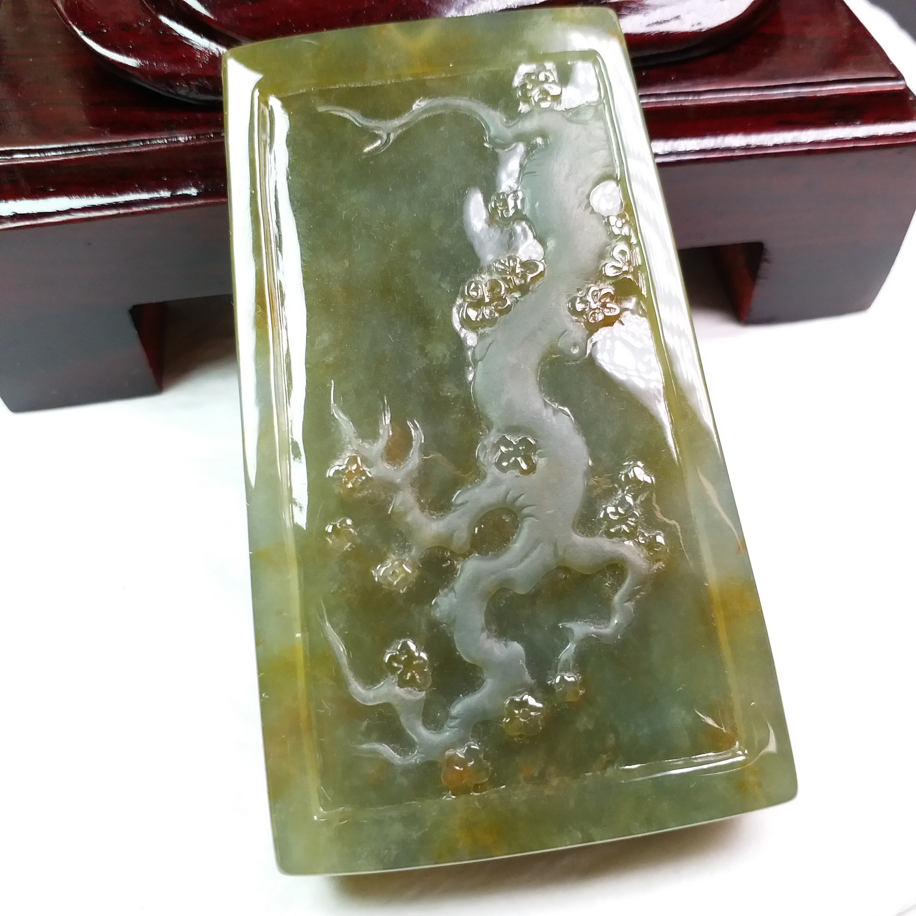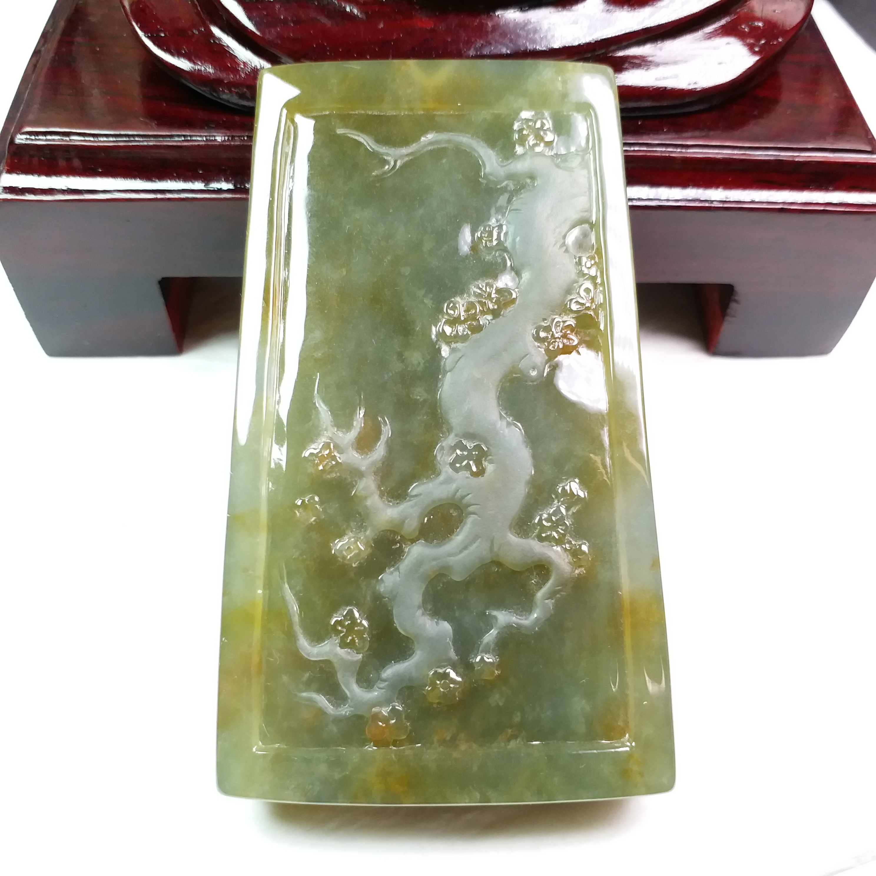 天然翡翠A玉大師級傑作!全手工雕刻,厚庄,完美無紋裂,配檀木底座。