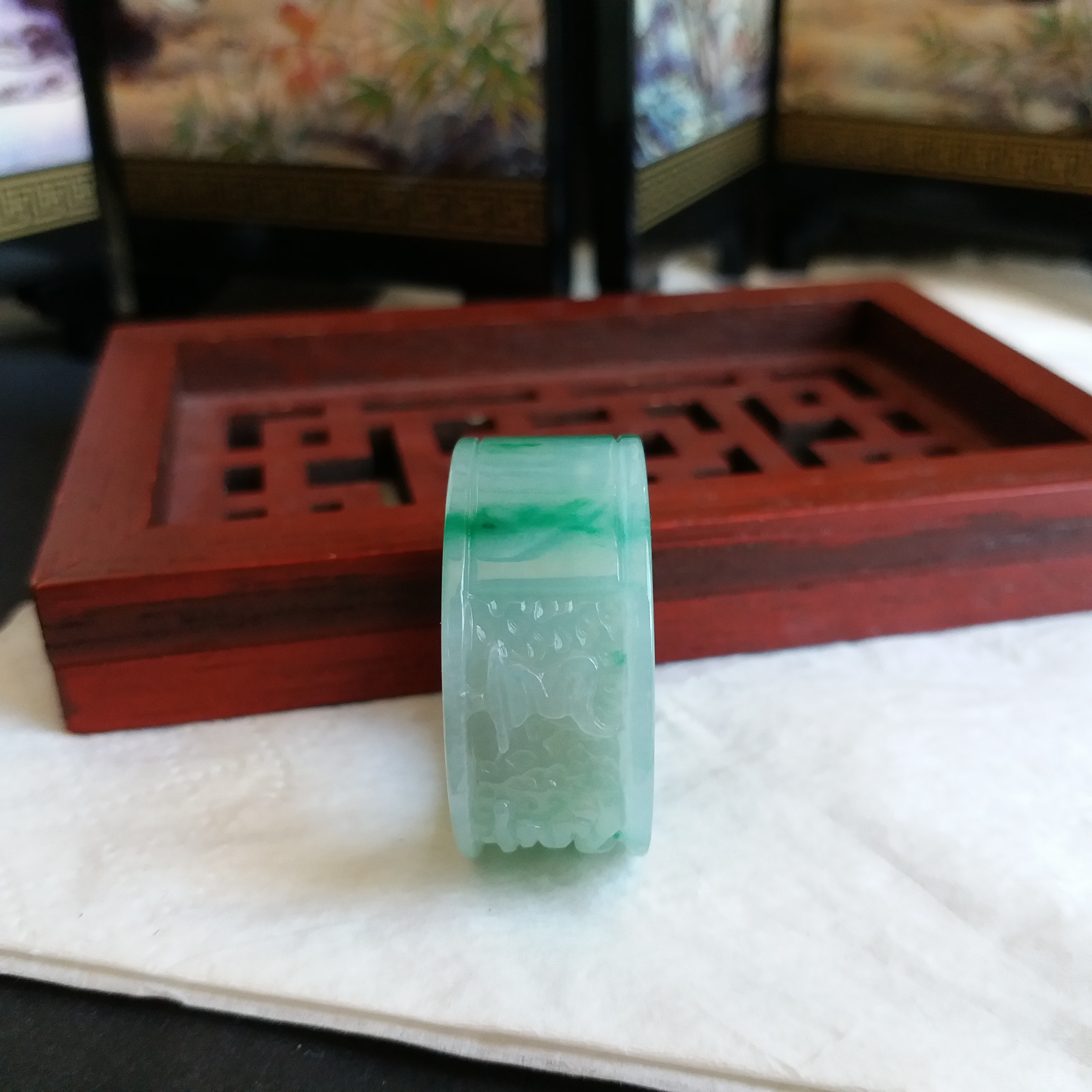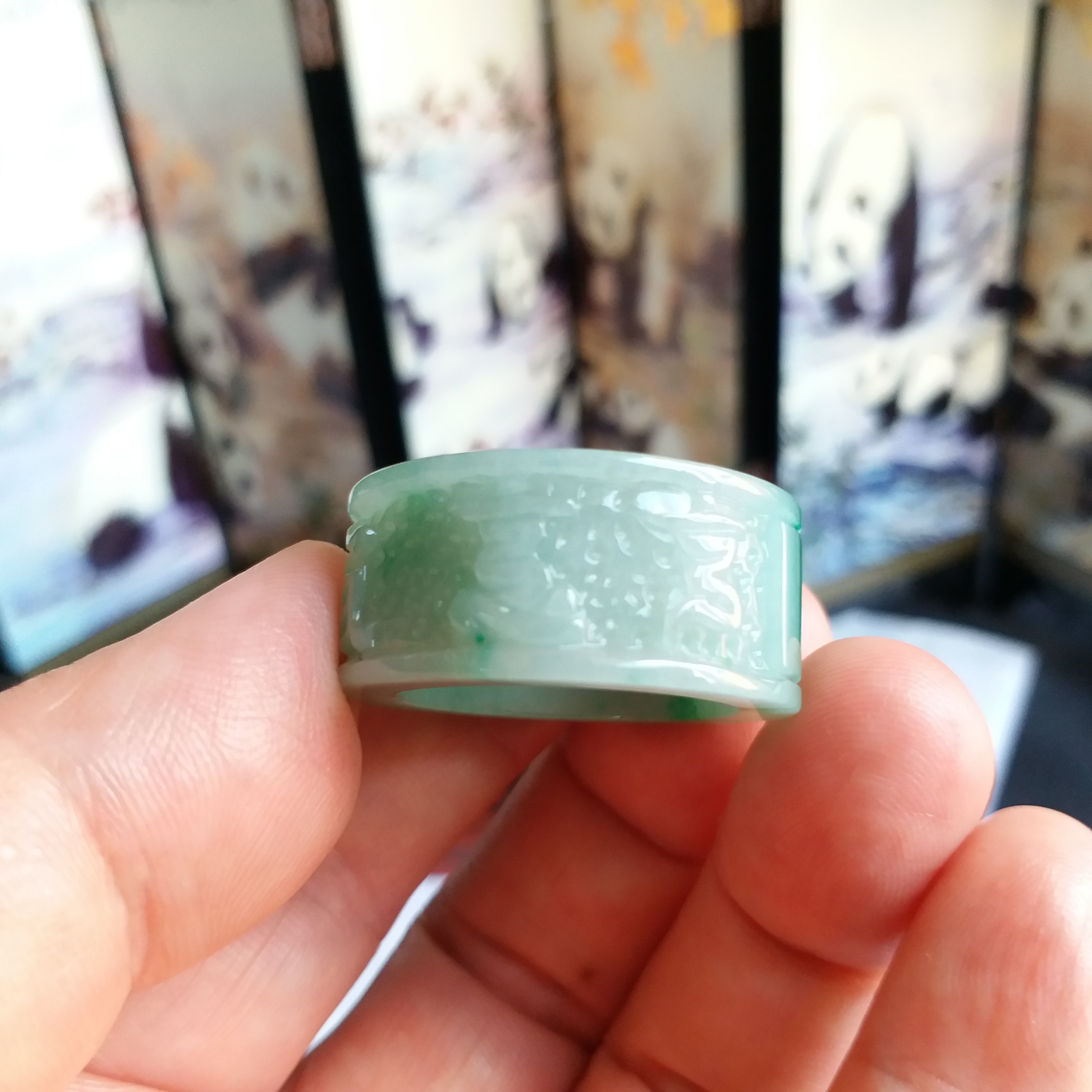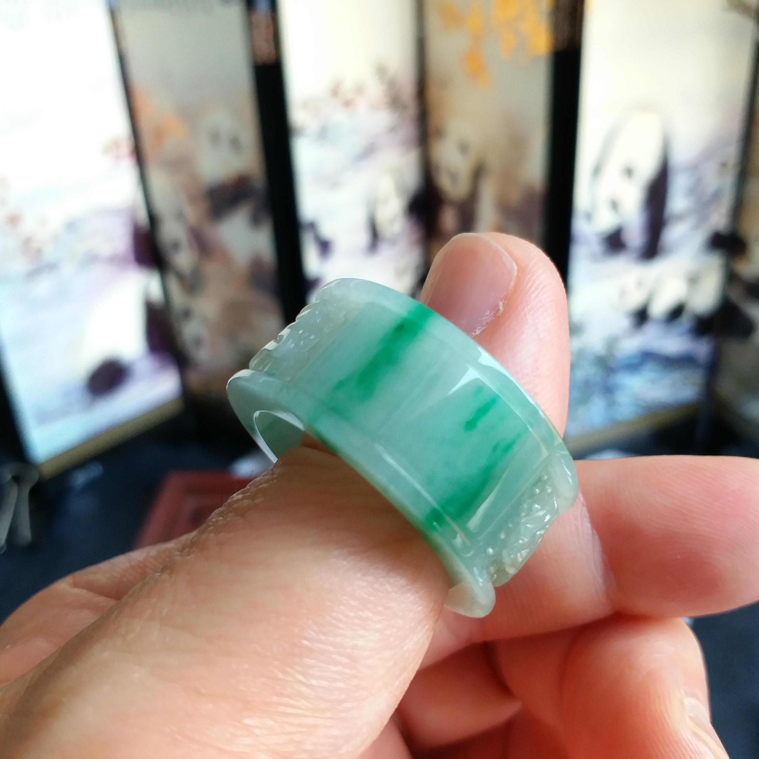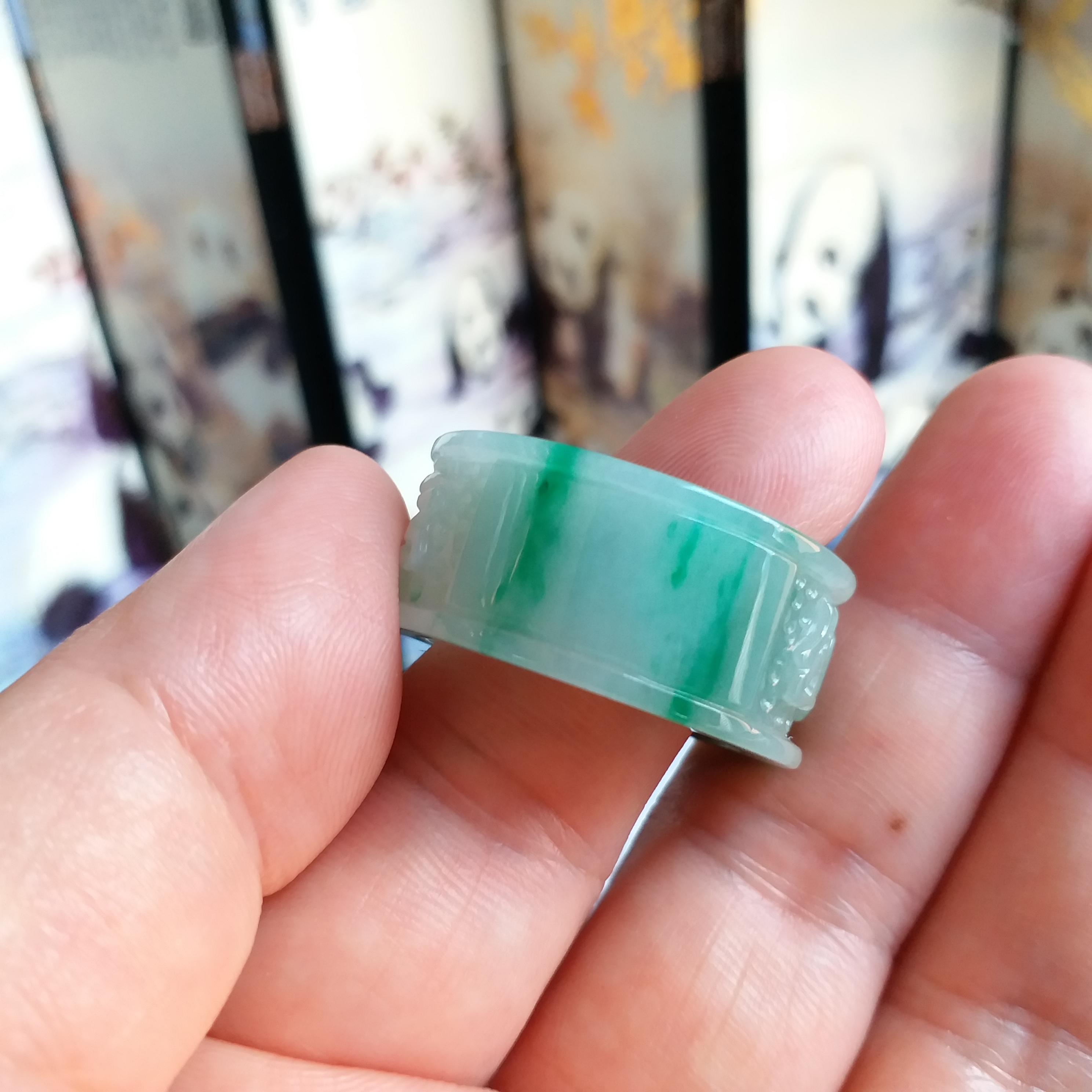 • 飄辣綠六字真言扳指, 天然翡翠A玉, 緬甸玉, Jade, Jadeite