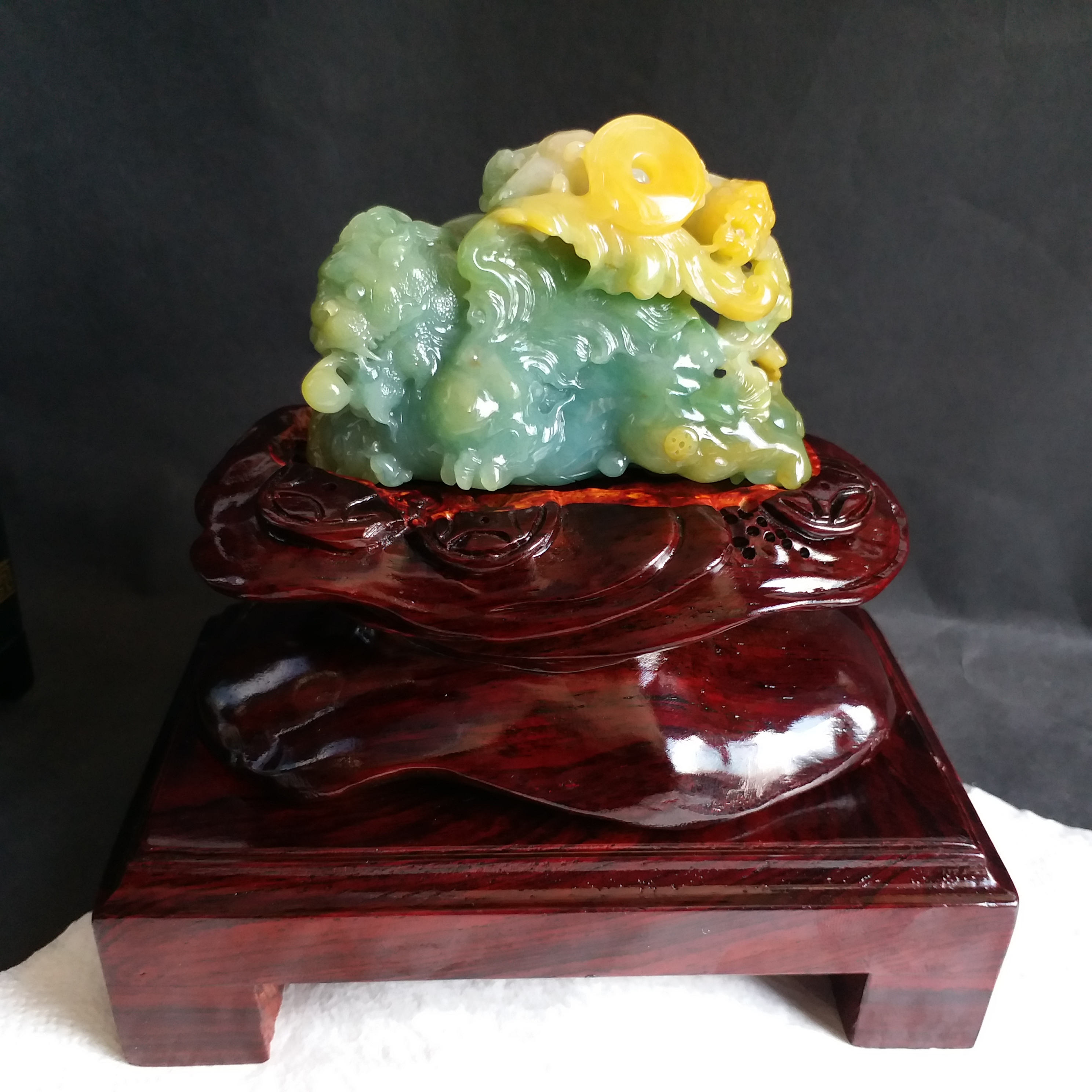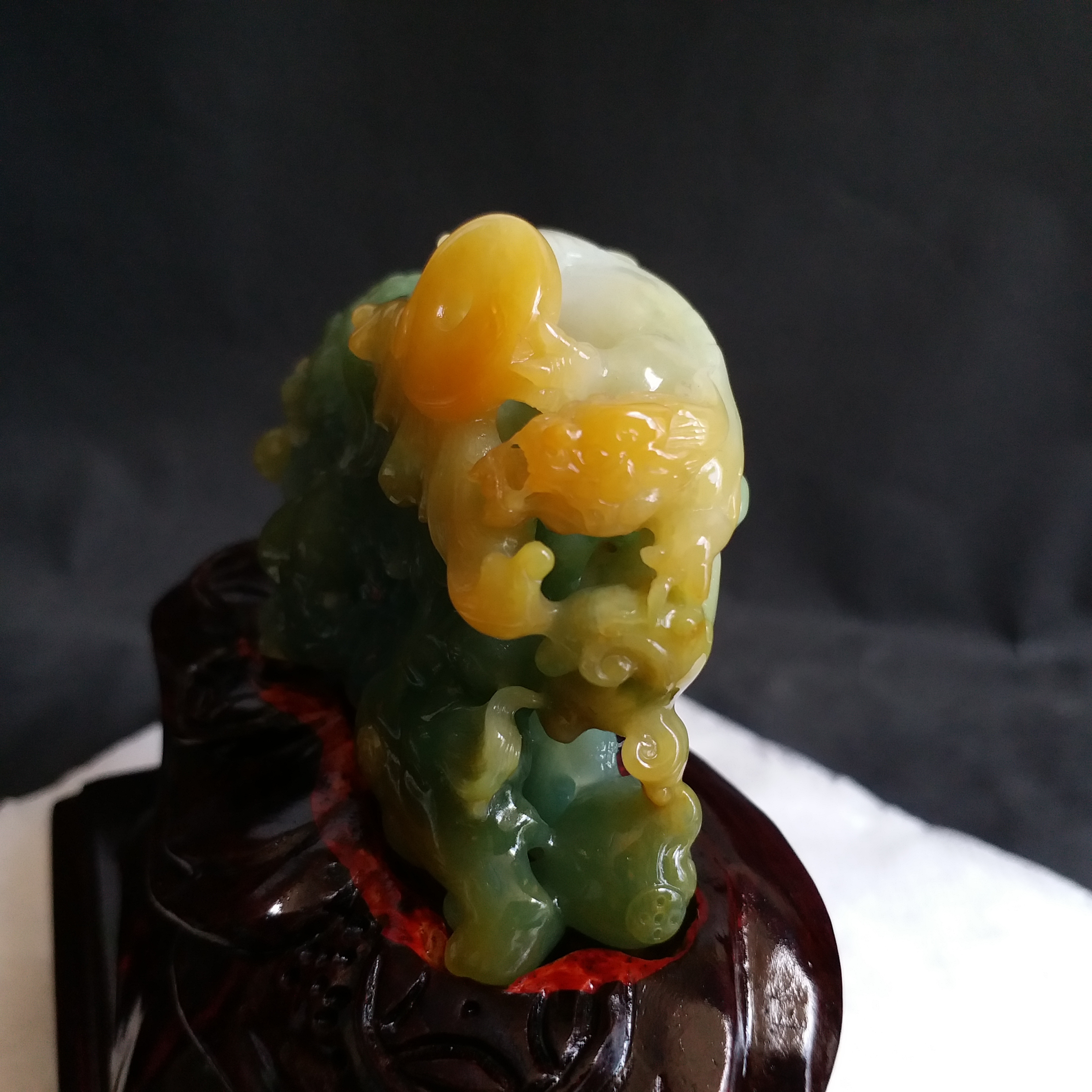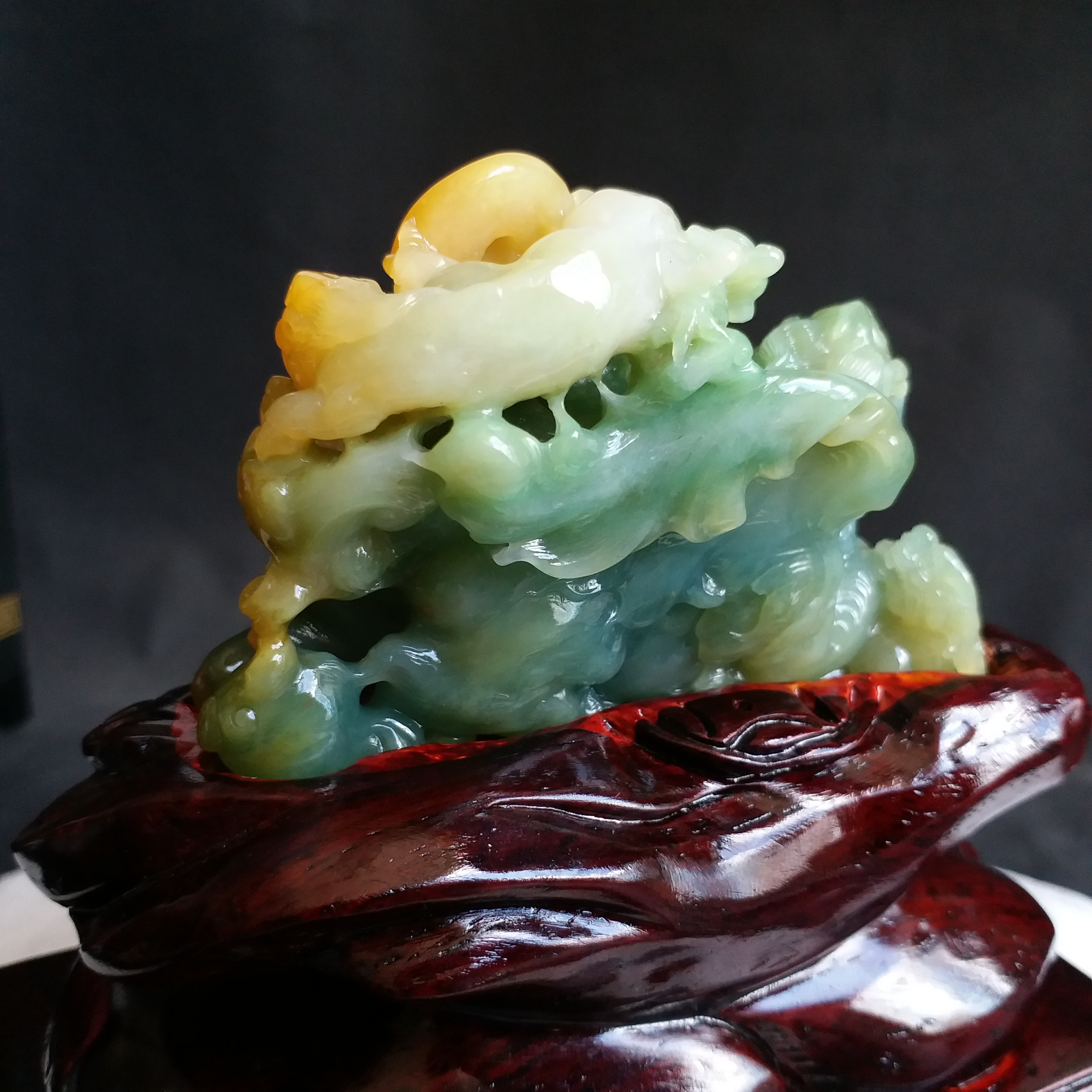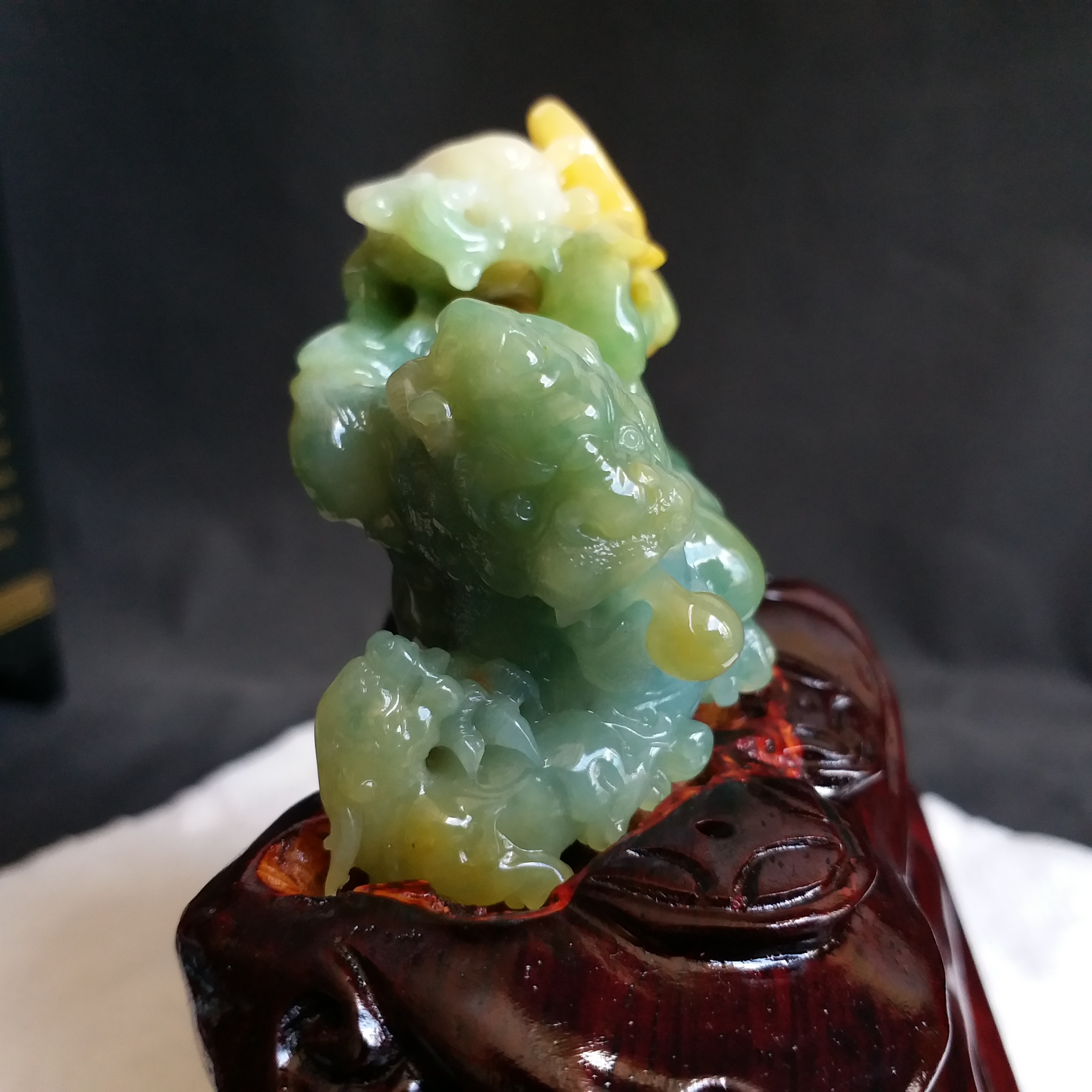 天然翡翠A玉,三彩,小擺件,種水足,水潤,大師級全手工精雕,完美無紋裂,附檀木木座
