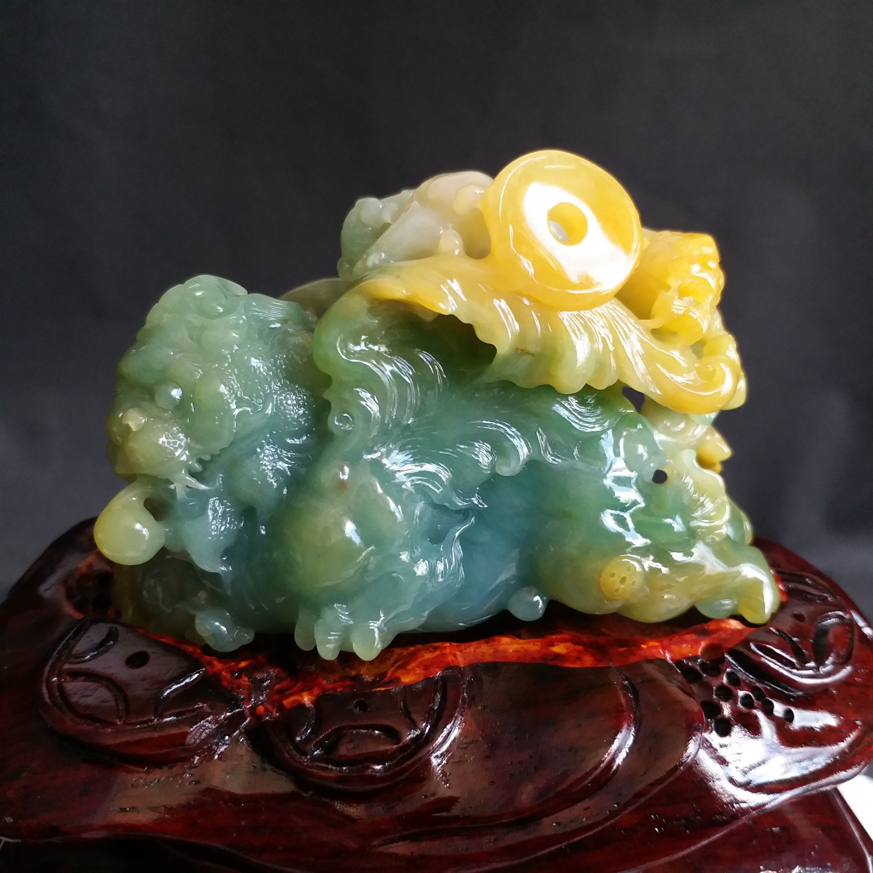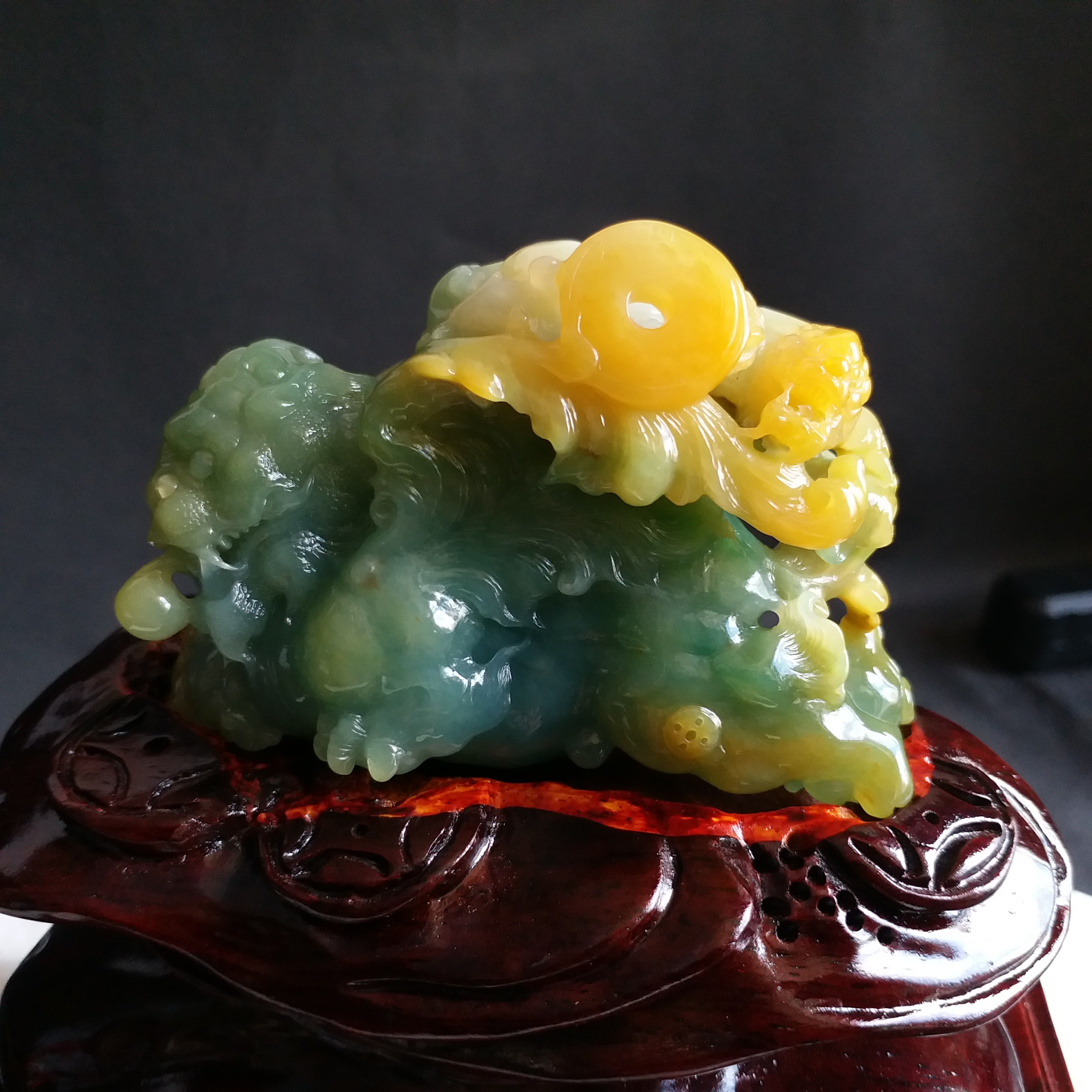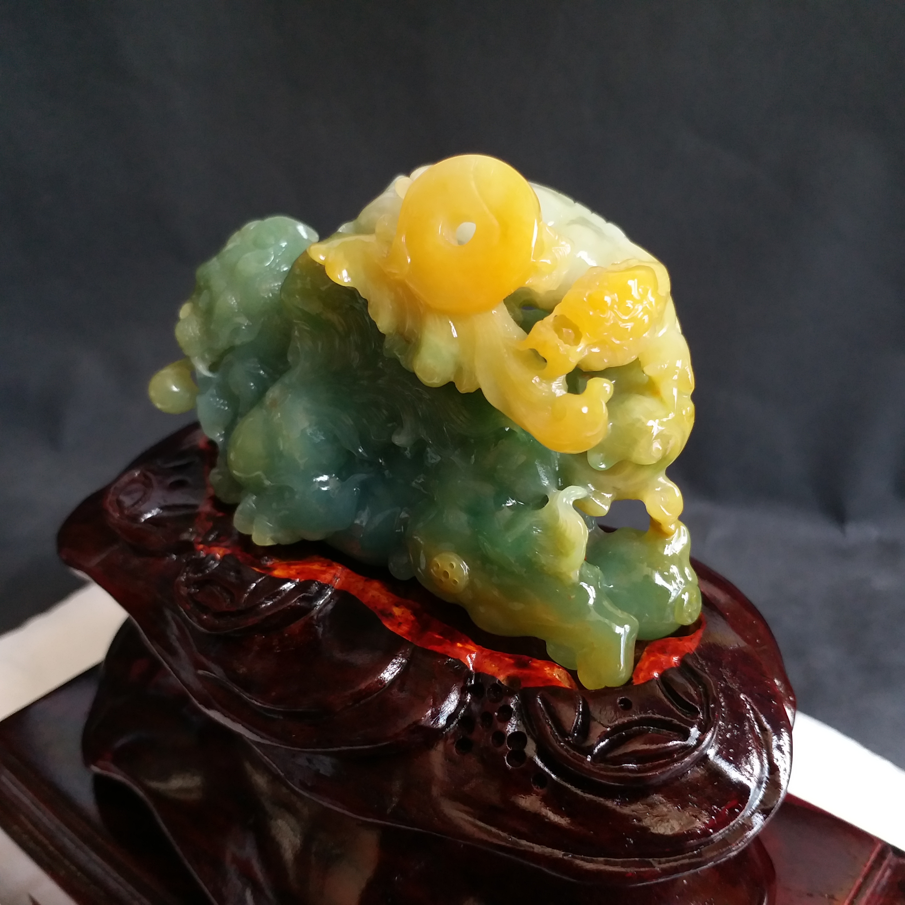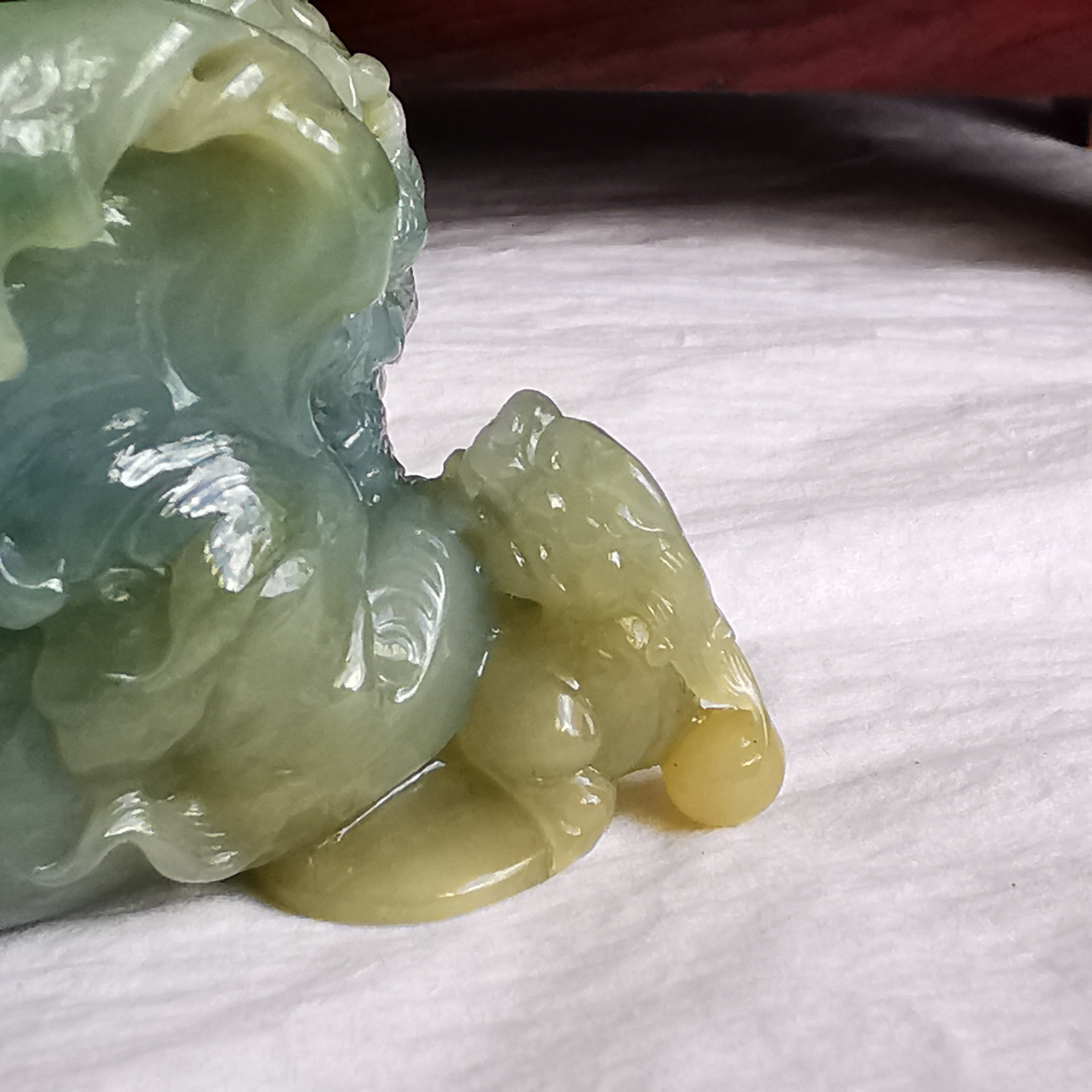 天然翡翠A玉,三彩,小擺件,種水足,水潤,大師級全手工精雕,完美無紋裂,附檀木木座