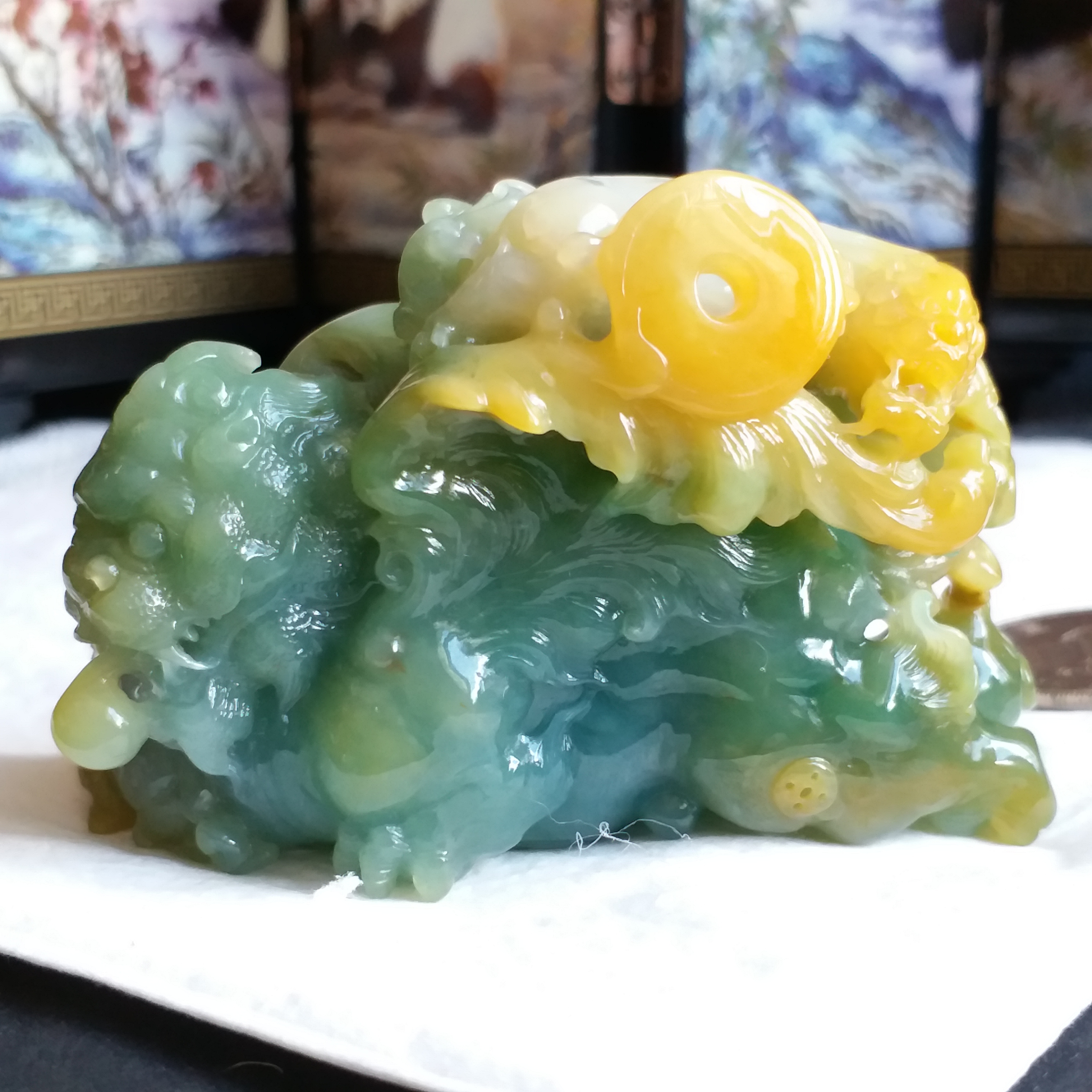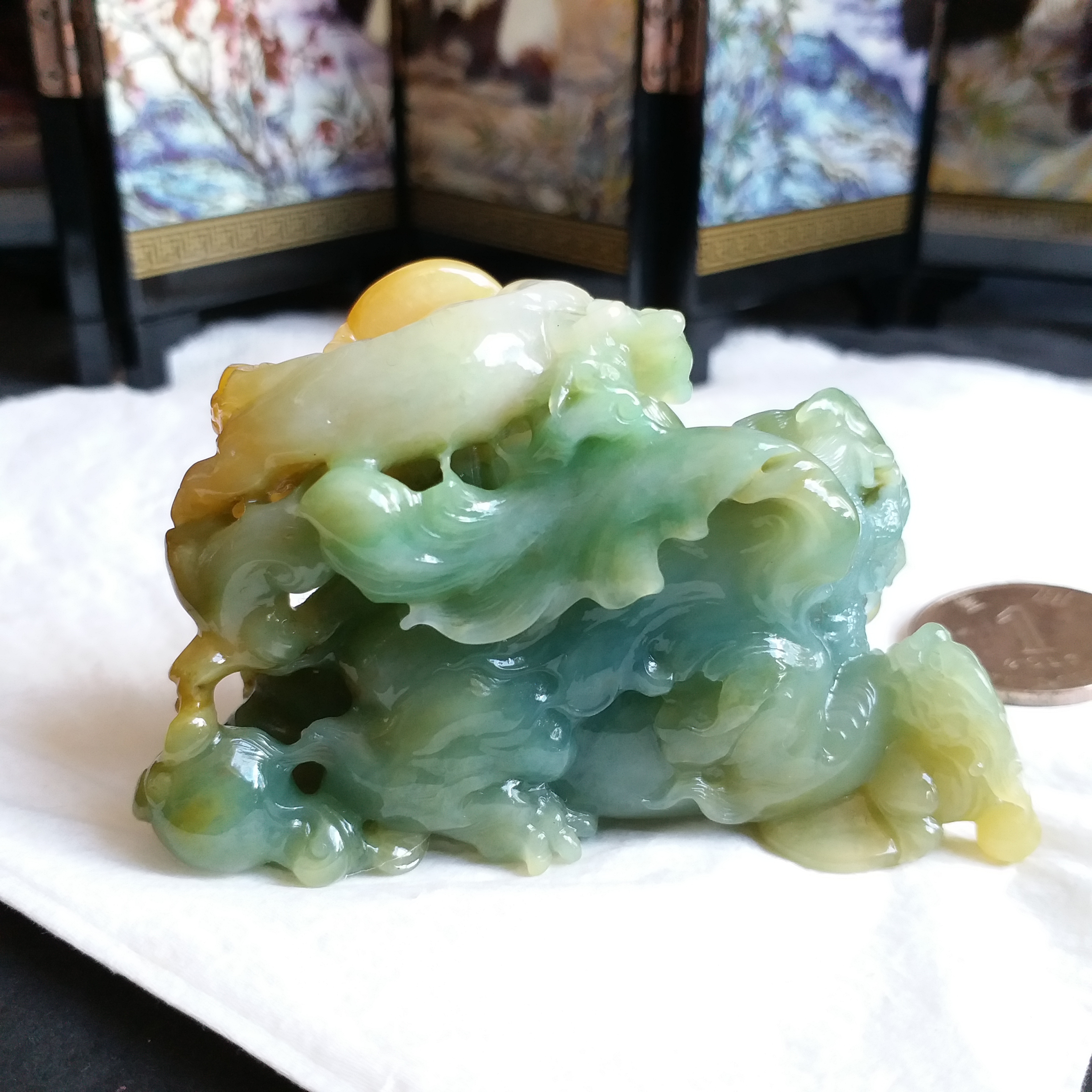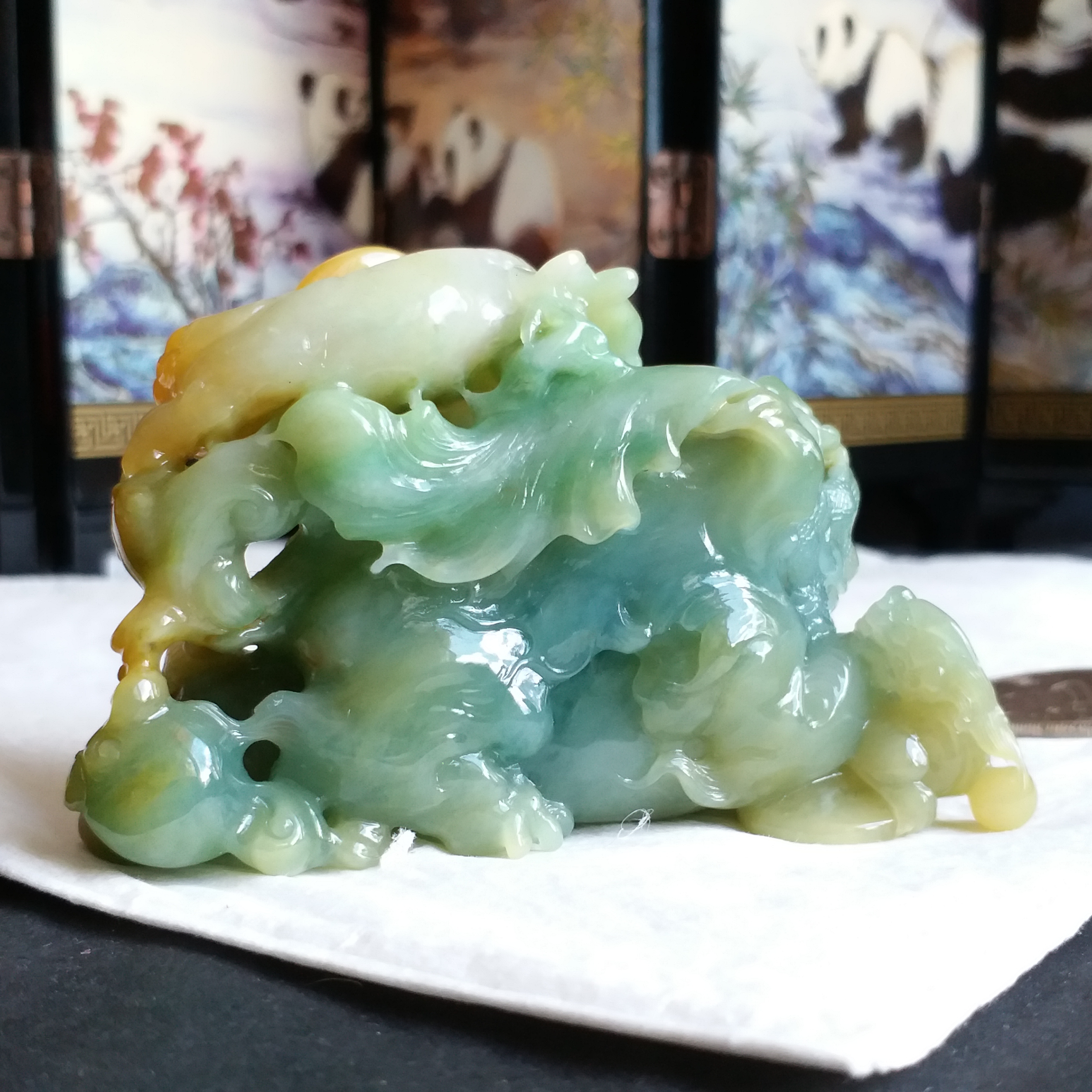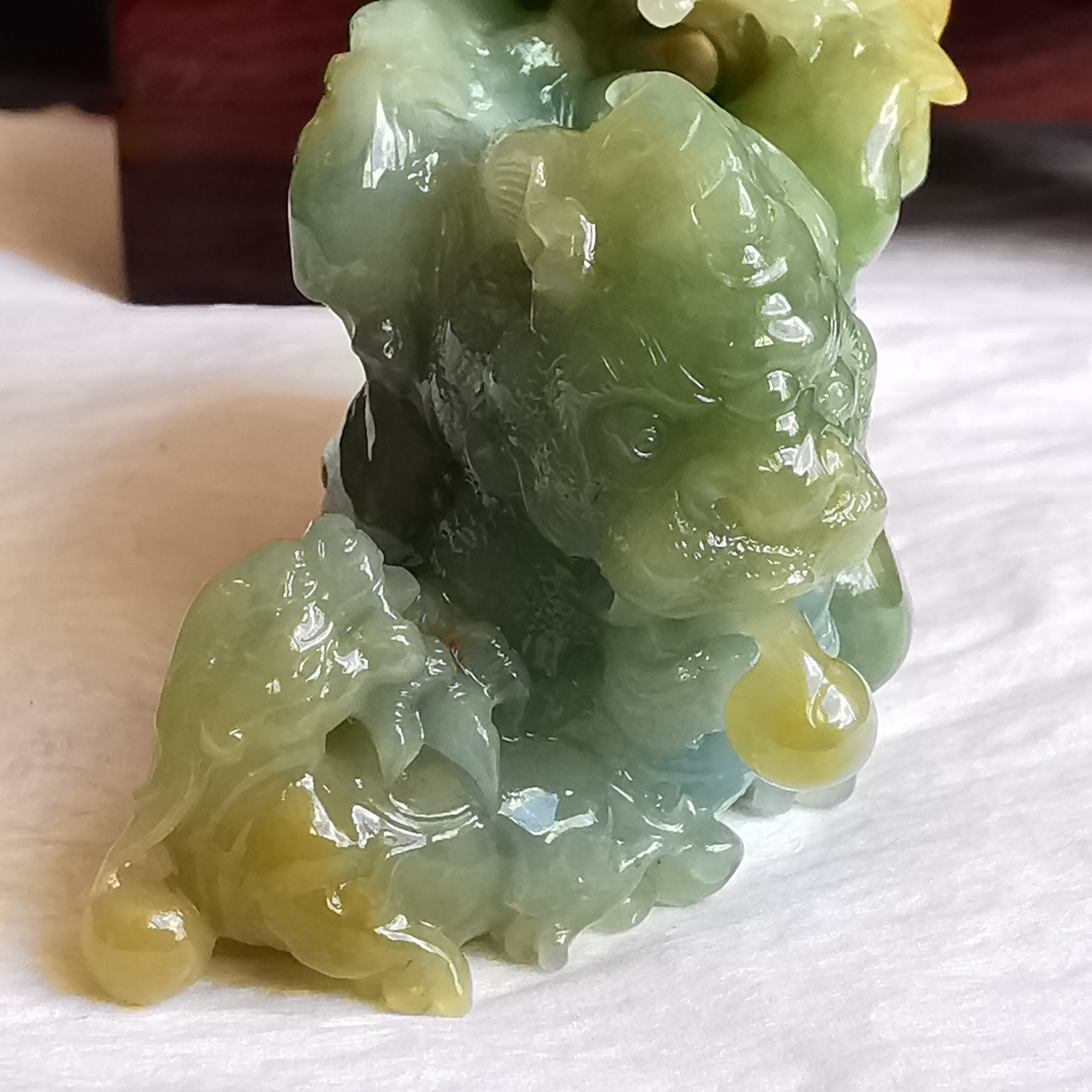 天然翡翠A玉,三彩,小擺件,種水足,水潤,大師級全手工精雕,完美無紋裂,附檀木木座