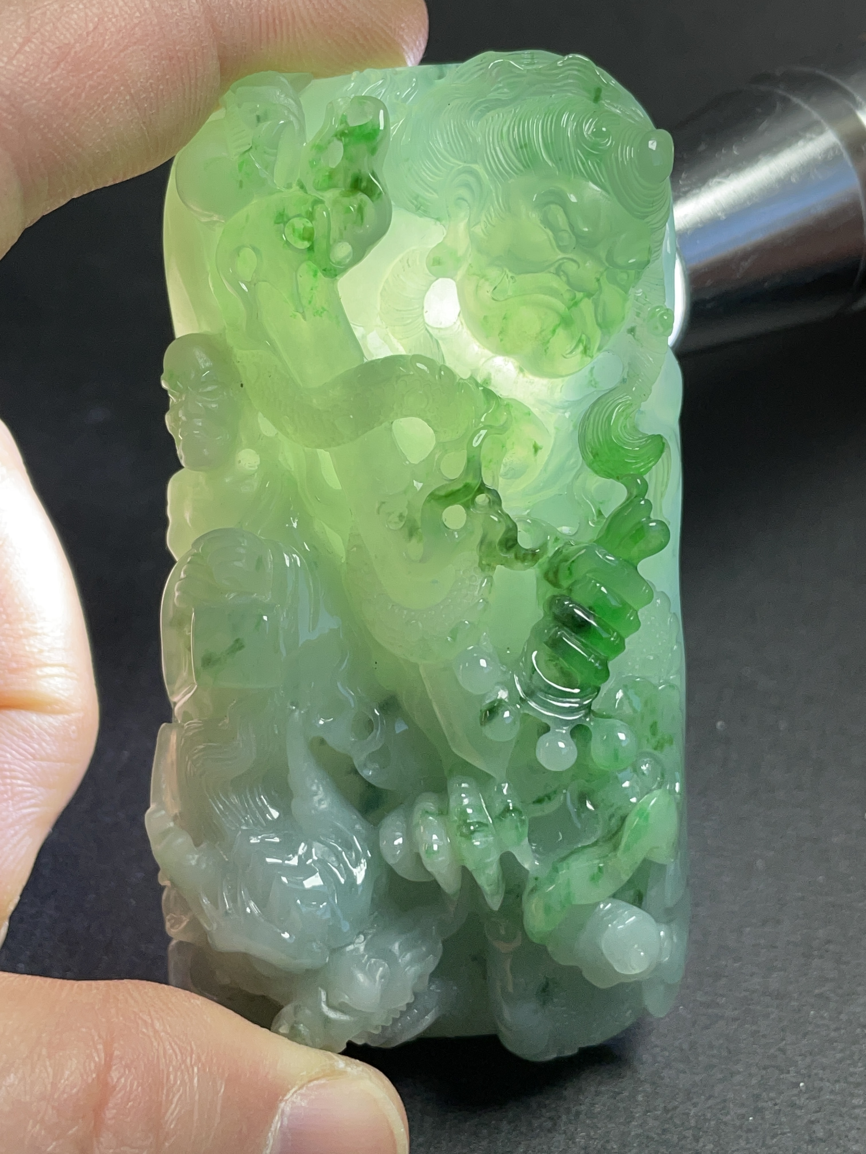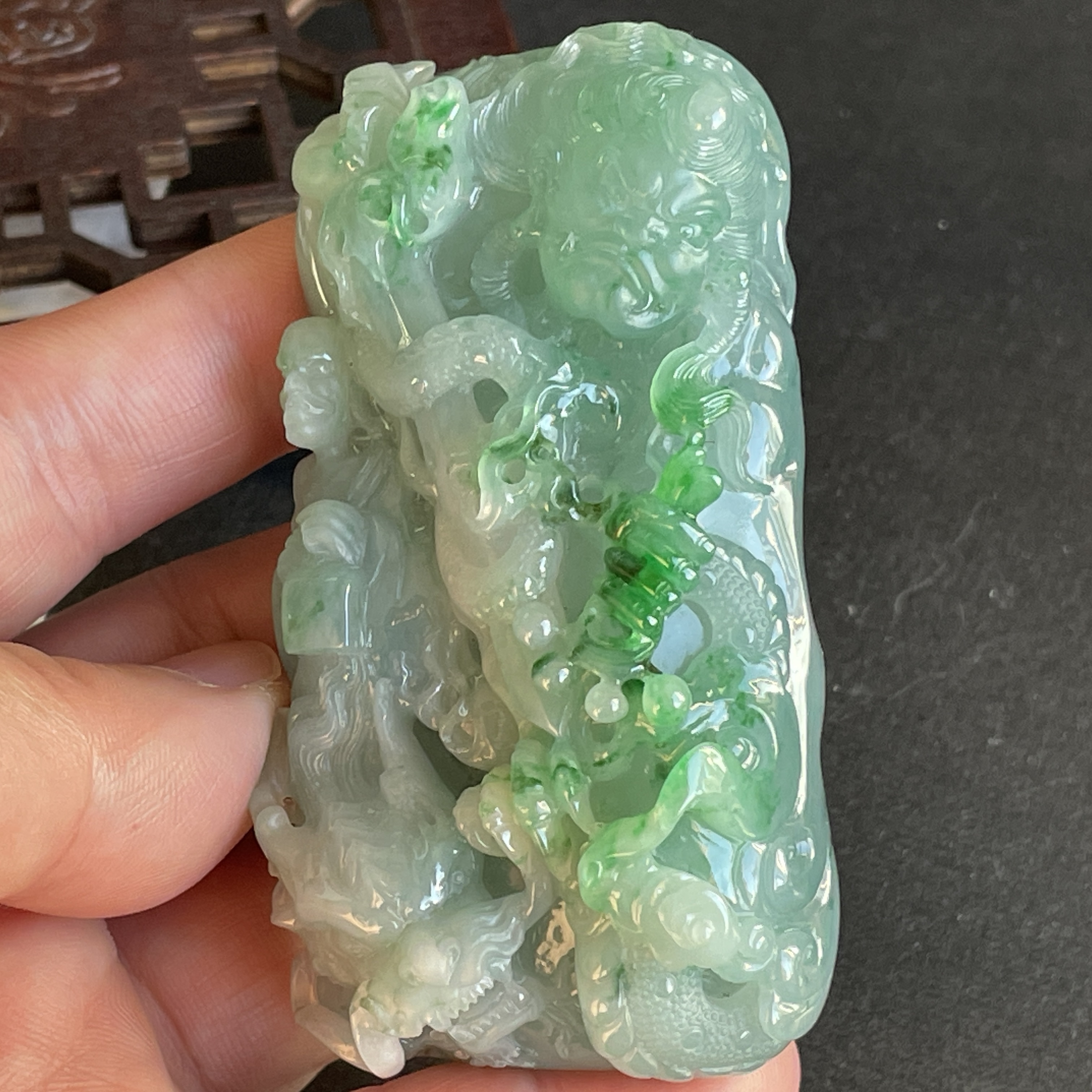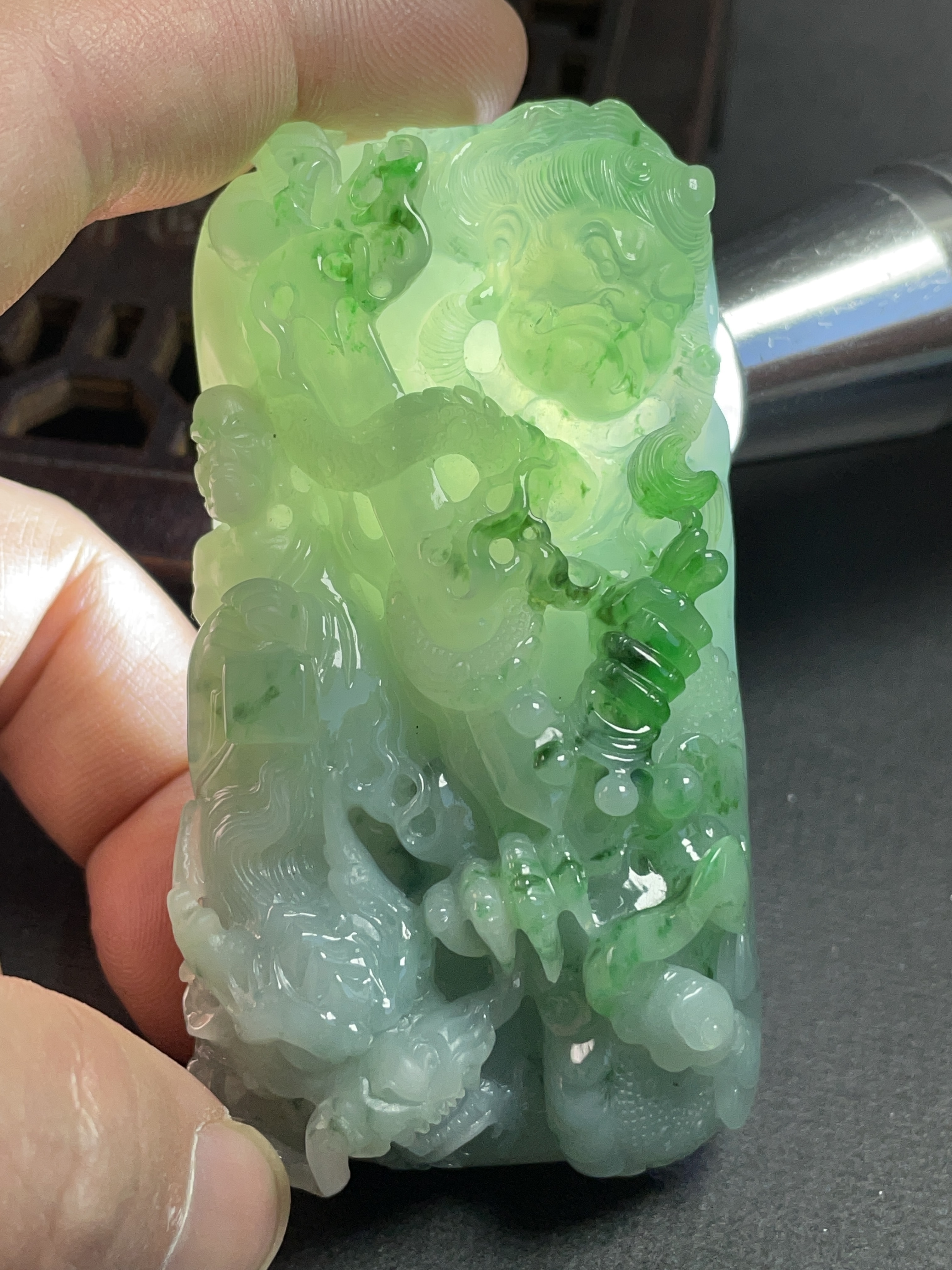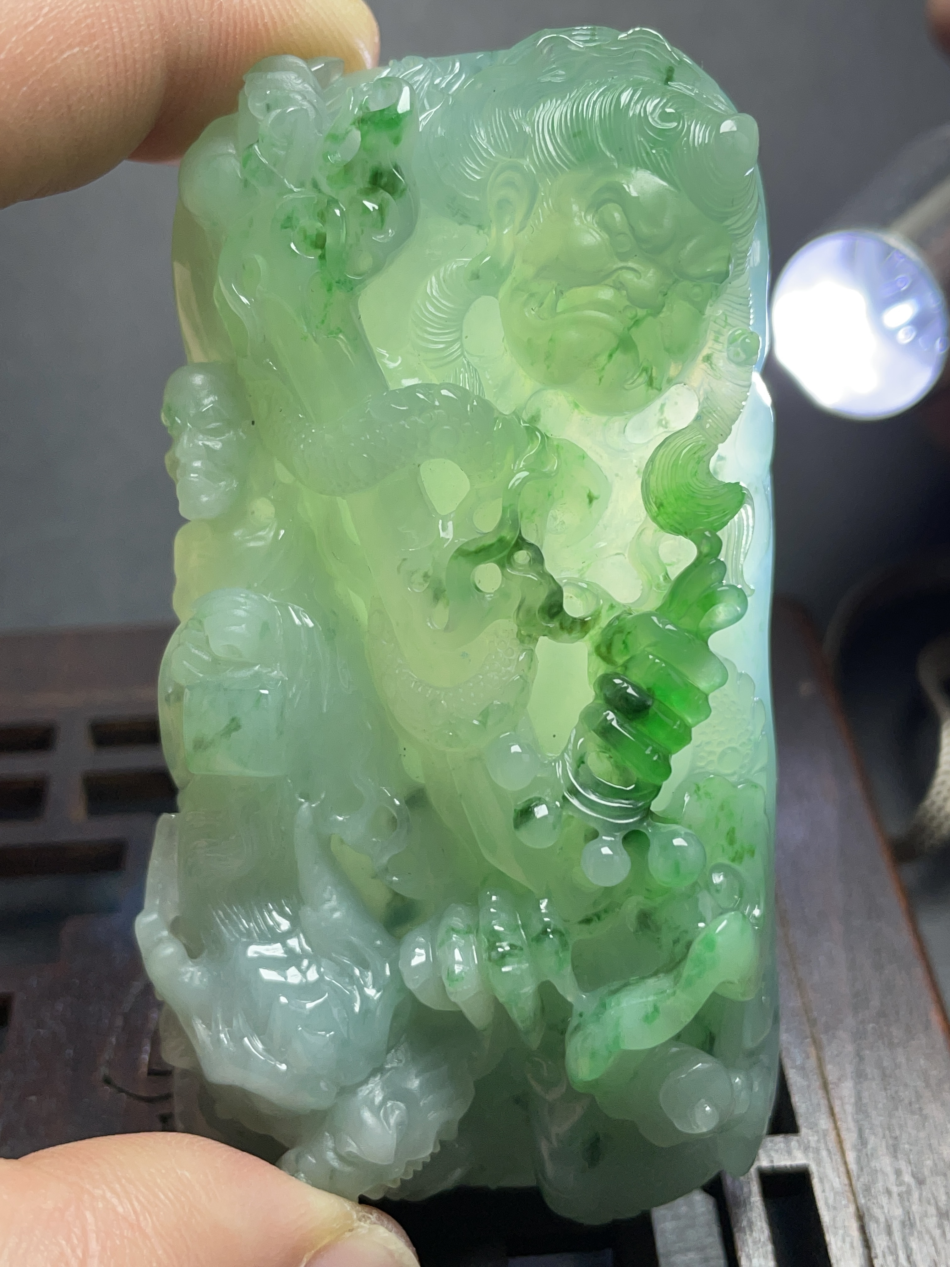 天然翡翠A玉,冰種陽綠,厚庄,種水色俱全,大師級作品,100%大師手工雕工,連檀木木座。完美無紋裂!