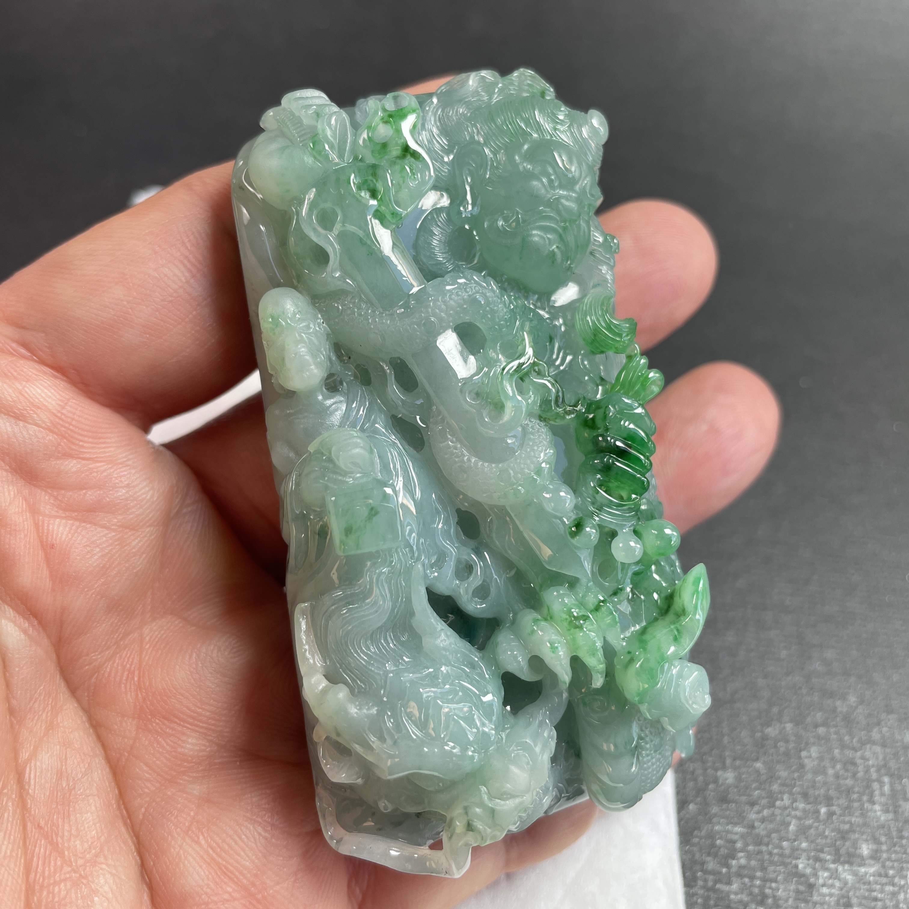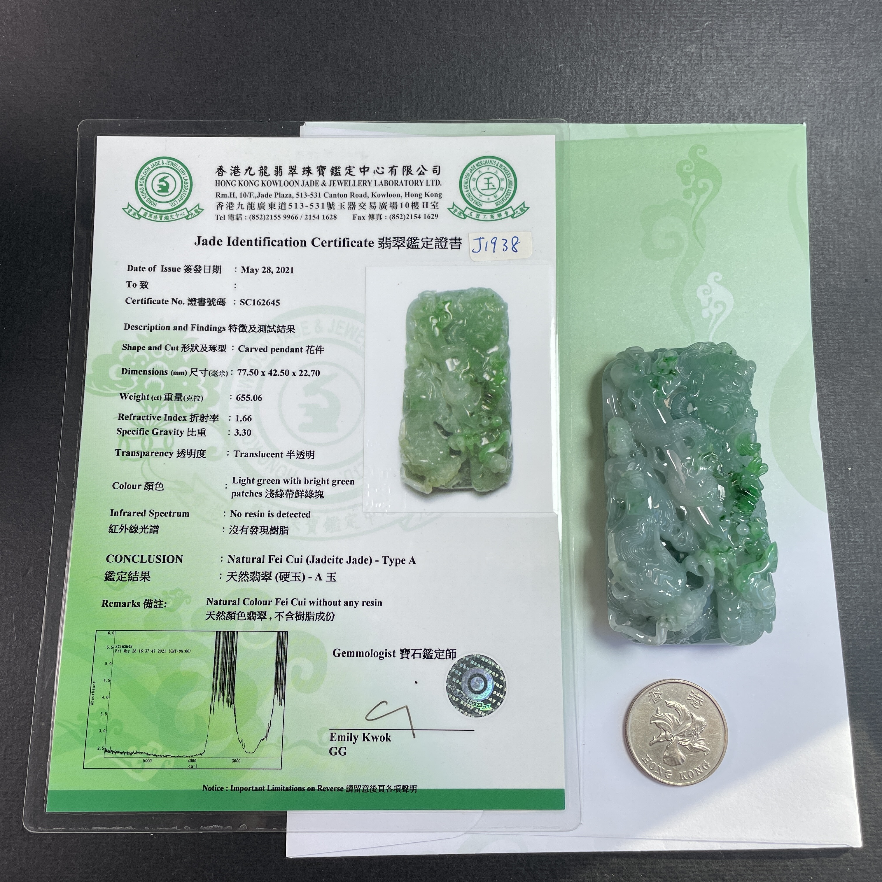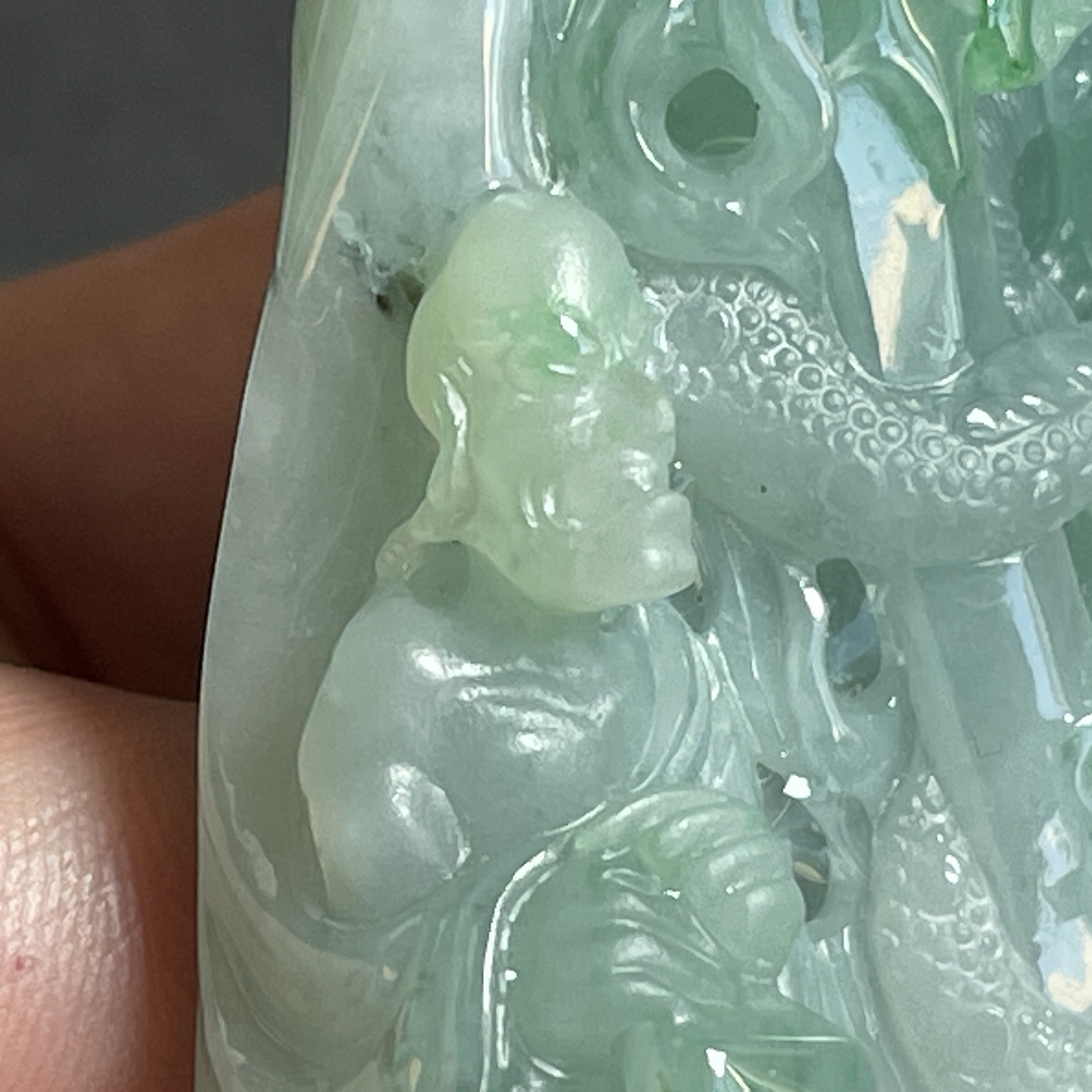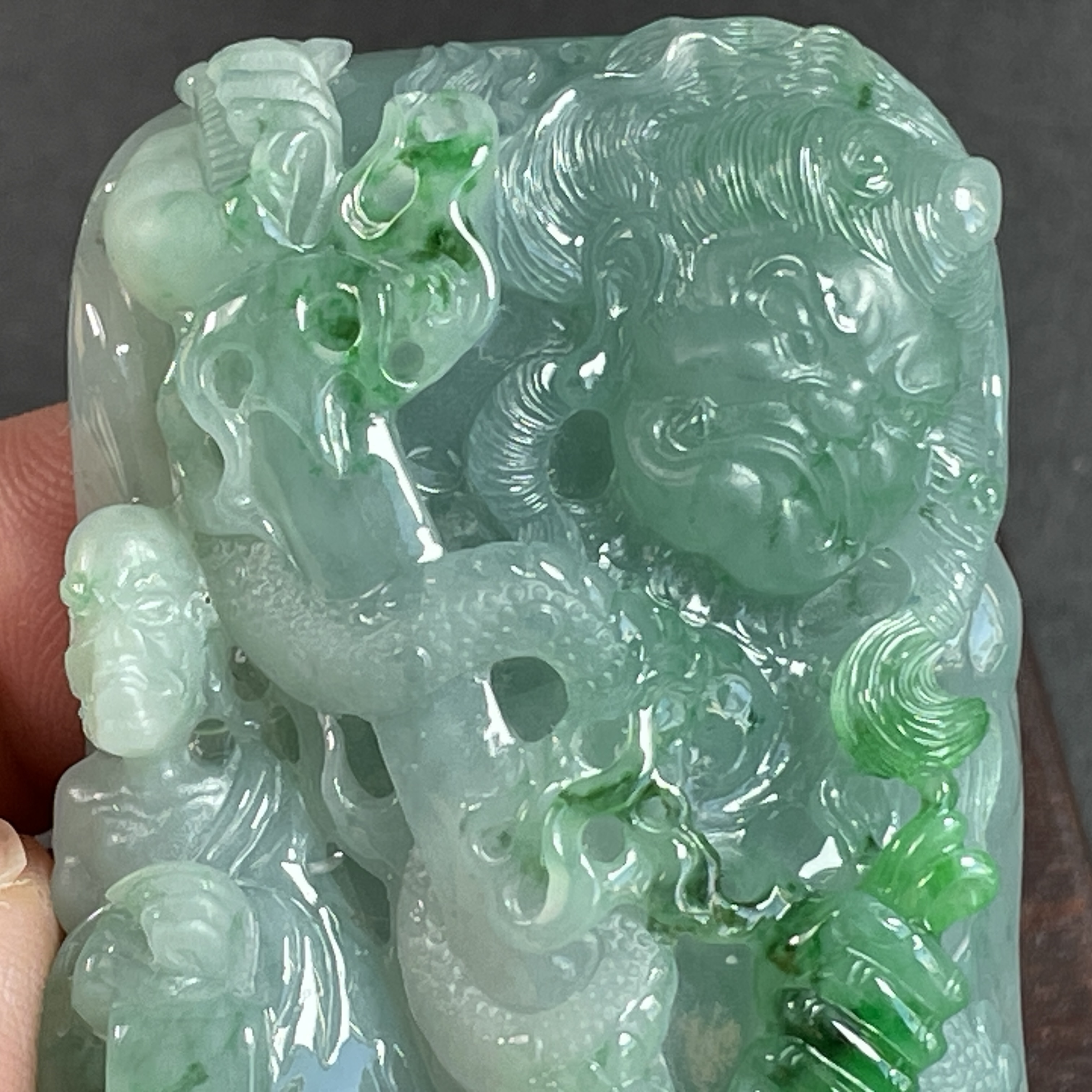 天然翡翠A玉,冰種陽綠,厚庄,種水色俱全,大師級作品,100%大師手工雕工,連檀木木座。完美無紋裂!